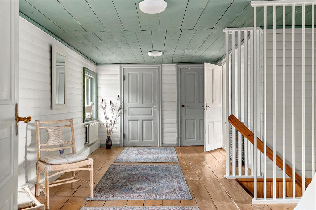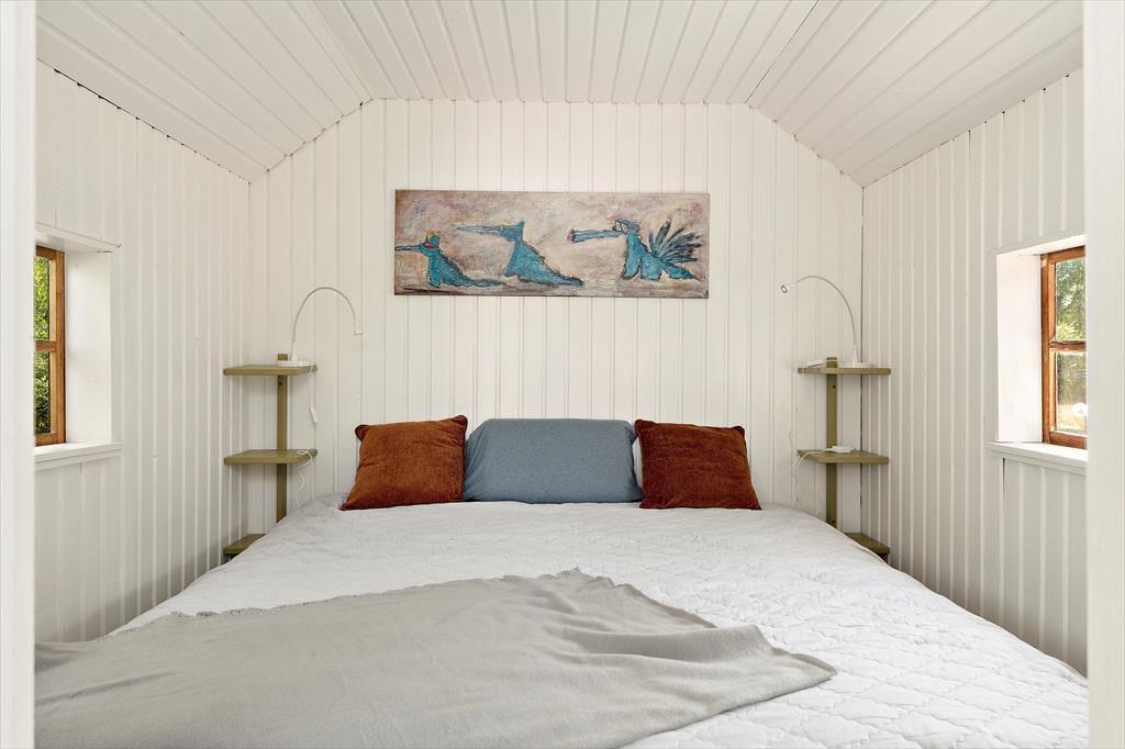 Im Obergeschoss befinden sich die vier Schlafräume und ein Bad mit WC, Handwaschbecken und einem Duschbereich mit zwei Duschen – eine für Erwachsene, eine für Kinder. In dem einen Flügel des Obergeschosses, der durch einen Extraflur abgetrennt ist, liegen zwei Schlafräume mit Doppelbetten, die man getrennt oder zusammenstellen kann. Im anderen Flügel befindet sich neben dem Bad ein Schlafraum mit Doppelbett (Wasserbett, mittelberuhigt) und ein kleineres Zimmer mit einem Einzelbett. Ein Internetzugang steht außerdem zur Verfügung. Zwei weitere Schlafplätze befinden sich in dem kleinen Gästehaus.