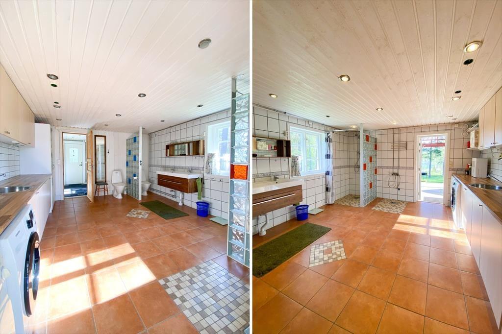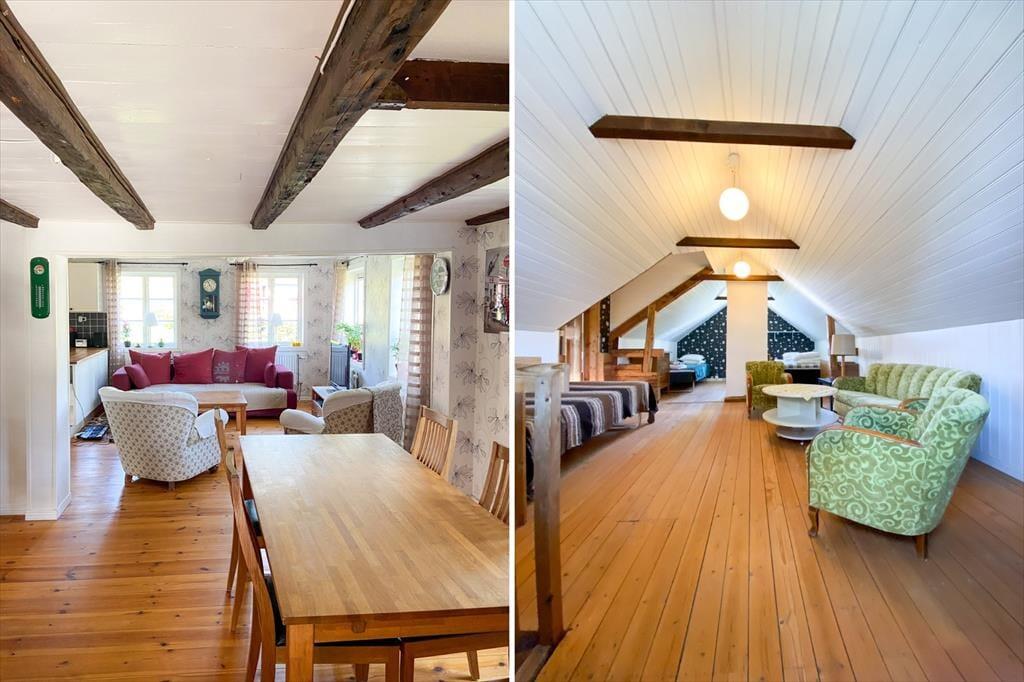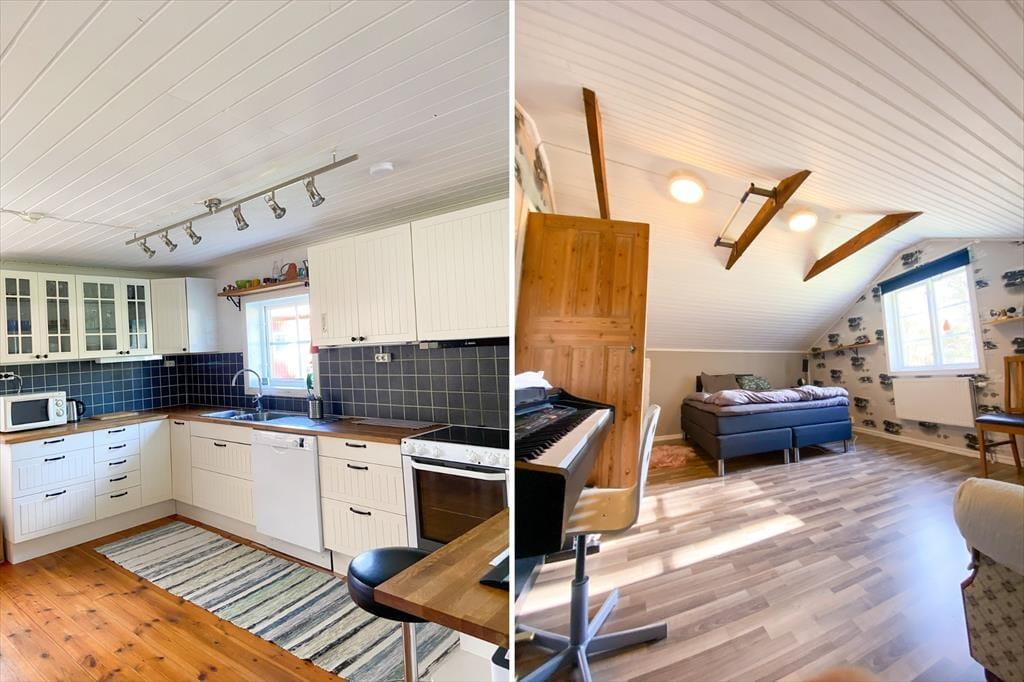 Das im Jahr 1850 errichtete Ferienhaus verfügt über etwa 130 m² große Wohnfläche. Der große Wohnraum im Erdgeschoss bietet eine sehr gut ausgestattete Wohnküche mit E-Herd, Backofen, Holzofen, Kühl- und Gefrierkombination, Geschirrspüler, Mikrowelle, Kaffeemaschine und Esstisch. Eine gemütliche Sitzecke lädt zum Entspannen ein. Der Fernseher bietet schwedische Programme, außerdem gibt es WLAN im Haus. Das geräumige Badezimmer mit zwei Duschen, zwei WCs und Doppelwaschbecken bietet außerdem eine Waschmaschine und einen Trockner. Die Schlafzimmer befinden sich im Dachgeschoss. Im größeren Zimmer stehen drei Einzelbetten und eine Sofagarnitur, und im zweiten Schlafzimmer befindet sich ein bequemes Doppelbett. Der große Wintergarten mit Seeblick verlängert die Sommersaison – der perfekte Ort, um den Morgenkaffee zu genießen.