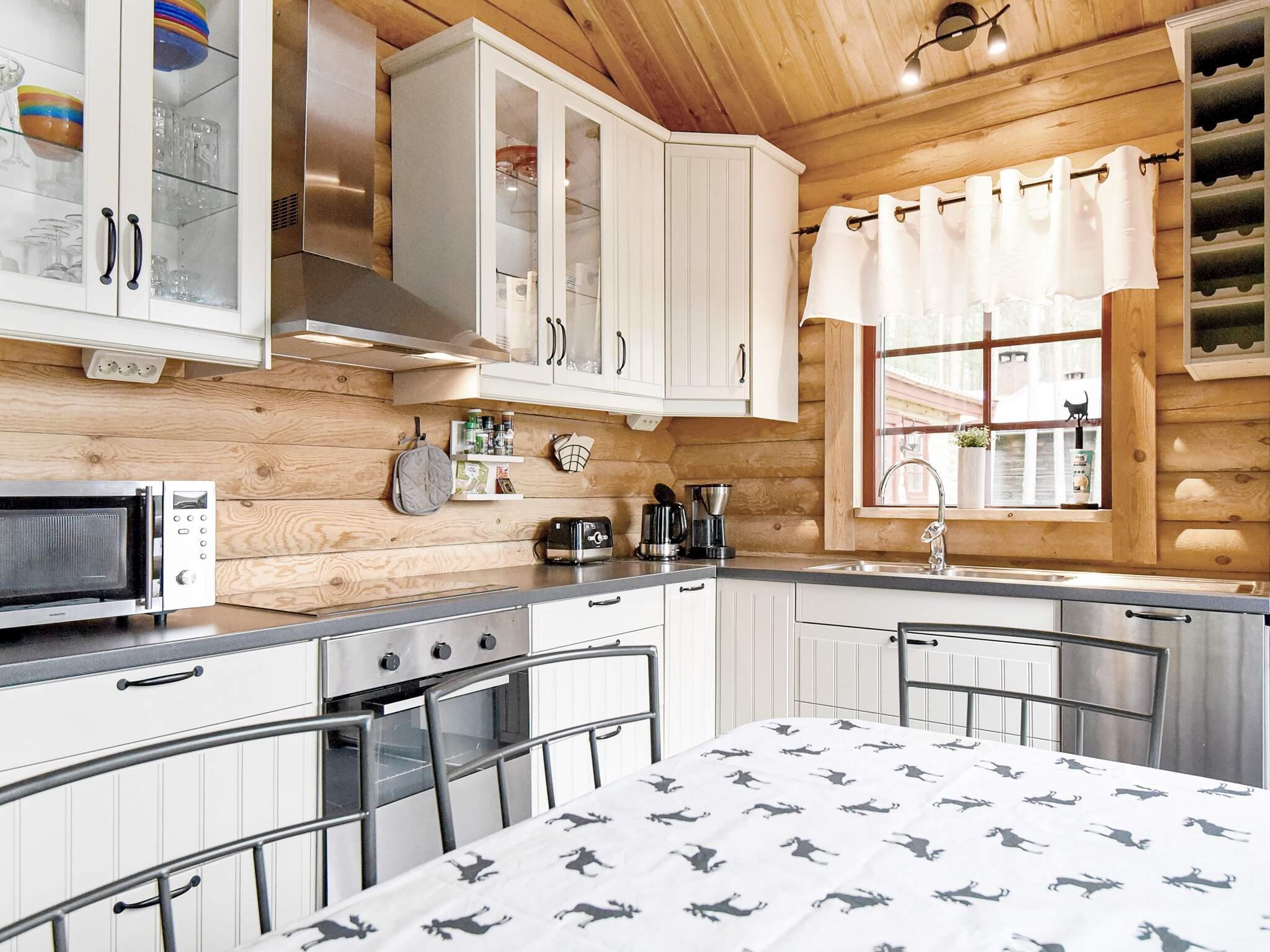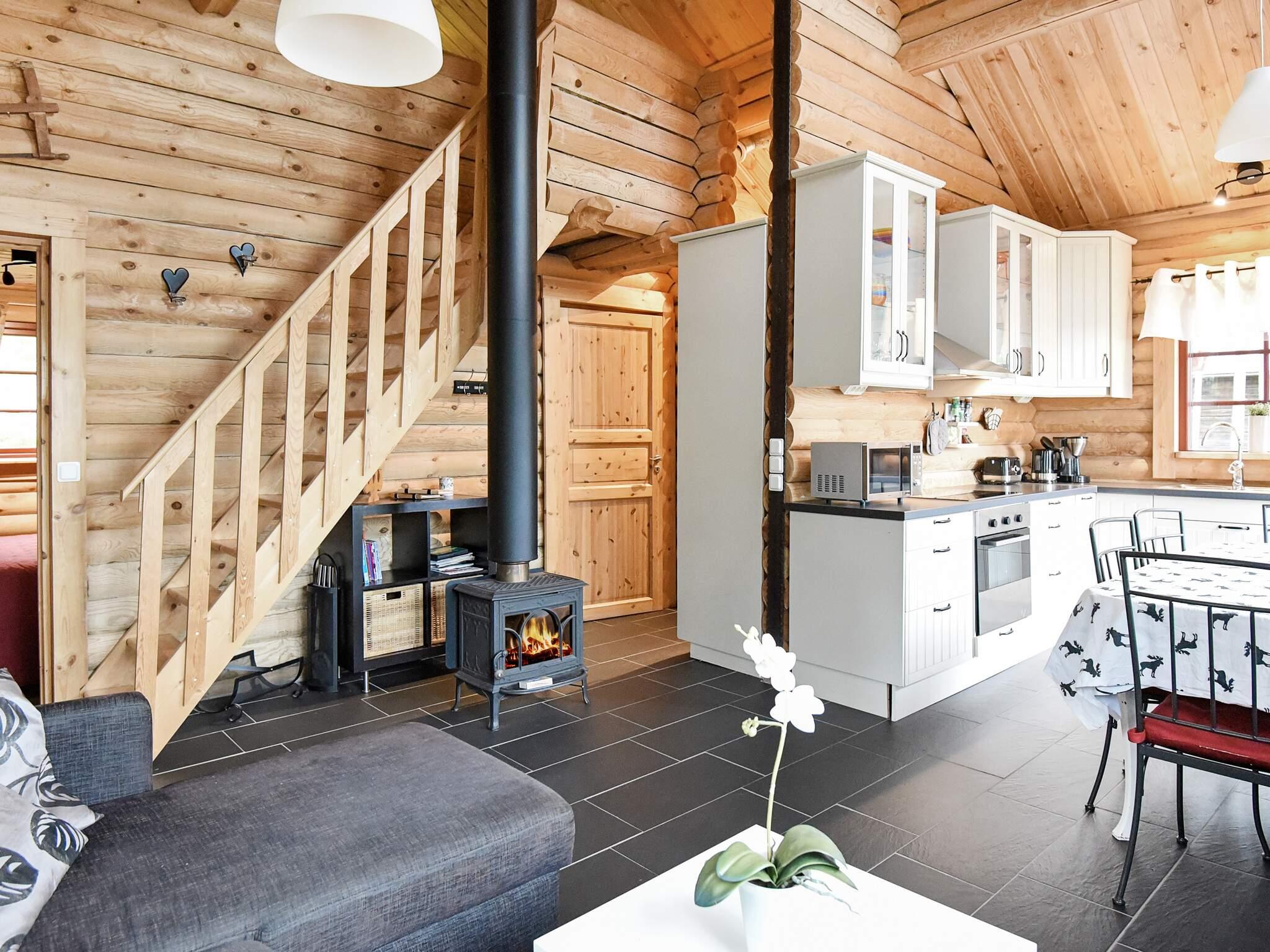 Offener Küchen-/Wohnbereich für das Familienleben mit offener Zimmerdecke bis zum First. Moderne Küchenausstattung mit u.a. Umluftofen, Mikrowelle und Geschirrspüler. Es gibt einen direkten Zugang von der Küche zur Terrasse mit schönem Seeblick. Im Haus zudem ein wärmender Holzofen für kühlere Abende. TV mit rund 40 schwedischen und englischsprachigen Sendern. Gefliestes Badezimmer mit einer Duschkabine. Oben auf dem Hems liegen zwei Federkernmatratzen aus.