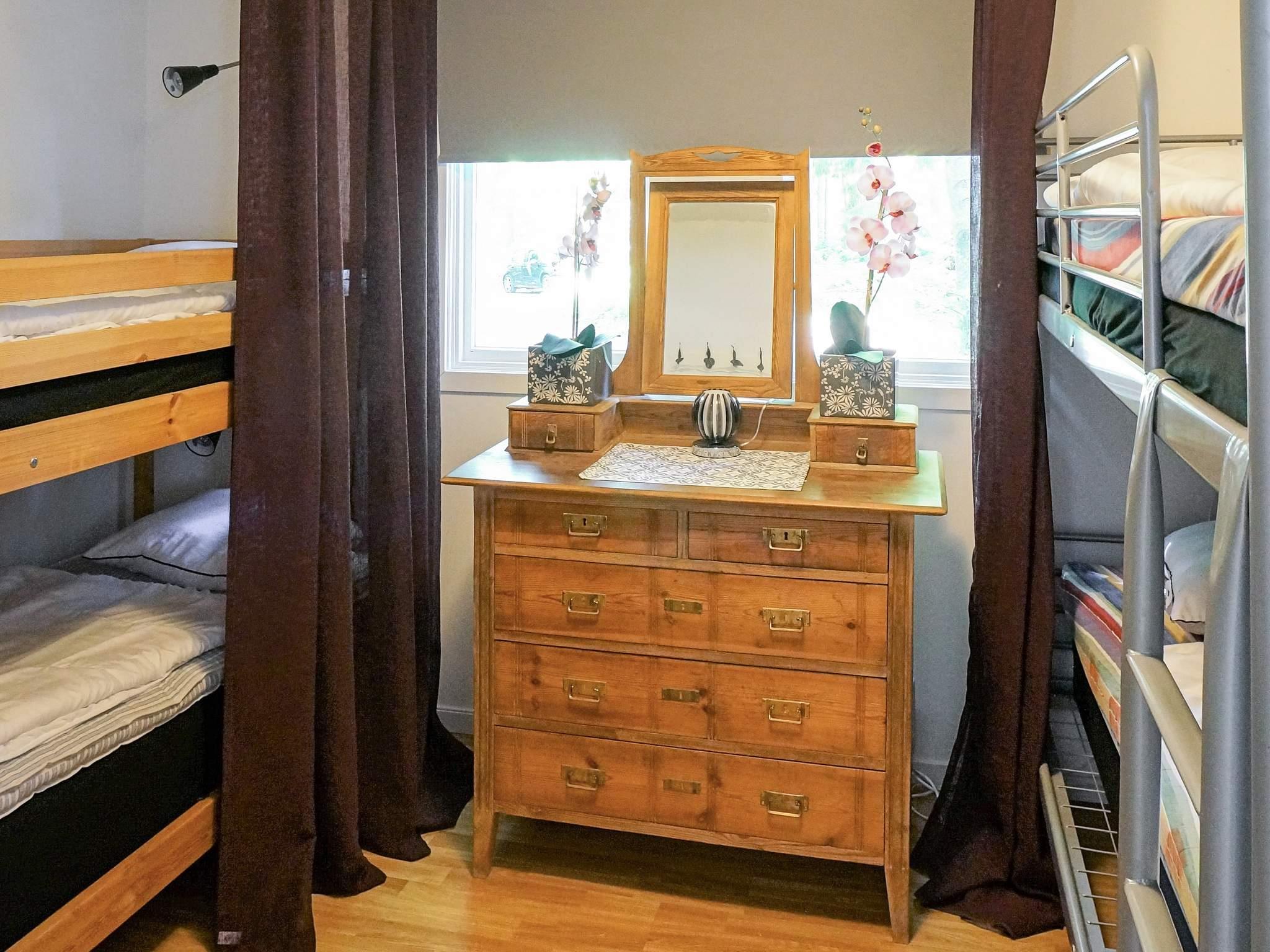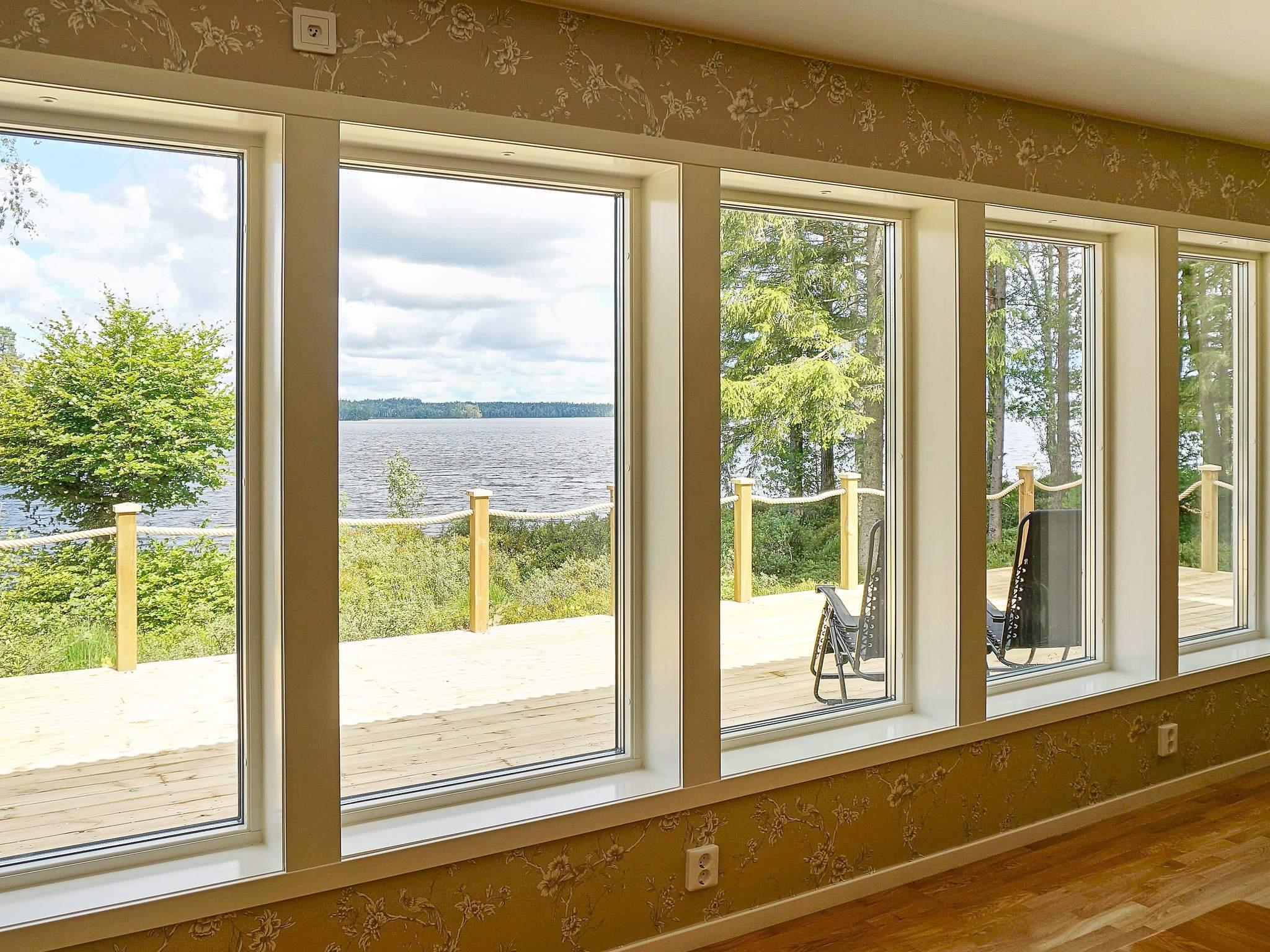 Das Holzhaus wurde 2017 komplett renoviert, zudem erhielt es einen Anbau. Die Fotos hier auf der Seite werden laufend aktualisiert. Rechts vom Eingangbereich findet man das Badezimmer mit Dusche/WC, Waschmaschine und angenehmer Fußbodenheizung. Links liegt die modernisierte Küche mit umfassender Ausstattung. Von der Küche hat man Zugang zu einem Schlafzimmer mit zwei Etagenbetten sowie zum ansprechenden Wohnzimmer mit herrlichem Seeblick durch die große Fensterpartie. Im Wohnbereich bequeme Sitzecke, inklusive doppelter Schlafcouch, und Kamin für kühlere Abende. Zutritt zur Verandafläche davor, die das Haus fast komplett umschließt. Ein kleinerer Teil der Veranda ist überdacht, dort steht ein Außen-Kamin zur Verfügung, vor dem man es sich z.B. abends gemütlich machen und nächtliche Stille ringsum genießen kann.