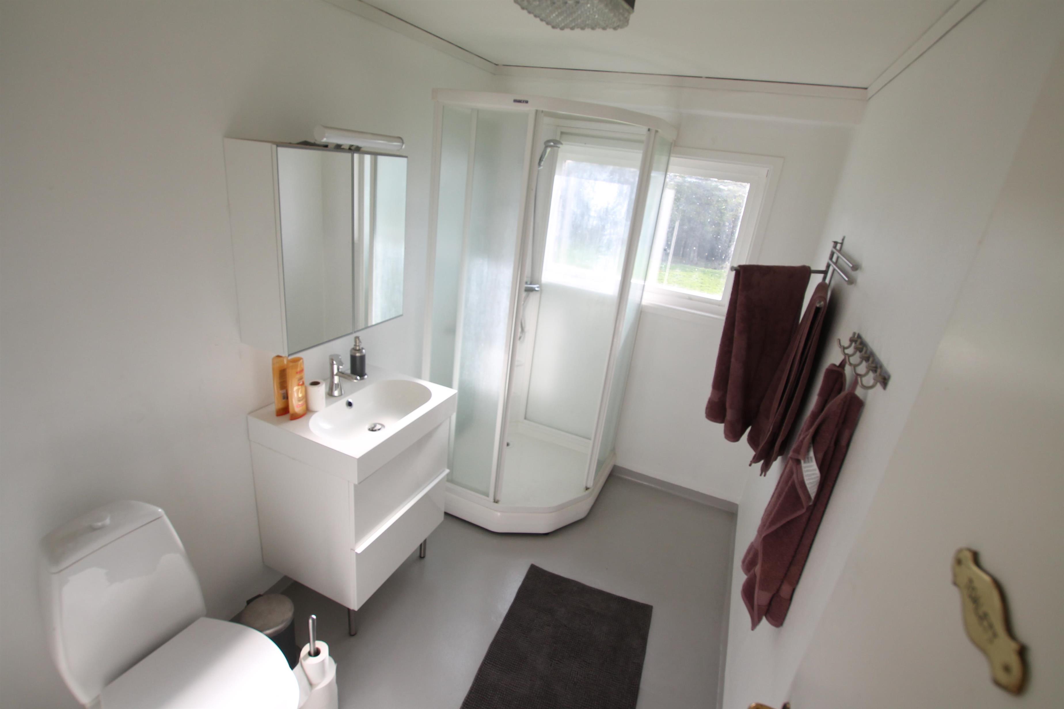 Das Ferienhaus verfügt über ein großes Badezimmer mit WC und Dusche sowie eine Gästetoilette mit Waschbecken.
