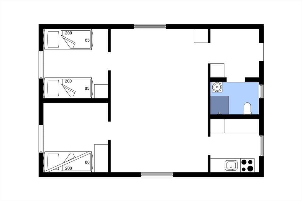 Auf einer Wohnfläche von etwa 64 m² bietet dieses gemütliche Blockhaus seinen Gästen ein großes Wohnzimmer mit Sitz- und Essecke, Kaminofen, Luft-Wärmepumpe, deutsches Sat-TV sowie zwei Schlafzimmer, eines davon mit Etagenbett, das andere mit zwei Einzelbetten möbliert. Das Sofa im Wohnzimmer kann als Schlafsofa für zwei Personen genutzt werden. Die Küche ist mit Kühl- und Gefrierschrank, Mikrowelle sowie mit Elektroherd mit Backofen ausgestattet. Das Haus hat ferner ein Duschbad mit WC und Waschmaschine und selbstverständlich fließend kaltes und warmes Wasser aus eigenem Tiefbrunnen. Es kann mit Kaminofen oder einer Wärmepumpe beheizt werden. Darüber hinaus gibt es eine Veranda mit Gartenmöbeln samt Grill. Zwei Fahrräder sowie ein Ruderboot stehen den Gästen zur alleinigen Nutzung ebenfalls zur Verfügung; Schwimmwesten sind vorhanden. Seit Sommer 2020 stehen im Garten für die kleinen Gäste eine Schaukel und eine Kinderseilbahn zur Verfügung.