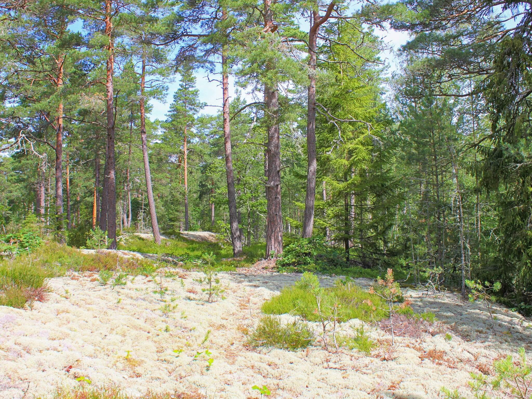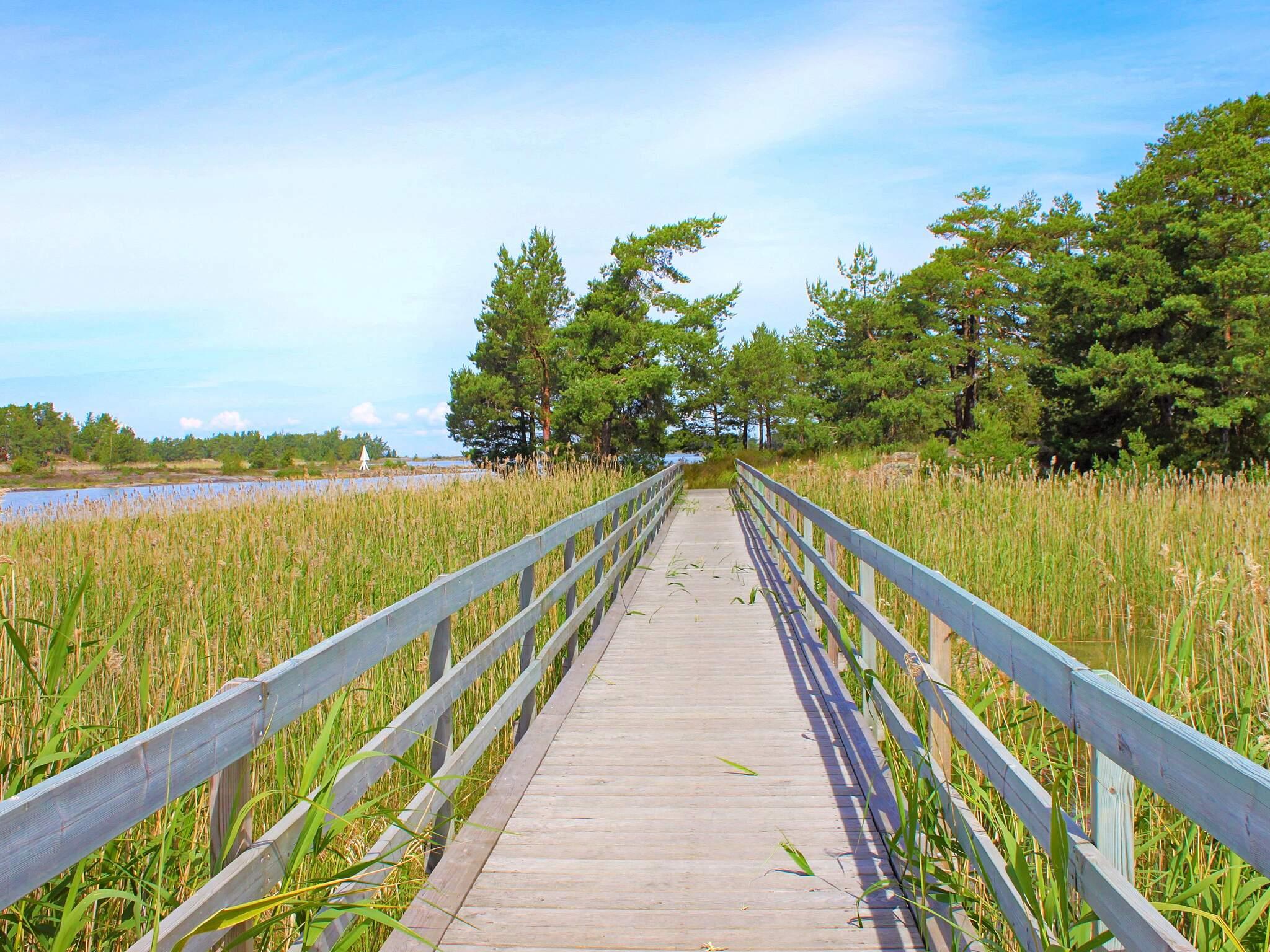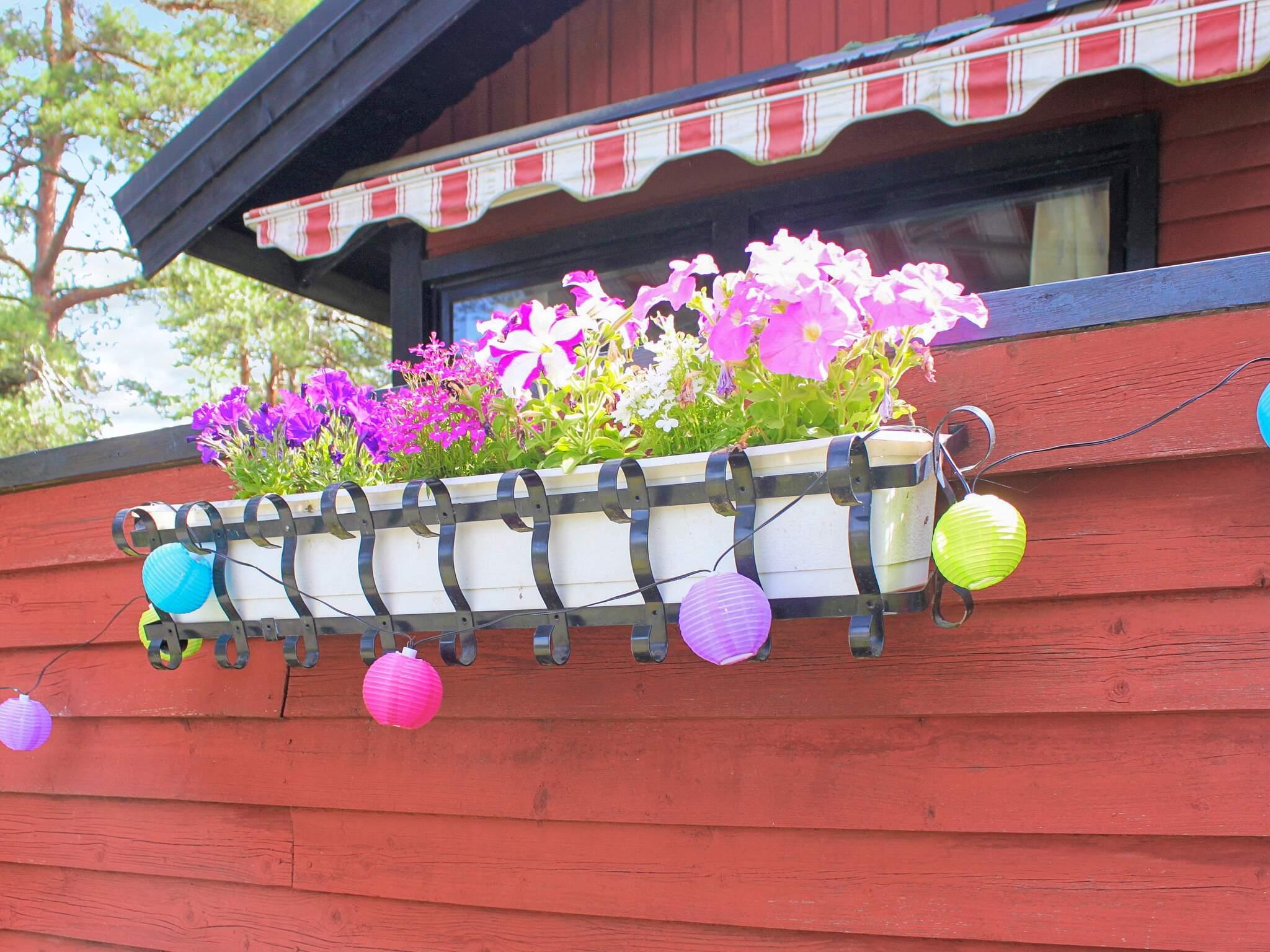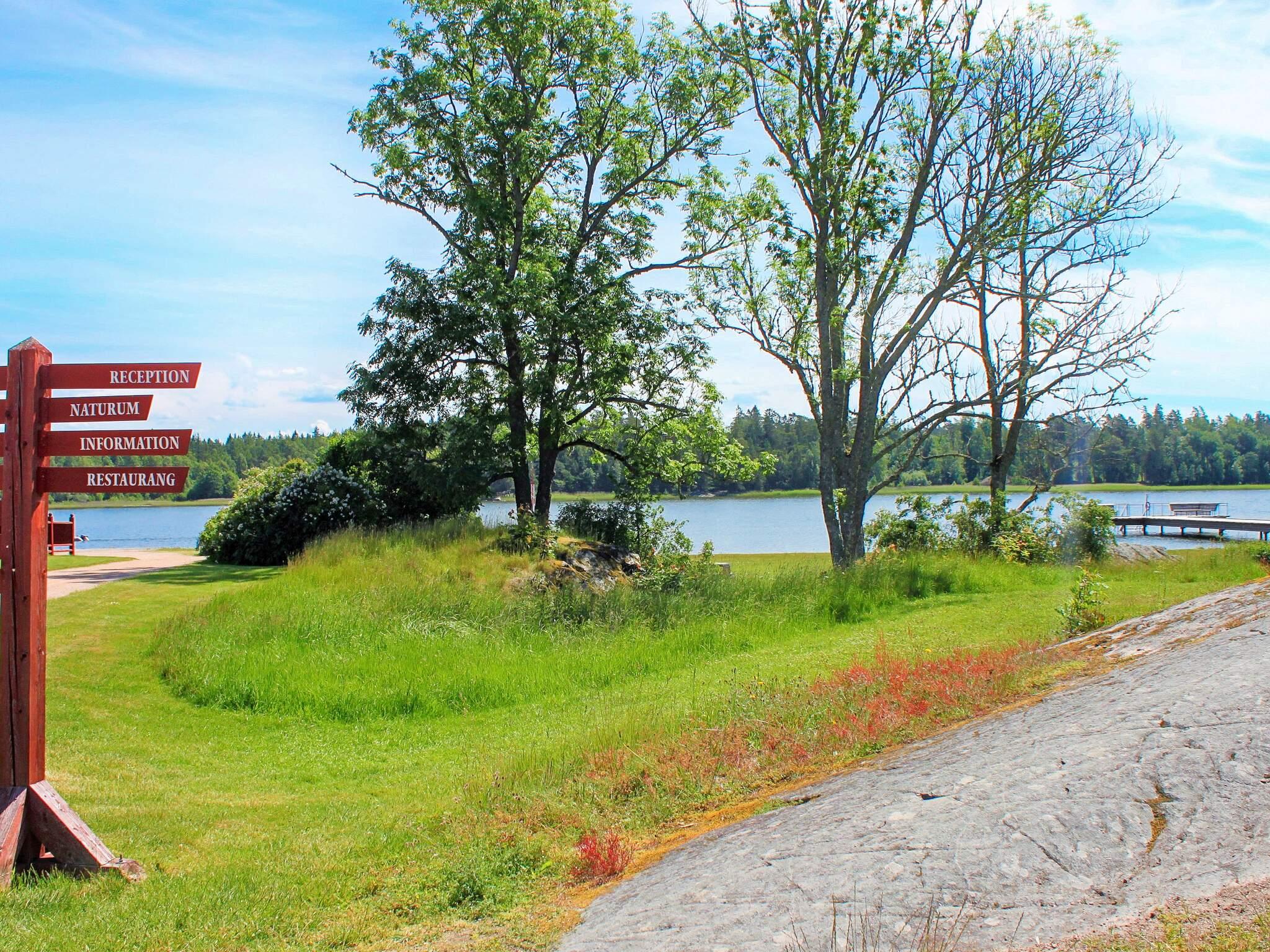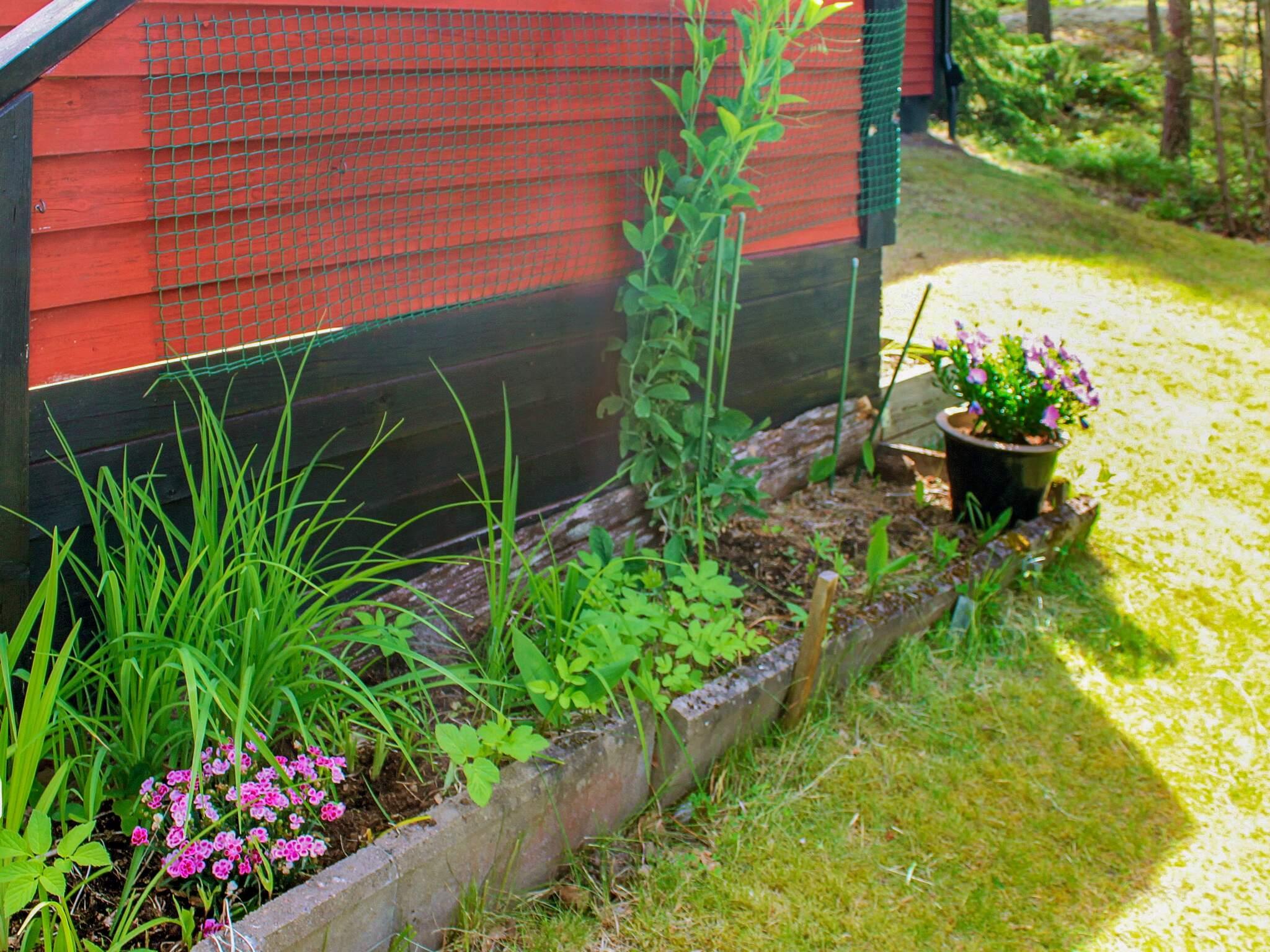 Hinter dem Haus steht ein kleinerer, separater Annex mit zwei weiteren Schlafplätzen innen und eigener, kleiner Veranda davor. Das Ferienhaus steht in einem ruhigen Ferienhausgebiet am Wald. Zwischen der Hauswand und einem gegenüber liegenden, weißen Haus führt ein kleiner Pfad hinunter zum Badeufer des Ferienhausgebietes. Man geht etwa 10 Minuten dorthin und findet dann einen Badesteg, ein kleines Strandufer sowie einige Grillmöglichkeiten vor.