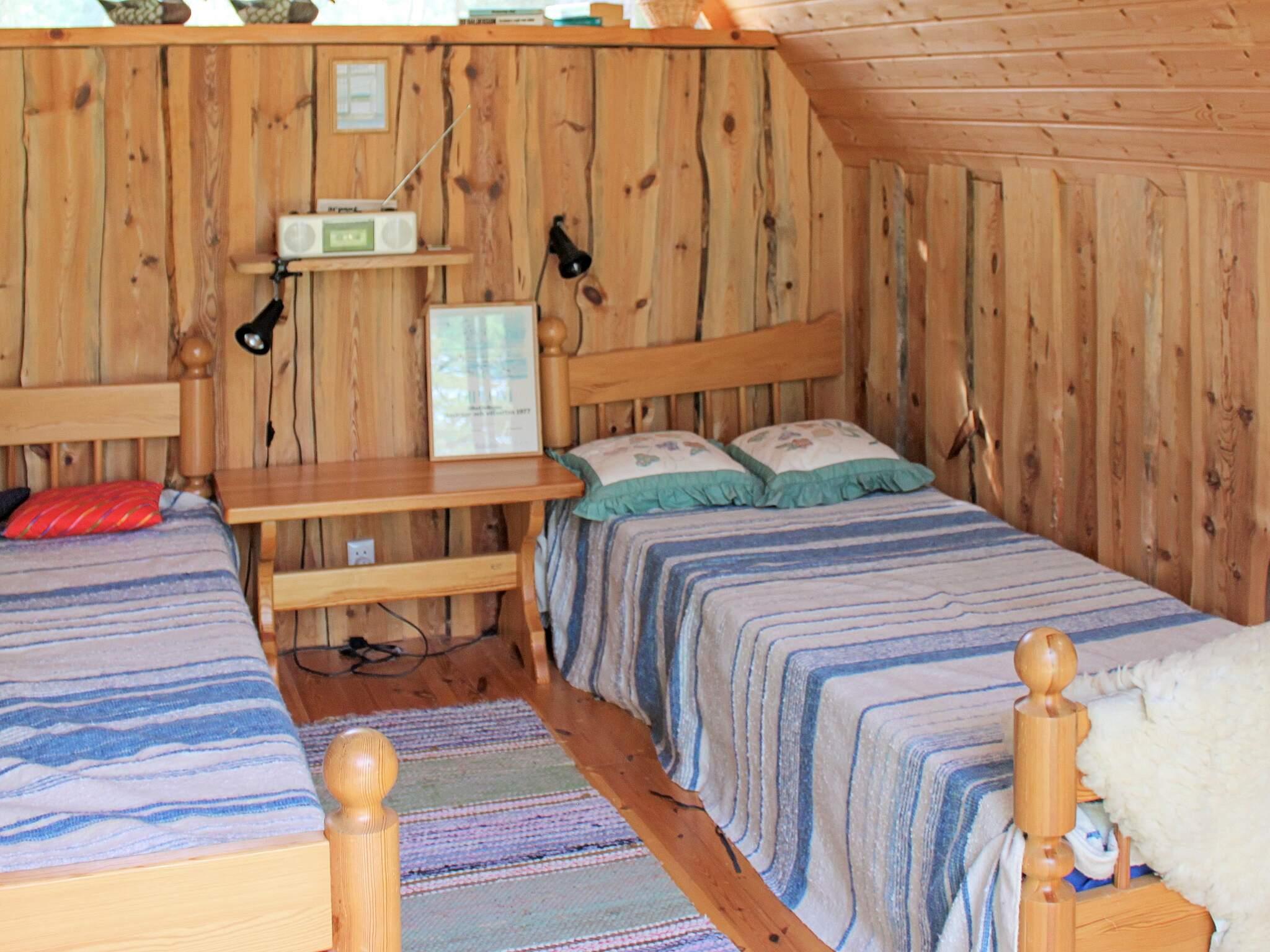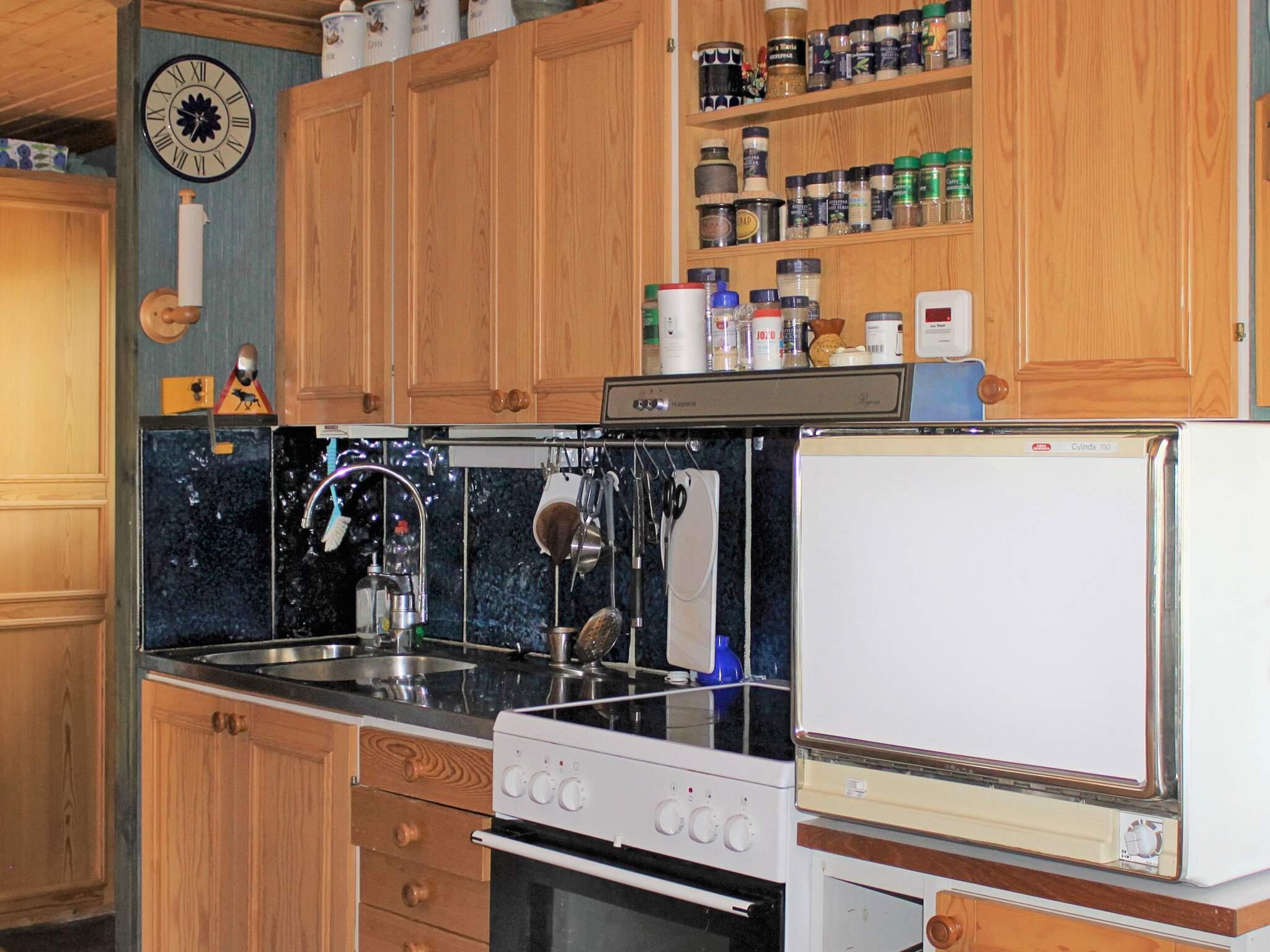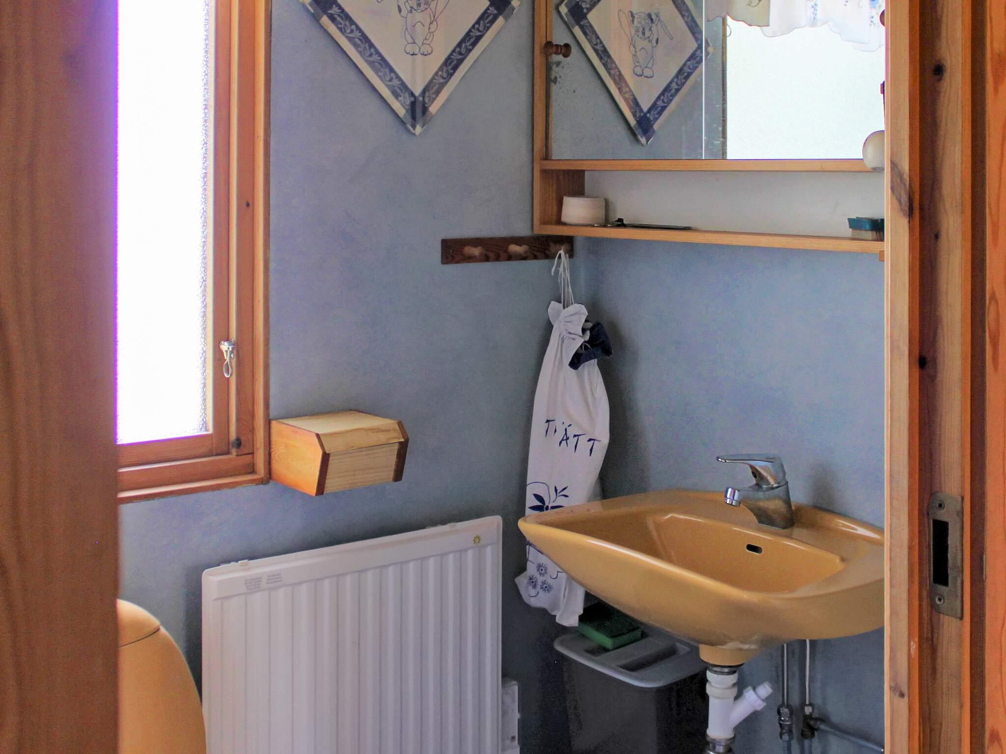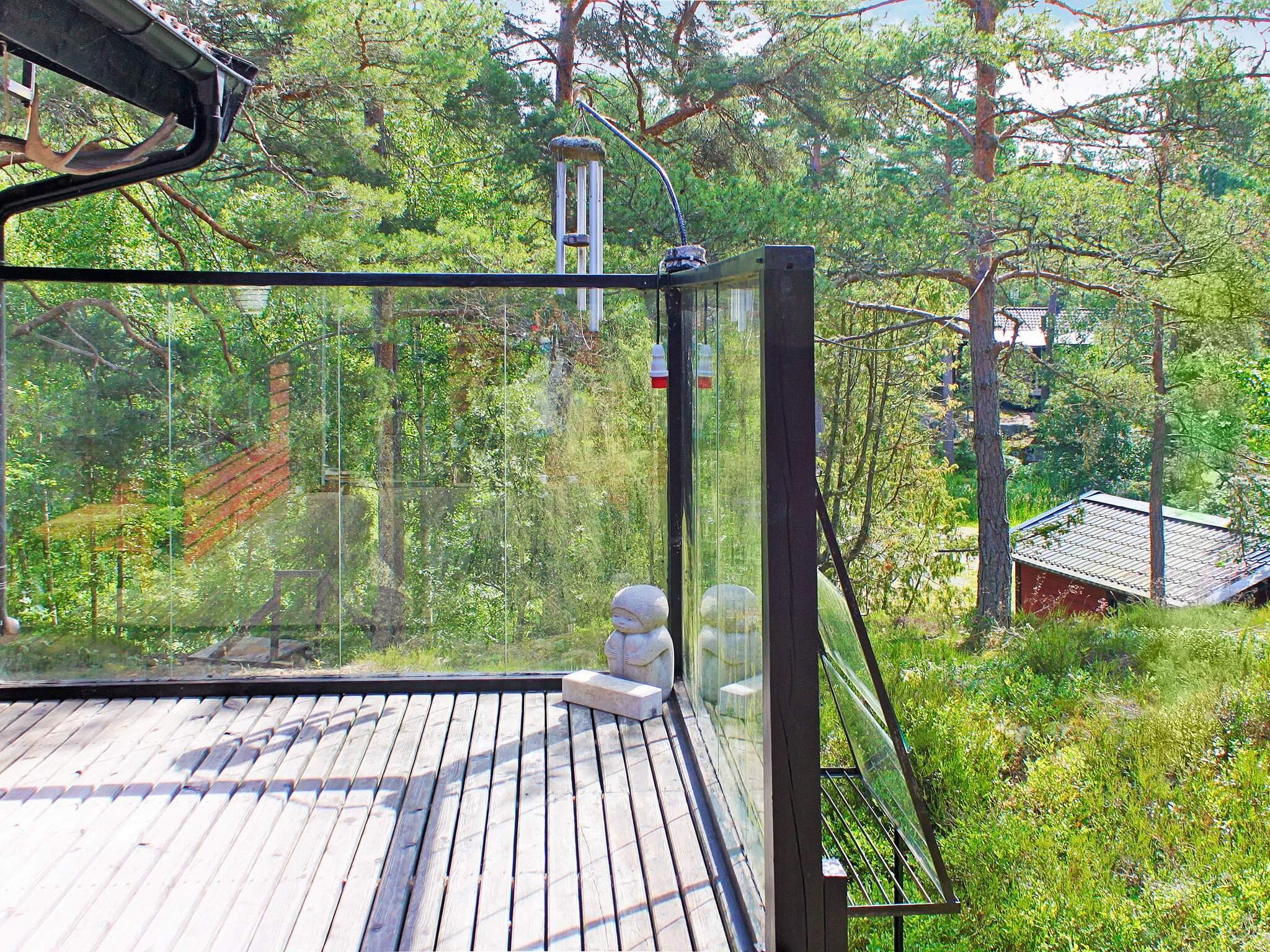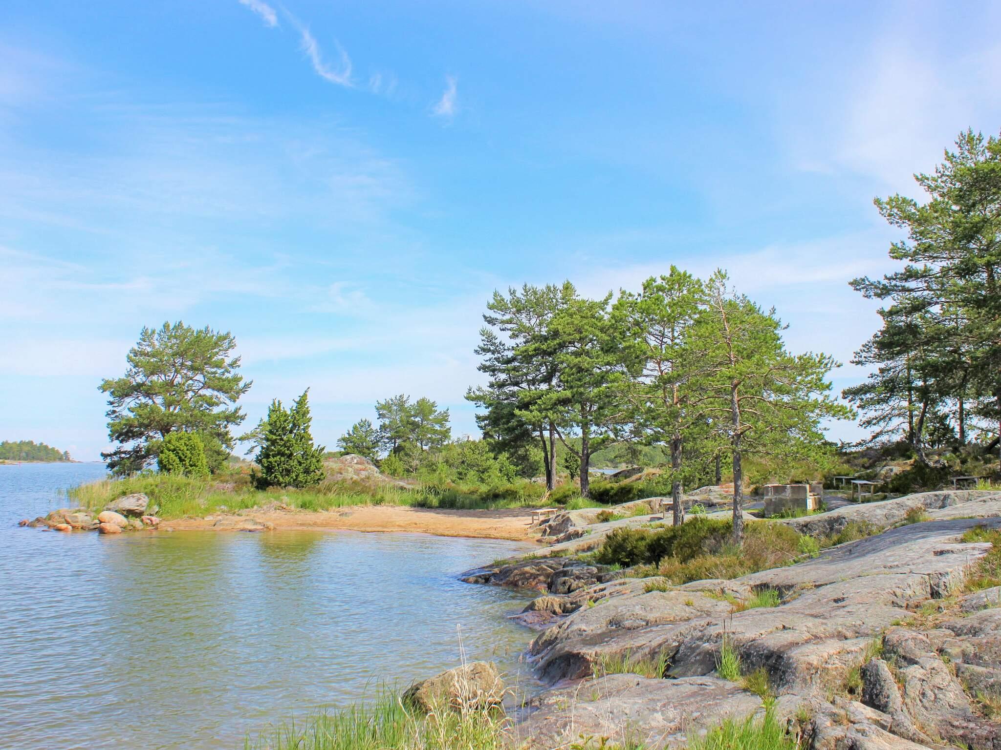 Hinter dem Haus steht ein kleinerer, separater Annex mit zwei weiteren Schlafplätzen innen und eigener, kleiner Veranda davor. Das Ferienhaus steht in einem ruhigen Ferienhausgebiet am Wald. Zwischen der Hauswand und einem gegenüber liegenden, weißen Haus führt ein kleiner Pfad hinunter zum Badeufer des Ferienhausgebietes. Man geht etwa 10 Minuten dorthin und findet dann einen Badesteg, ein kleines Strandufer sowie einige Grillmöglichkeiten vor.