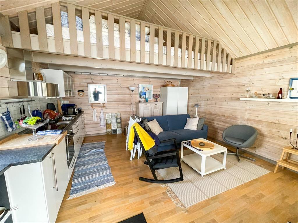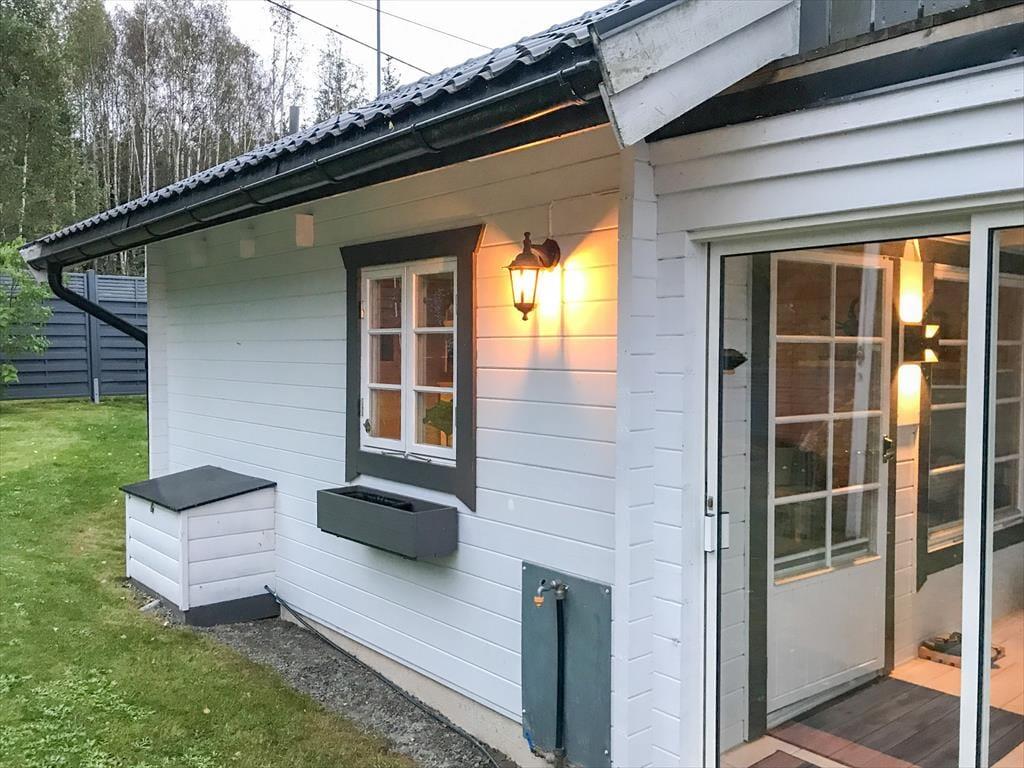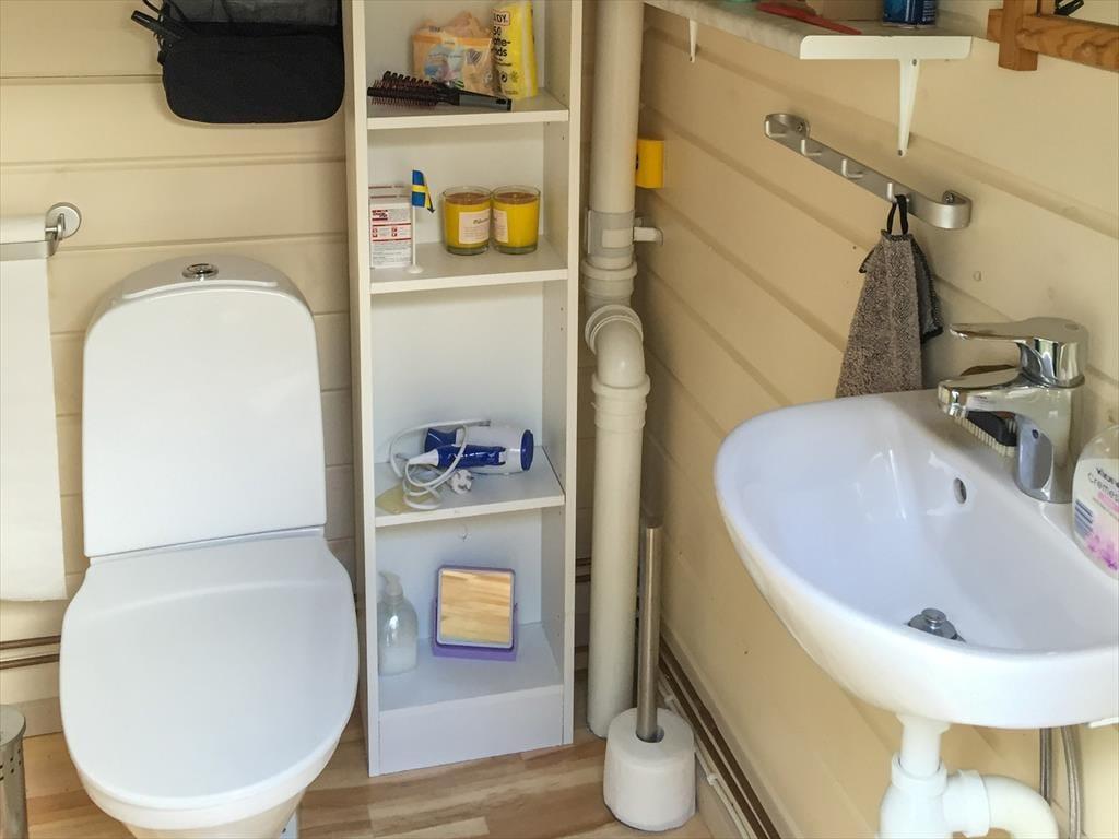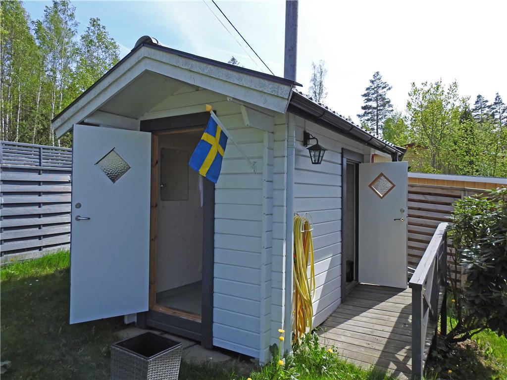 Eine steile Leiter führt vom Wohnraum auf einen Schlafboden mit zwei Matratzen. Hier fühlen sich Kinder besonders wohl. Trotz eingeschränkter Stehhöhe ist dieser jedoch durchaus auch für Erwachsene geeignet. Direkt hinter dem Haus befindet sich ein kleines Sanitärhäuschen, in dem sich getrennt voneinander ein Raum mit Dusche und ein Raum mit WC und Waschbecken befinden. Das Ferienhaus hat fließend kaltes und warmes Wasser und in allen Zimmern Elektroheizkörper. Gartenmöbel und Weber Grill sowie zwei Sonnenliegen und ein Ruderboot runden die Ausstattung dieses hübschen Ferienhauses ab.
