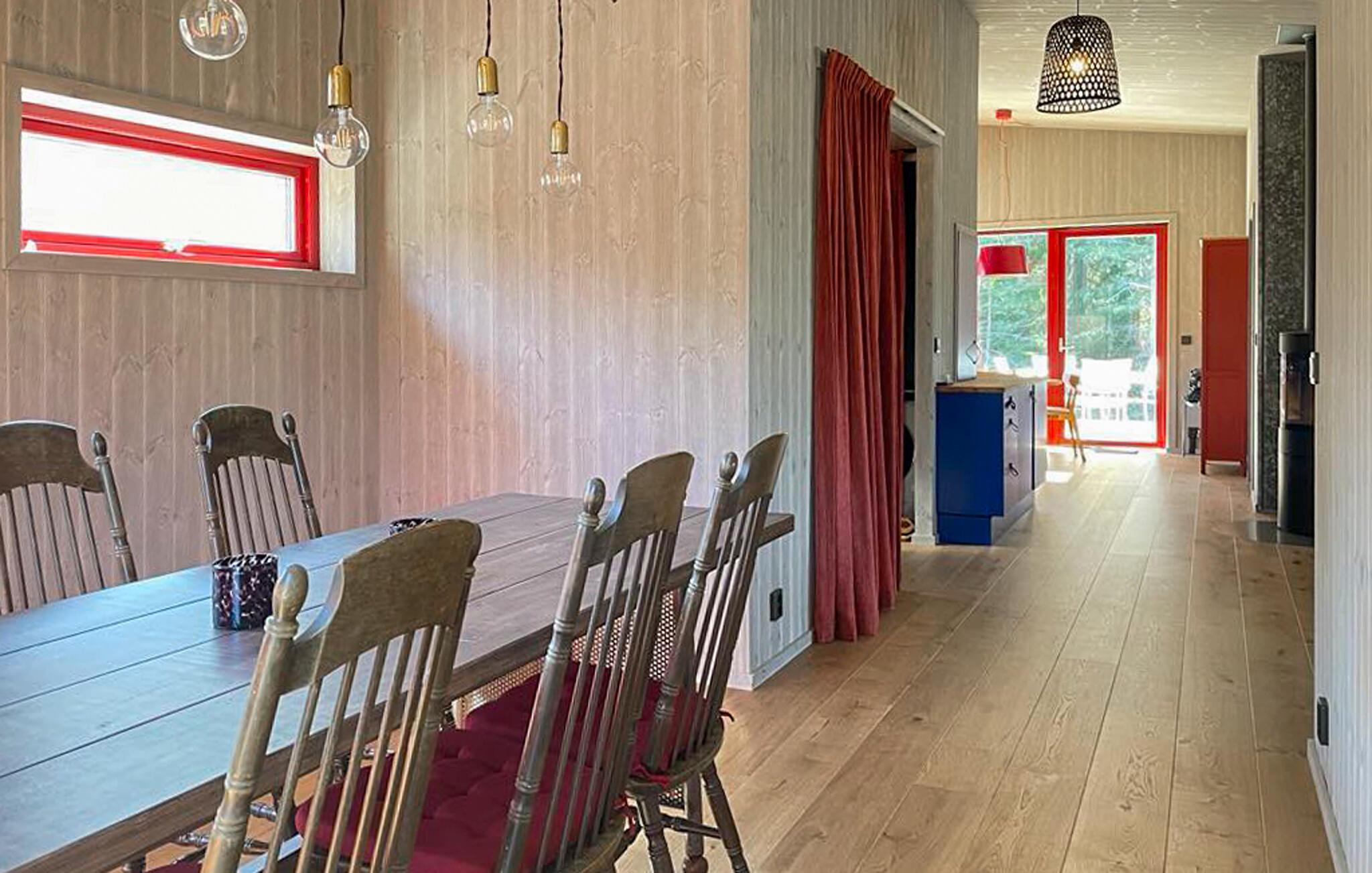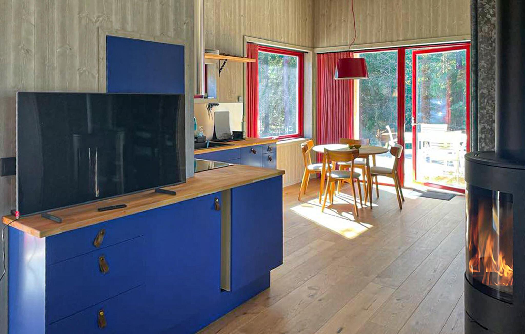 Dieses architektonisch ansprechende Ferienhaus auf Gotland lädt zu einem erholsamen Urlaub in naturnaher Umgebung ein. Die ruhige Lage bietet beste Voraussetzungen für entspannte Tage und abwechslungsreiche Ausflüge. Treten Sie ein in das geschmackvoll eingerichtete Haus mit seiner hellen Holzvertäfelung und moderner Gestaltung. Machen Sie es sich im Wohnbereich auf den stilvollen Sesseln gemütlich, wärmen Sie sich am Kaminofen oder bereiten Sie Ihre Mahlzeiten in der schönen Küche zu. Am Esstisch findet die ganze Familie Platz für gemeinsame Stunden, und durch die großen Fenster fällt viel Tageslicht in die Räume.