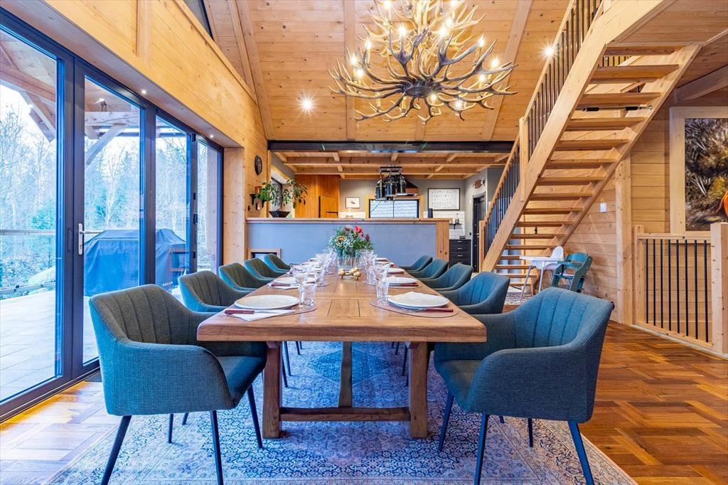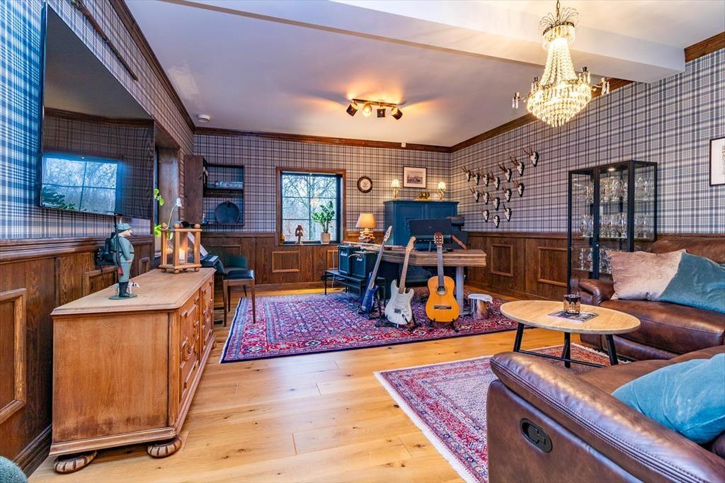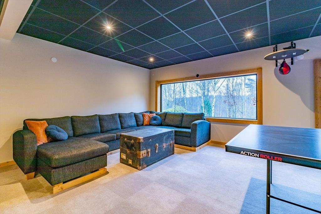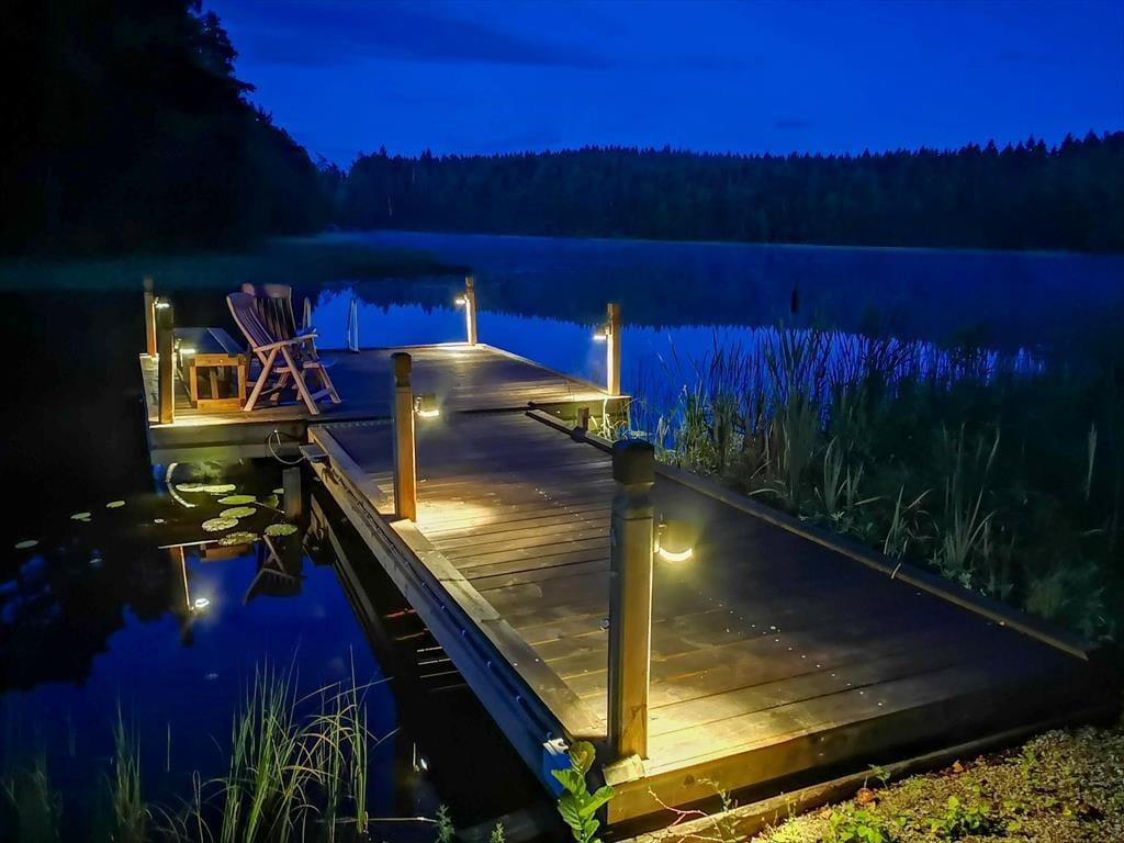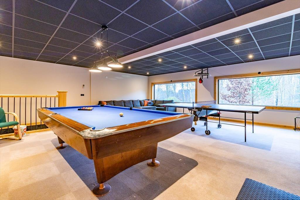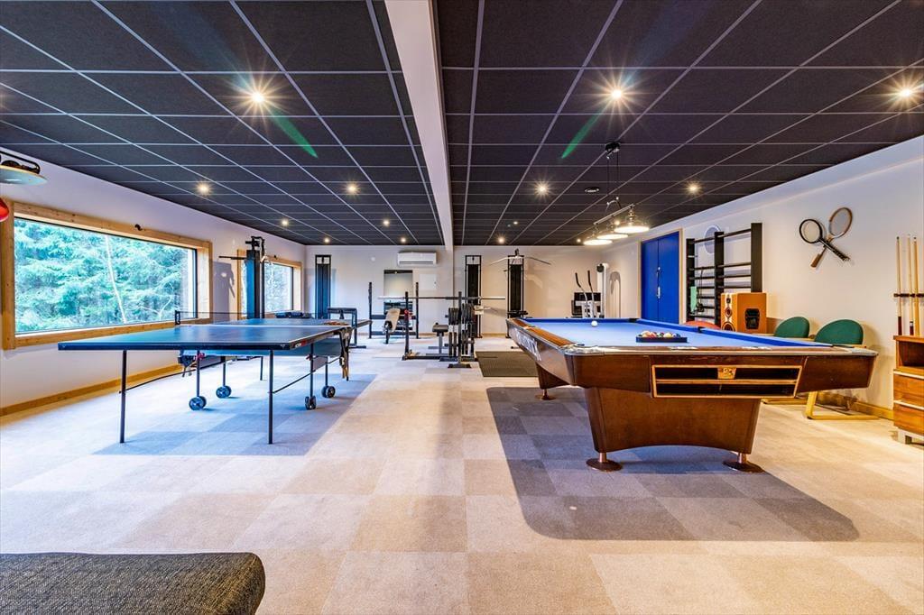 Seitlich des Ferienhauses befindet sich eine größere Scheune. Im oberen Teil der Scheune gibt es ein kleines Fitnessstudio, einen Pooltisch und eine Tischtennisplatte. Am See gibt es einen Steg mit Boot, ein Ruderboot eine Feuerstelle und eine kleine Holzhütte mit Windschutz.
