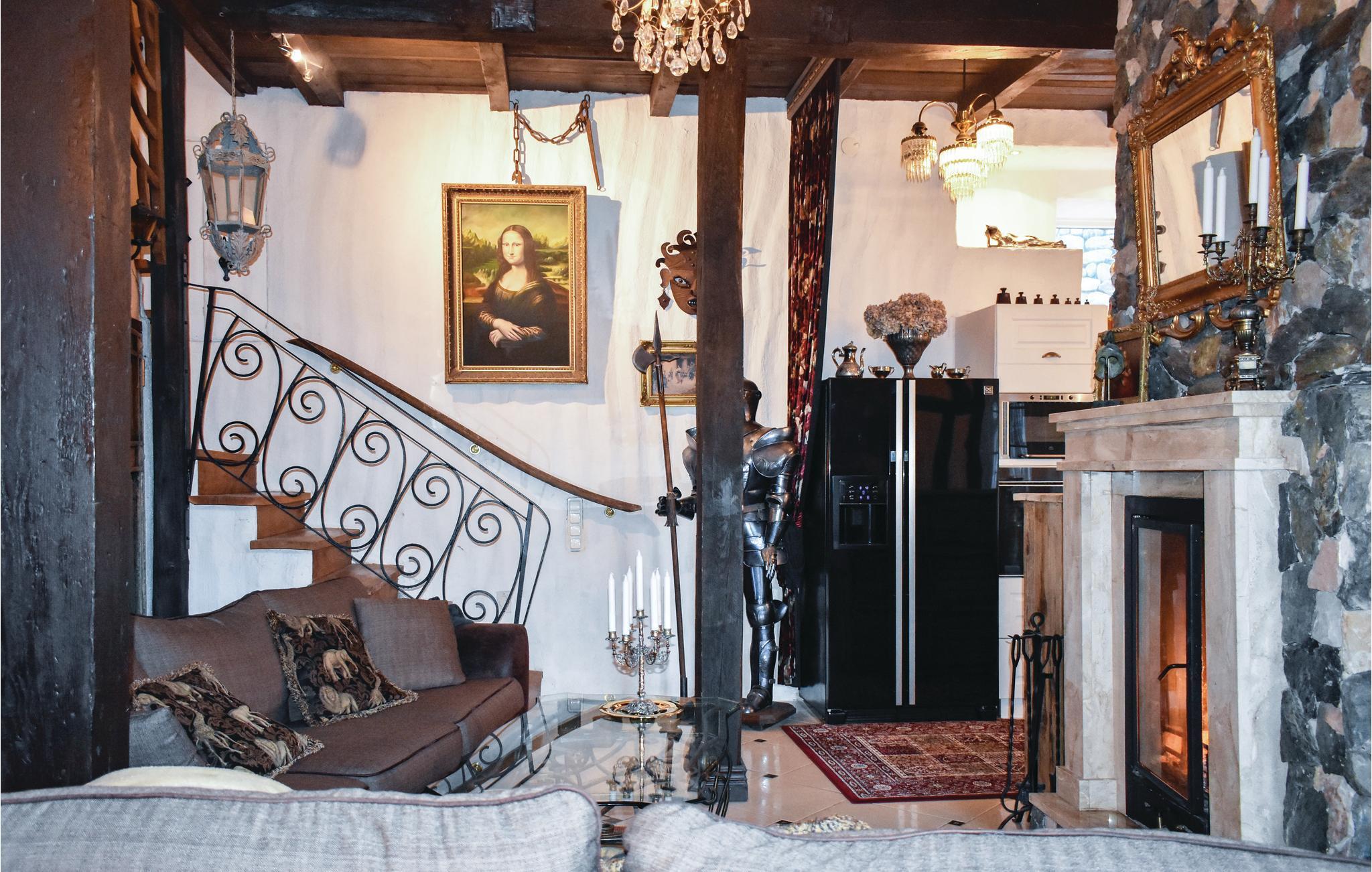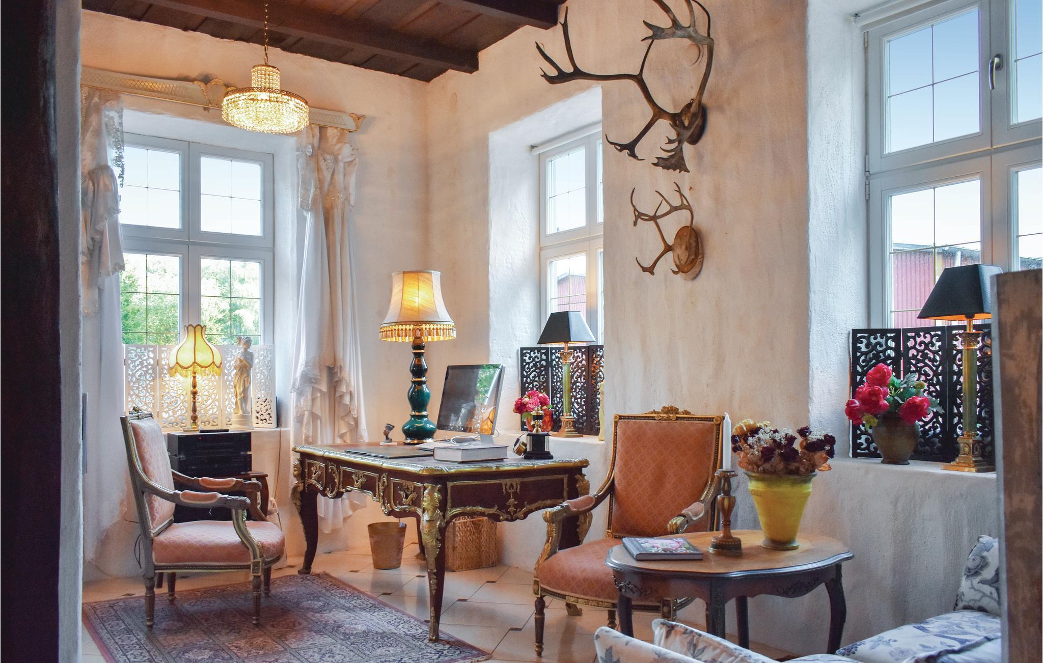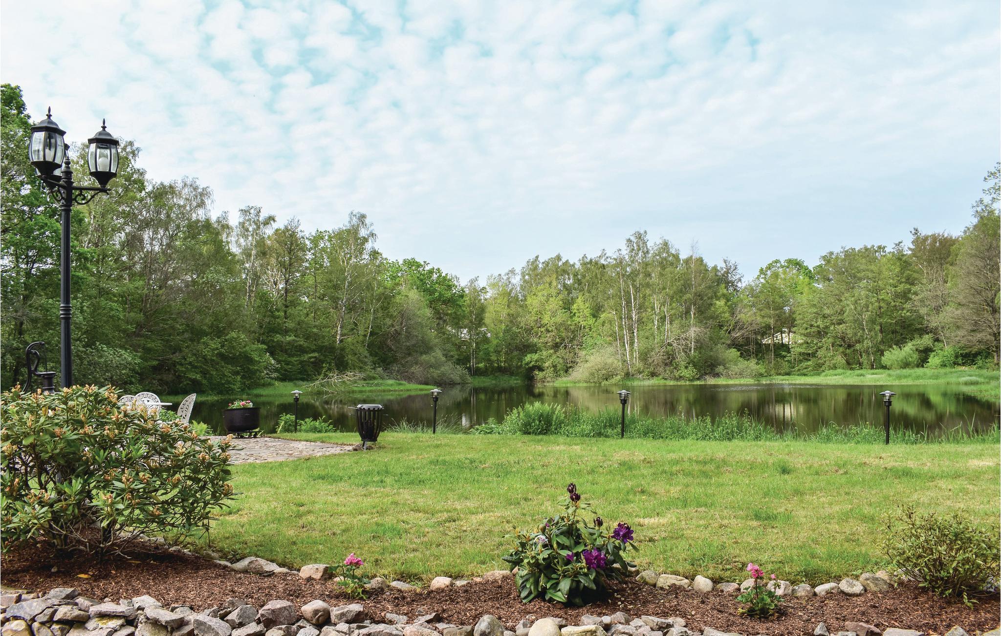 Ein großes, schönes Haus mit Terrasse, von wo Sie Blick auf einen kleinen See haben.