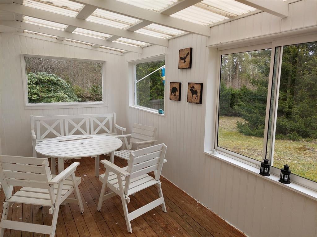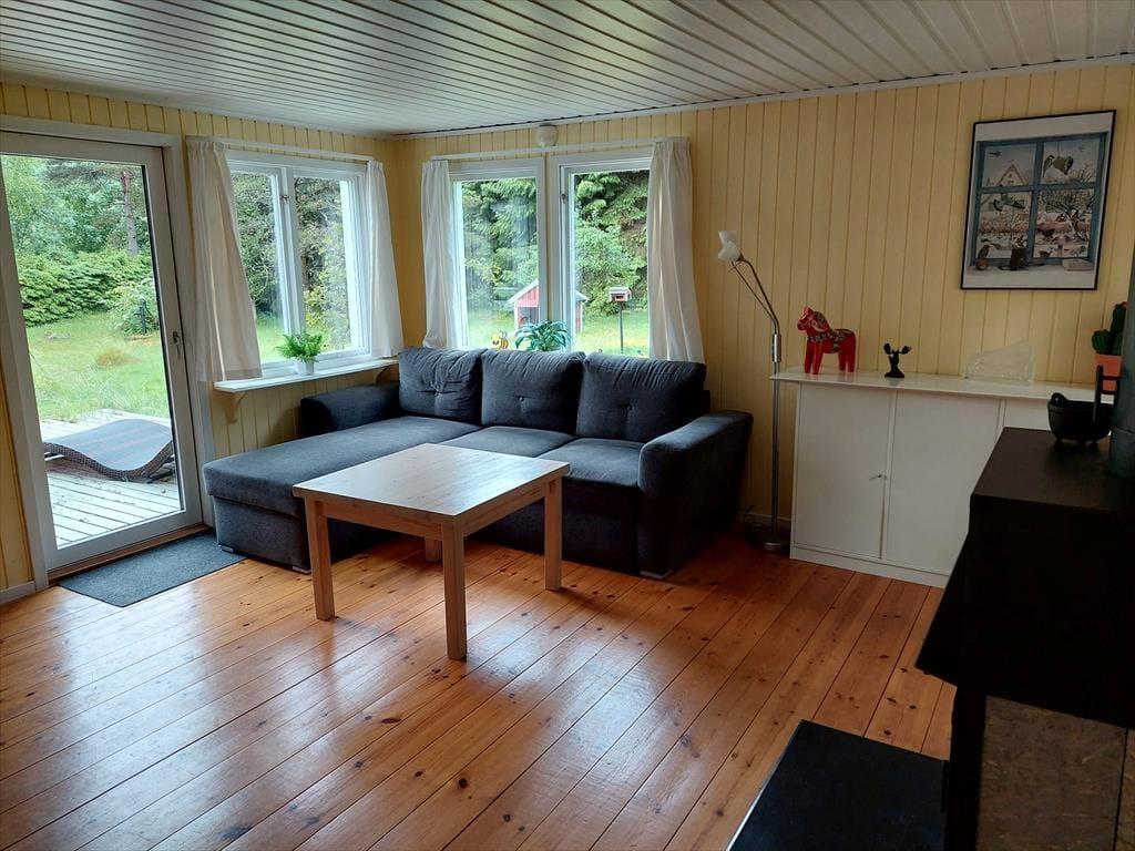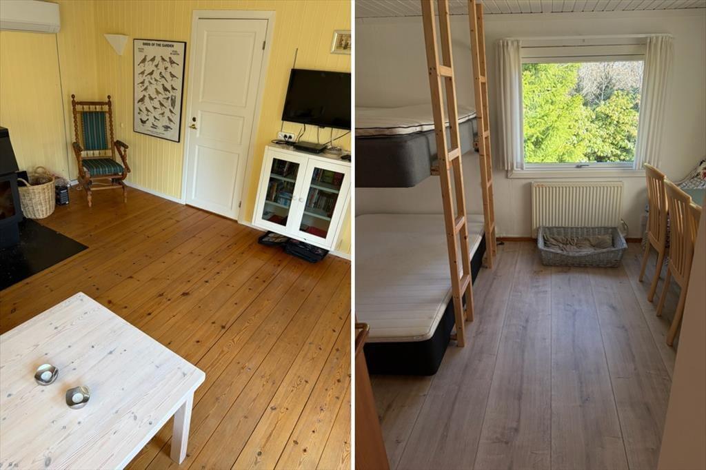 Auf 56 m² bietet das Haus bis zu 6 Erwachsenen und 2 Haustieren genügend Platz. Du betrittst es über die Holzterrasse kommend durch den 14 m² großen Wintergarten mit Glasschiebetüren. Von dort aus gelangst du durch die Haupteingangstür direkt in die Küche, die neben einem Kühlschrank mit Gefrierfach, Ofen, Herd, Mikrowelle und Wasserkocher alles beinhaltet, was du zum Zubereiten und Servieren gängiger Gerichte für sechs Personen benötigst. Die Küche liegt in halboffener Verbindung zum Wohnzimmer, in dem du dich auf dem großen Ecksofa vor dem prasselnden Kaminofen entspannen kannst. Der Fernseher empfängt nur schwedische Kanäle, verfügt aber aber über einen DVD-Player. Die sechs Schlafplätze verteilen sich auf ein Schlafzimmer mit Doppelbett, ein zweites mit selbstgebautem Etagenbett mit breiten Matratzen und auf ein doppeltes Schlafsofa im Wohnzimmer. Die Betten sind von 2020. Das Badezimmer ist mit WC und Dusche ausgestattet. Eine Waschmaschine gibt es leider nicht, aber wenn du etwas mit der Hand waschen möchtest, steht dir ein Wäscheständer zur Verfügung. An der Feuerstelle mit Grillrost im Garten kannst du romantische Abende mit Stockbrot oder Grillgut verbringen. Wenn du lieber überdacht, aber dennoch an der frischen Luft sitzen möchtest, kannst du dich in den Wintergarten zurückziehen. Ein Schrank voll mit Spielen, Büchern, Stiften, Malbüchern usw. sowie das großzügig bemessene Grundstück und der nur spärliche Verkehr auf dem vorbeiführenden Schotterweg machen das Haus besonders kinderfreundlich. Für optimale Raumtemperaturen sorgen die moderne Wärmepumpe, ein paar E-Heizkörper und ein Kaminofen. Das Grundstück ist außerdem auch hundefreundlich: Es gibt Erdspieße mit langer Leine, zwei Hundekörbe sowie Futter- und Wassernäpfe. Der Garten ist zwar nicht eingezäunt, aber größtenteils von einer Hecke umgeben.