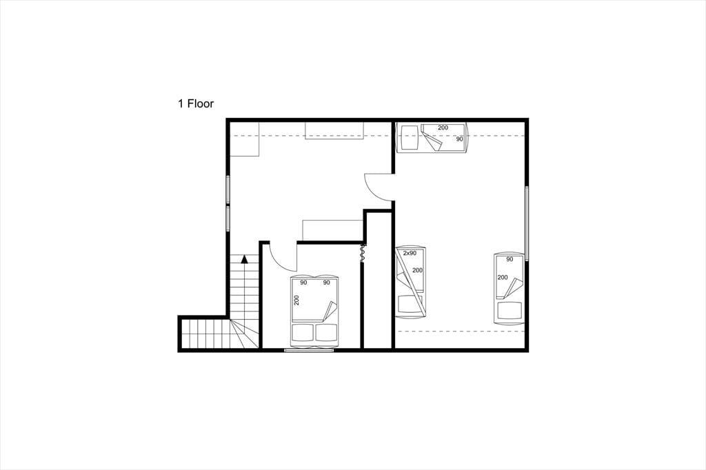 Das zweigeschossige, voll unterkellerte Ferienhaus hat eine Wohnfläche von etwa 100 m². Ein kleiner Anbau, über den man das Haus betritt, führt in einen schmalen, länglichen Flur, von dem sowohl eine Treppe in den Keller, in dem sich das Duschbad mit WC, Handwaschbecken, Waschmaschine und Sauna befinden, als auch zum Obergeschoss mit den beiden Schlafzimmern abgeht, von denen das erste mit einem Doppelbett, das andere mit einem Etagenbett und zwei Einzelbetten ausgestattet ist. Im Erdgeschoss befinden sich die gut ausgestattete Wohn-Küche mit E-Herd mit Glaskeramikkochfeld und Backofen, Kühl- Gefrierkombination, Kaffeemaschine sowie Wasserkocher und Esstisch, ein gemütliches Wohnzimmer mit bequemen Sitzmöbeln, Kaminofen und Flat-TV mit deutschen Programmen sowie ein Gäste WC. Das Brennholz für den Kamin ist im Mietpreis enthalten.