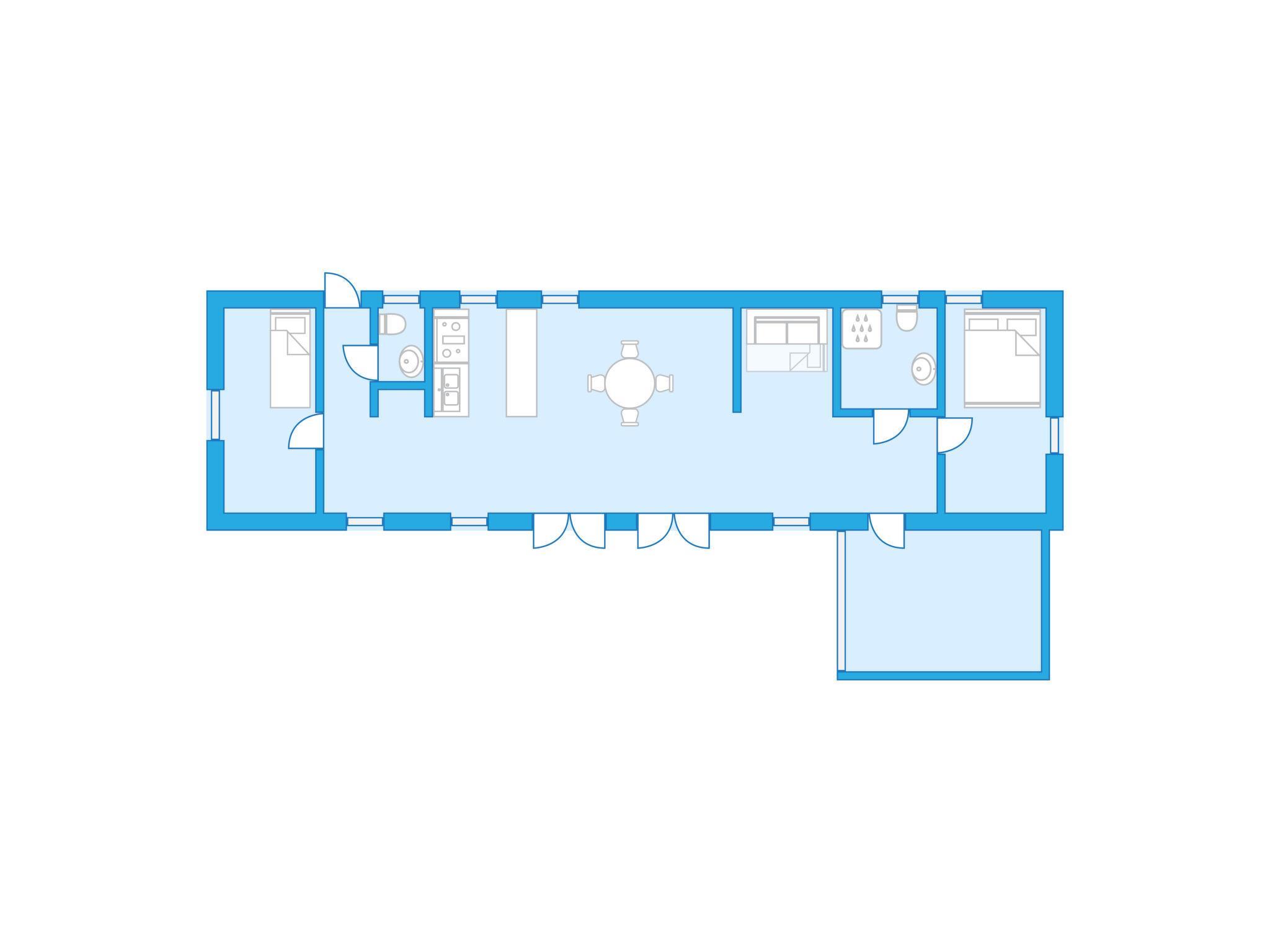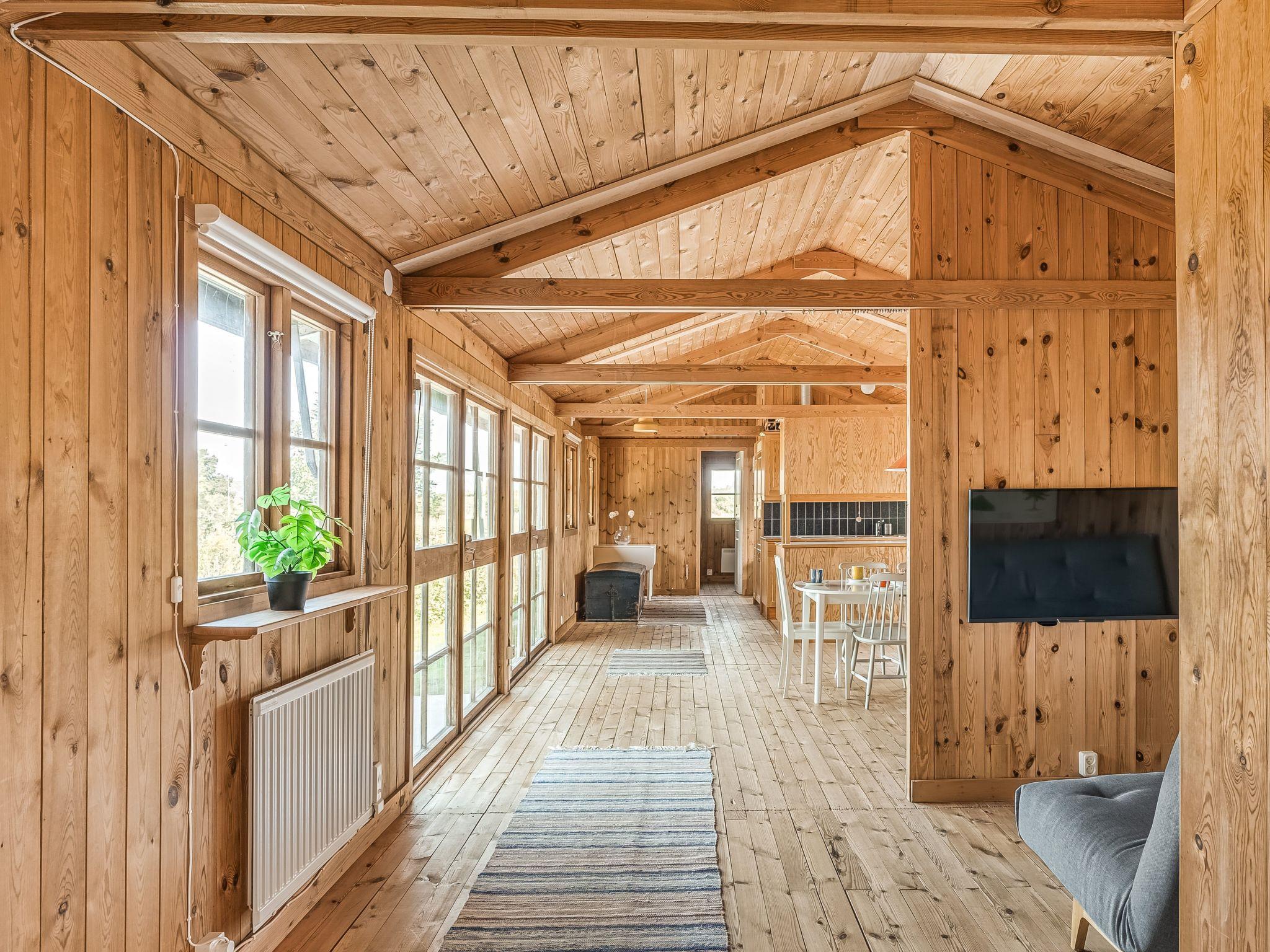 "Solhaga", 4-Zimmer-Haus 75 m2. Gemütlich eingerichtet: Wohn-/Esszimmer mit Schiebetür mit TV und E-Heizung. Kabine mit 1 Doppeldiwanbett. 1 Zimmer mit 1 Doppelbett. 1 Zimmer mit 1 x 2 Etagenbetten. Wohnküche (Backofen, Geschirrspüler, 4 Glaskeramikplatten, Toaster, Wasserkocher, Mikrowelle, Tiefkühler, elektrische Kaffeemaschine). Dusche/WC, sep. WC. E-Heizung. Holzdielenboden. Terrassenmöbel, Gartengrill (mobil), Loggia. Zur Verfügung: Waschmaschine. Internet (WLAN, gratis). Bitte beachten: Nichtraucher-Haus. Anstelle eines abgeschlossenen Schlafzimmers befinden sich manche Schlafplätze in einem offenen Bereich (Galerie, Nische etc.).