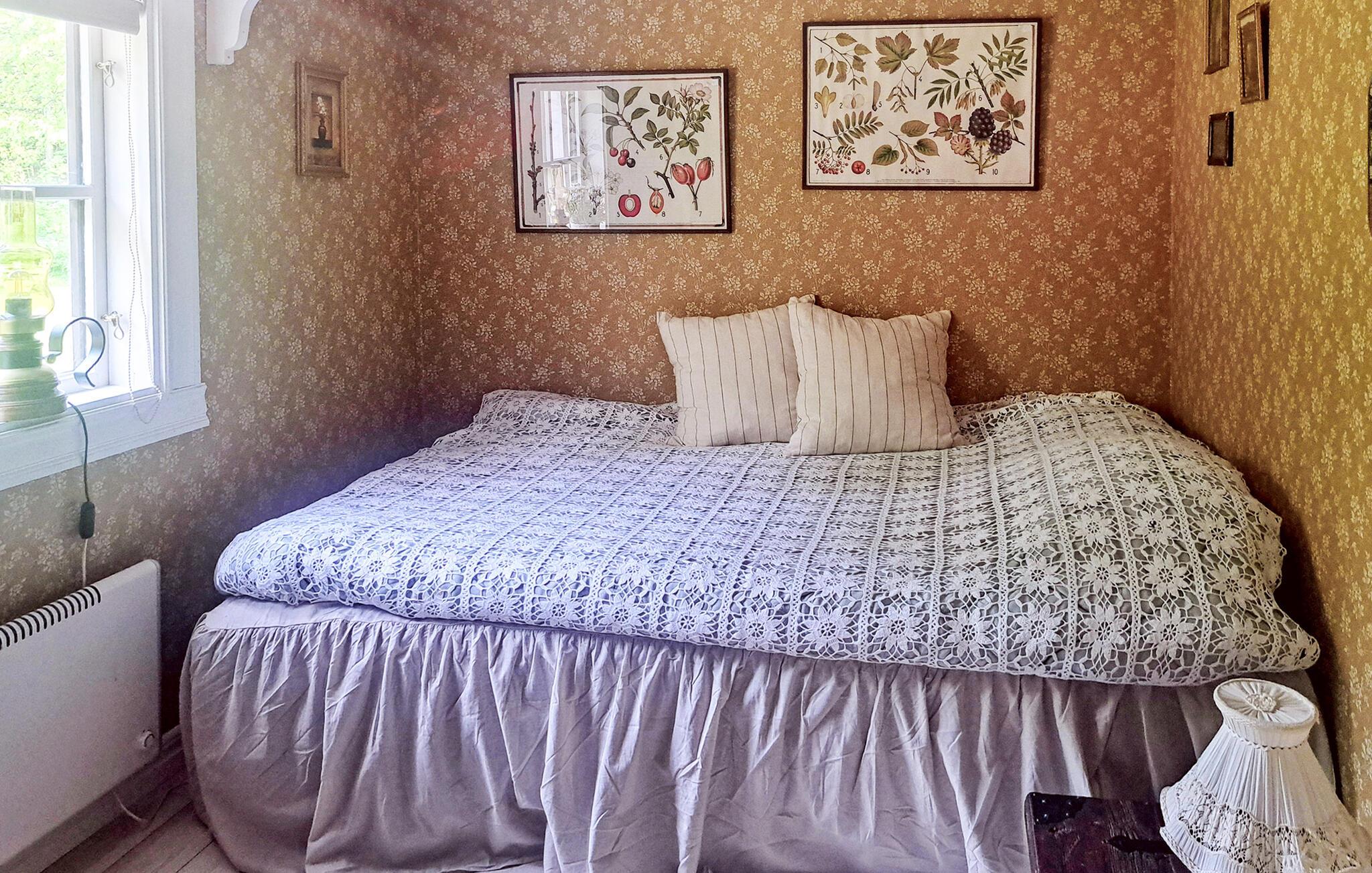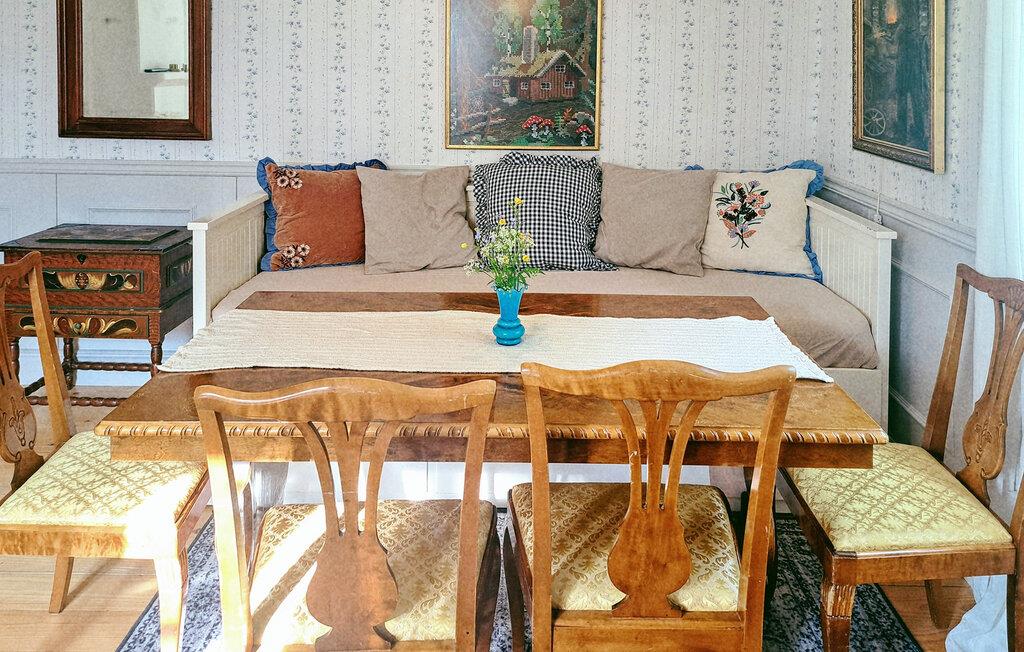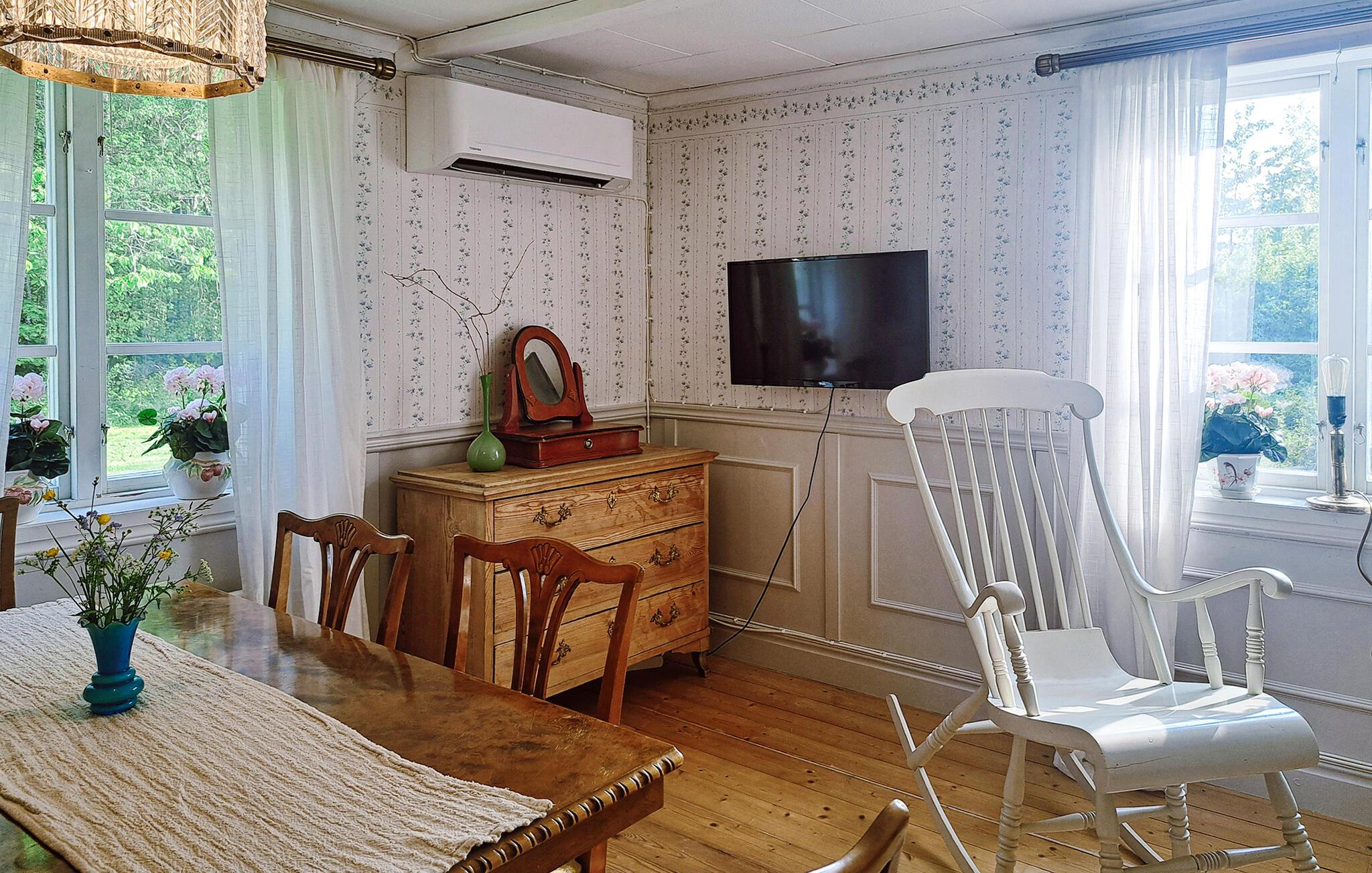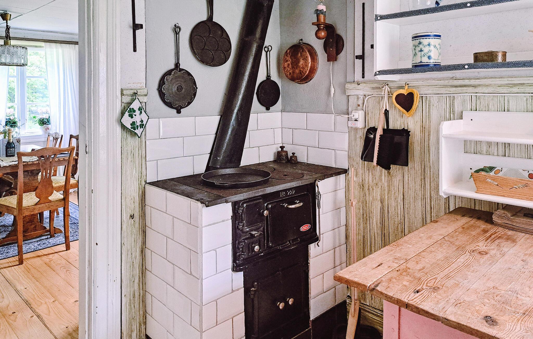 Ihr gemütliches Ferienhaus bietet Ihnen eine stimmungsvolle Kulisse für eine erholsame Auszeit in ruhiger, naturnaher Lage. Lassen Sie sich vom traditionellen Stil des liebevoll gestalteten Hauses empfangen und genießen Sie die familiäre Atmosphäre. Entspannen Sie im wohnlich eingerichteten Esszimmer mit klassischen Möbeln, Schaukelstuhl und Holzofen. Die sanften Farbtöne, Holzfußböden und floralen Tapeten schaffen ein harmonisches Ambiente. Kochen Sie in der Küche mit modernem Komfort und nostalgischem Herd. Genießen Sie Ihre Mahlzeiten am rustikalen Esstisch mit Blick ins Grüne. Die obere Etage eignet sich wunderbar zum Zurückziehen und Träumen.