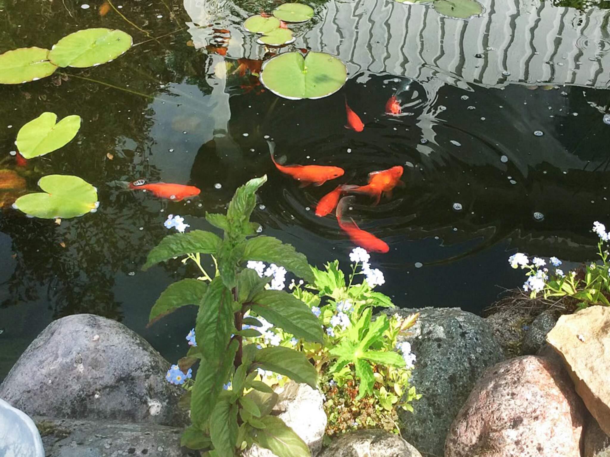 Vom Küchenbereich des Hauses aus gelangt man auf die 50 m² große Veranda. Die Veranda ist vollständig überdacht und teilweise verglast. Das Haus liegt den ganzen Tag in der Sonne. Für Schatten sorgt die Pergola im Garten. Der Garten ist liebevoll und wunderschön angelegt. Eine Oase mit u. a. einem Teich mit Goldfischen und plätscherndem Wasser.