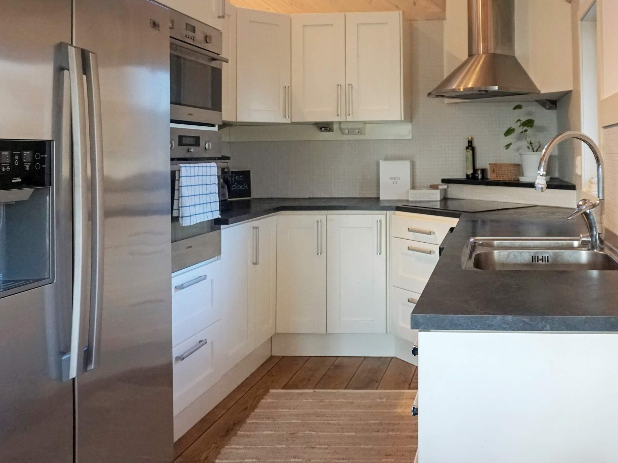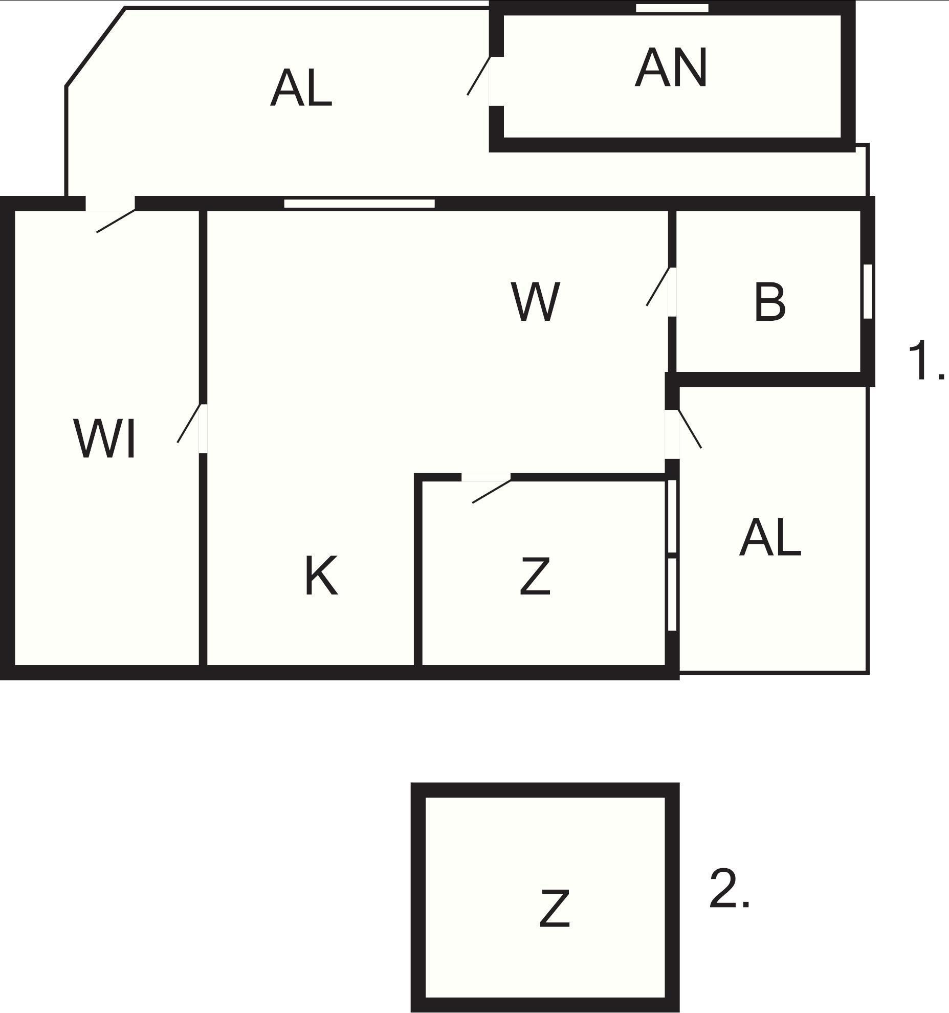 Im Haus offener Küchen-/Wohnbereich für das Familienleben mit Ess- und Sitzecke. Das Sofa dort kann auch als Schlafcouch genutzt werden. Das Ferienhaus hat ein Schlafzimmer mit einem Doppelbett, zudem einen Schlafboden mit einem weiteren Schlafplatz oben unter der Dachschräge. Gleich nebenan steht auf dem Grundstück der separate Annex mit drei Betten. Gut zu wissen: Das Schlafsofa ist 140 cm breit und für eine Person gedacht, kann jedoch auch für zwei kleinere Kinder genutzt werden. Im Außenbereich stehen ein schönes Rasengrundstück und eine gemütliche Holzterrasse mit Gartenmöbeln und Grill. Die Terrasse befindet sich an der Rückseite des Hauses.