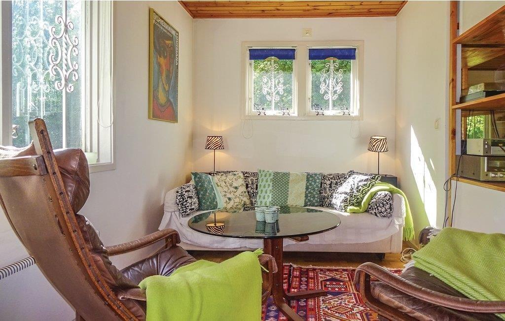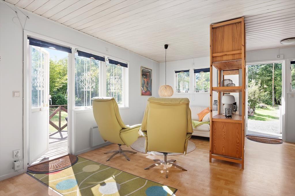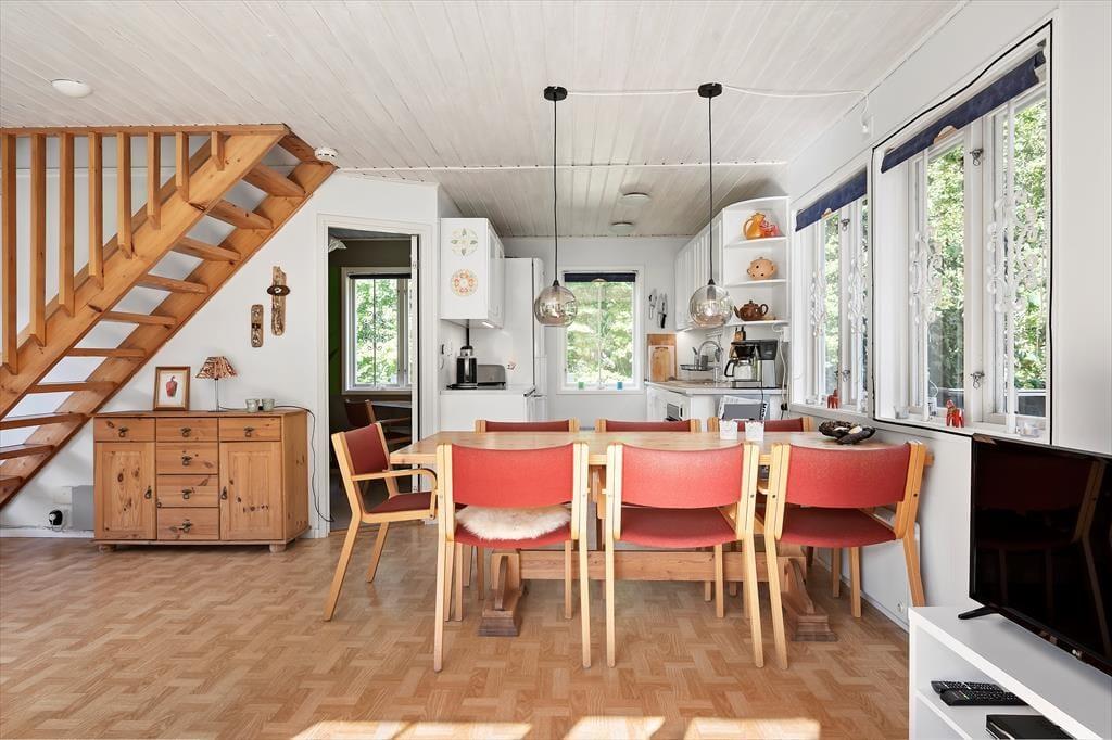 Das etwa 70 m² große, rotweiße, in 2020 renovierte Ferienhaus bietet bis zu fünf Feriengästen Platz und zusätzlich einem Kleinkind bis etwa vier Jahre. Neben dem großen Wohnbereich im Erdgeschoss mit integrierter Küche, Ess- und Sitzecke mit Kaminofen und SAT-TV (deutsche Programme) befindet sich dort auch eines der Schlafzimmer, ausgestattet mit einem Einzelbett, sowie ein Duschbad mit WC. Die beiden anderen Schlafzimmer, eines davon mit einem Doppelbett, das andere mit einem Etagenbett möbliert, befinden sich im Obergeschoss des Hauses. Die Küche ist mit Elektroherd mit Backofen und Dunstabzugshaube, Kühl- und Gefrierschrank sowie Kaffeemaschine und Mikrowelle ausgestattet. Das Haus hat fließend kaltes und warmes Wasser aus eigenen Brunnen und kann mit Elektroheizkörpern und dem Kaminofen beheizt werden. Den Gästen stehen ferner ein Internetzugang sowie ein Kinderbett und ein Kinderhochstuhl zur Verfügung; eine Waschmaschine und ein Tischtennistisch befinden sich in einem Nebengebäude. Eine an das Haus angebaute, offene Terrasse mit Gartenmöbeln und Grill bietet zusätzlichen Platz und lässt auf sonnige Stunden im Freien hoffen. .