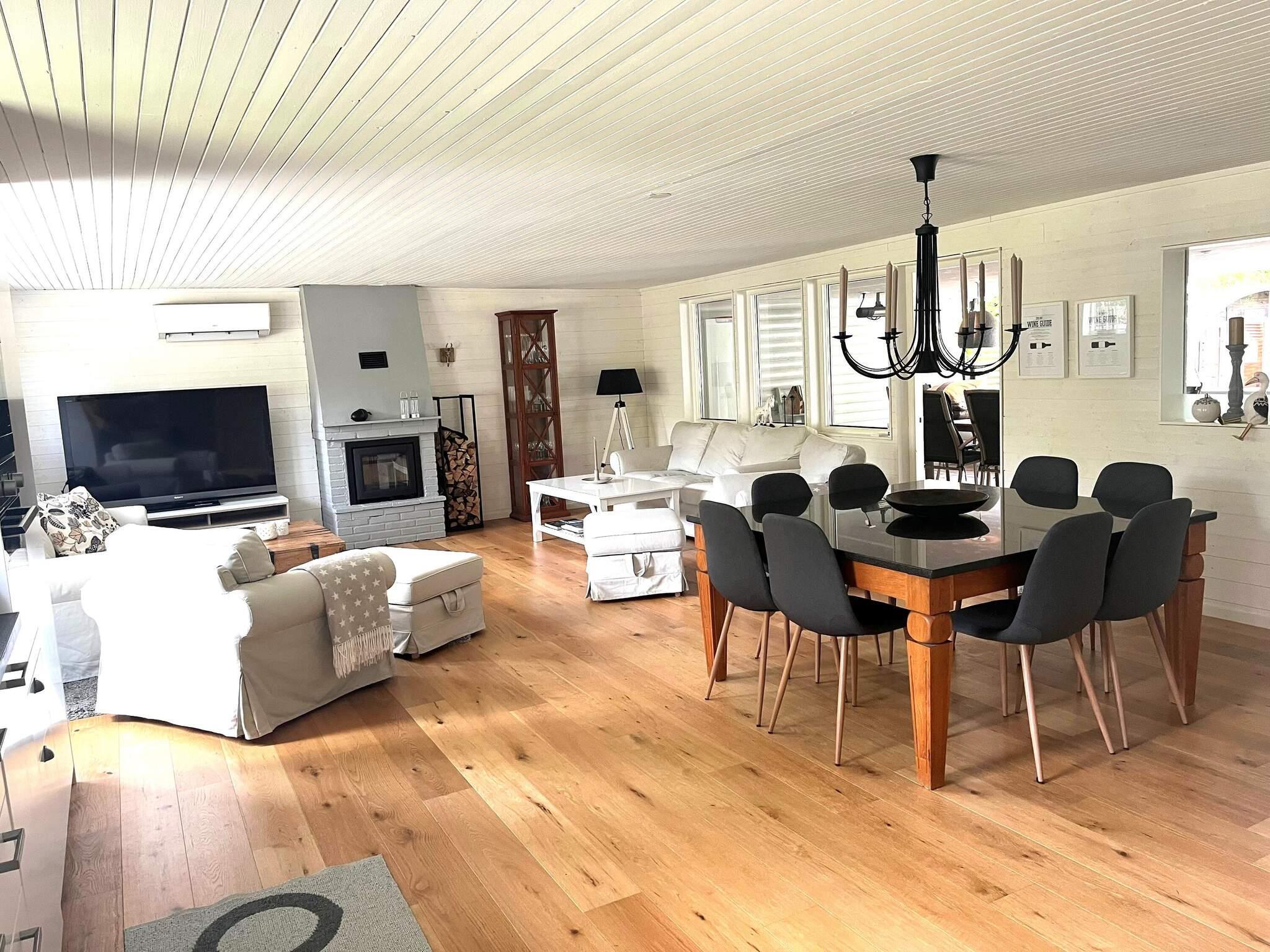 Der offene Wohnbereich empfängt Sie mit Terrassentüren zur möblierten Terrasse, die sowohl morgens als auch abends sonnig ist. Die geräumige Küche mit Essbereich lädt zur Selbstverpflegung und gemeinsamen Mahlzeiten ein. Vor dem Smart-TV mit Senderauswahl und dem Kaminofen, der für wohlige Wärme sorgt, findet jeder Platz auf einer großen Sitzecke. Drei Schlafzimmer mit je einem Doppelbett und ein weiteres mit einem Etagenbett (zwei Betten) stehen zur Verfügung. Dusche und Waschmaschine befinden sich im modernen Badezimmer. Ein möblierter, überdachter Wintergarten mit Lounge-Möbeln grenzt an die Terrasse, neben dem Whirlpool und der holzbefeuerten Sauna befindet sich der private Garten hinter dem Haus.