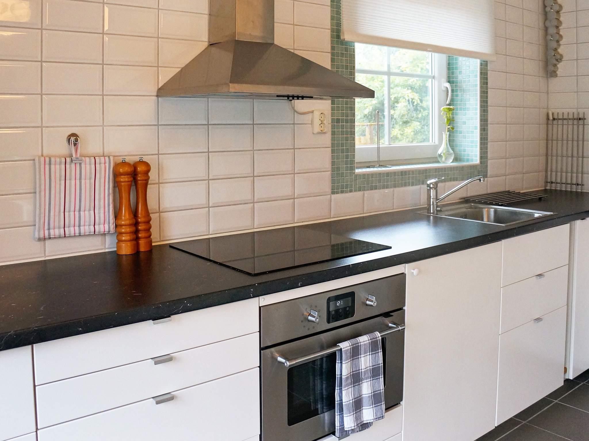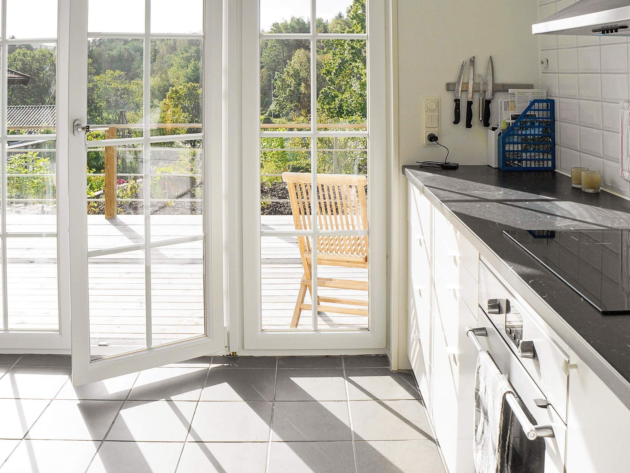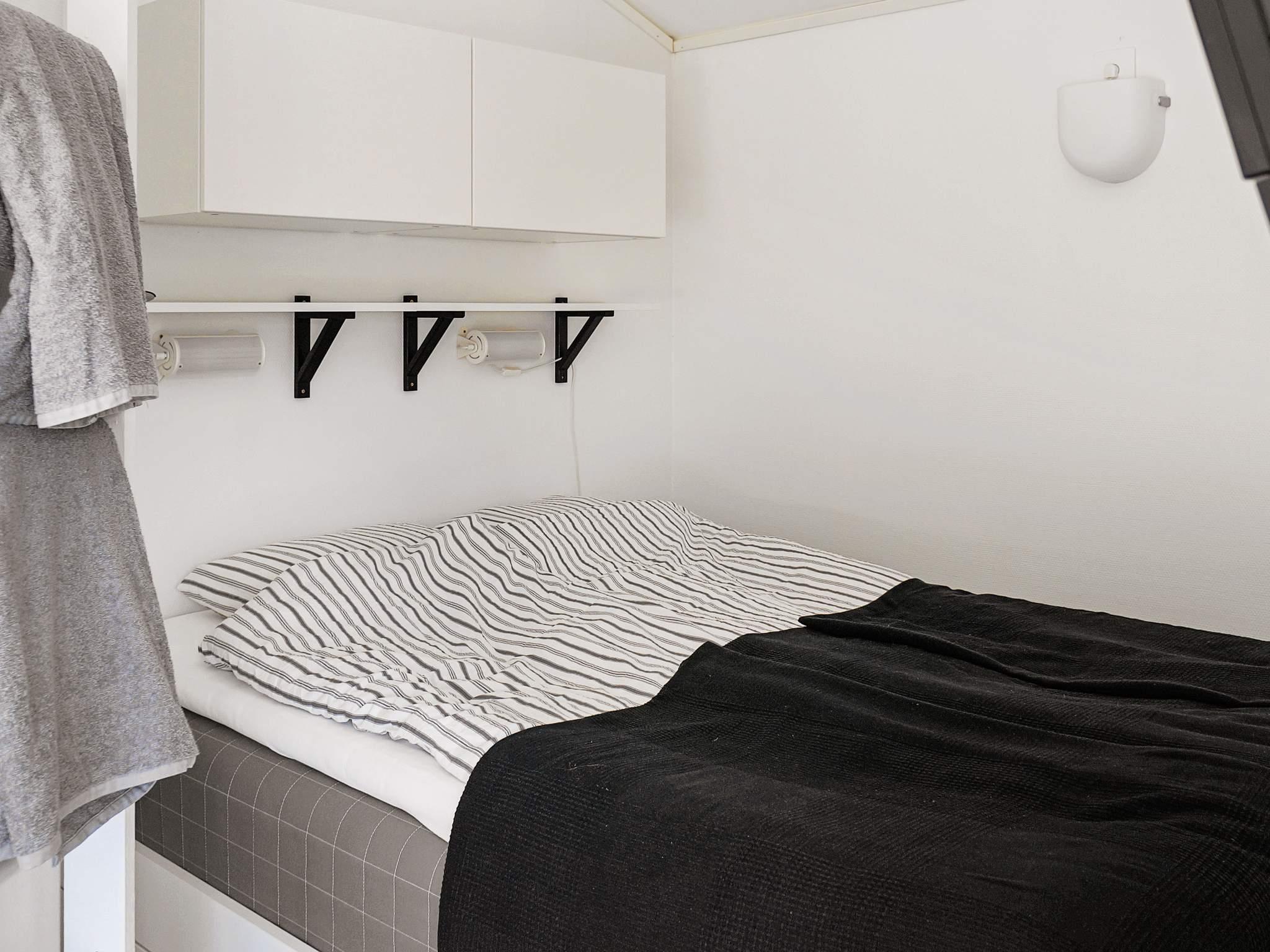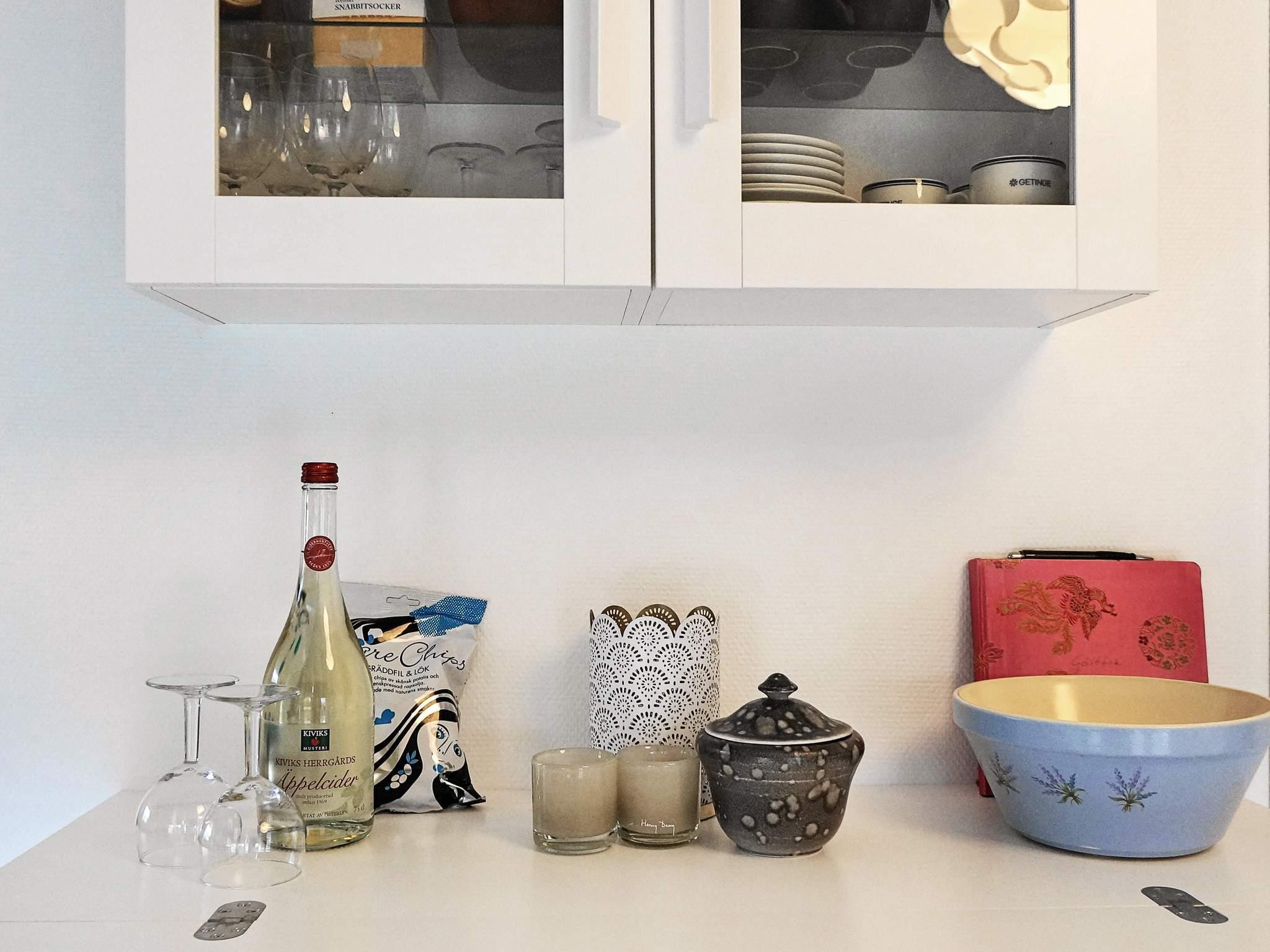 Im Haus gibt es einen hellen, offenen Küchen-/Wohnbereich mit Glasfront zur Terrasse, die an schönen Tagen weit geöffnet werden kann und somit quasi die Wohnfläche erweitert. Im Raum befinden sich auch die Essecke sowie ein praktischer, ausziehbarer Schlafplatz. Außerdem Schlafalkoven mit Doppelbett und TV. Über eine Leiter gelangt man hinauf auf den Hems mit einem Schlafplatz für ein Schulkind.