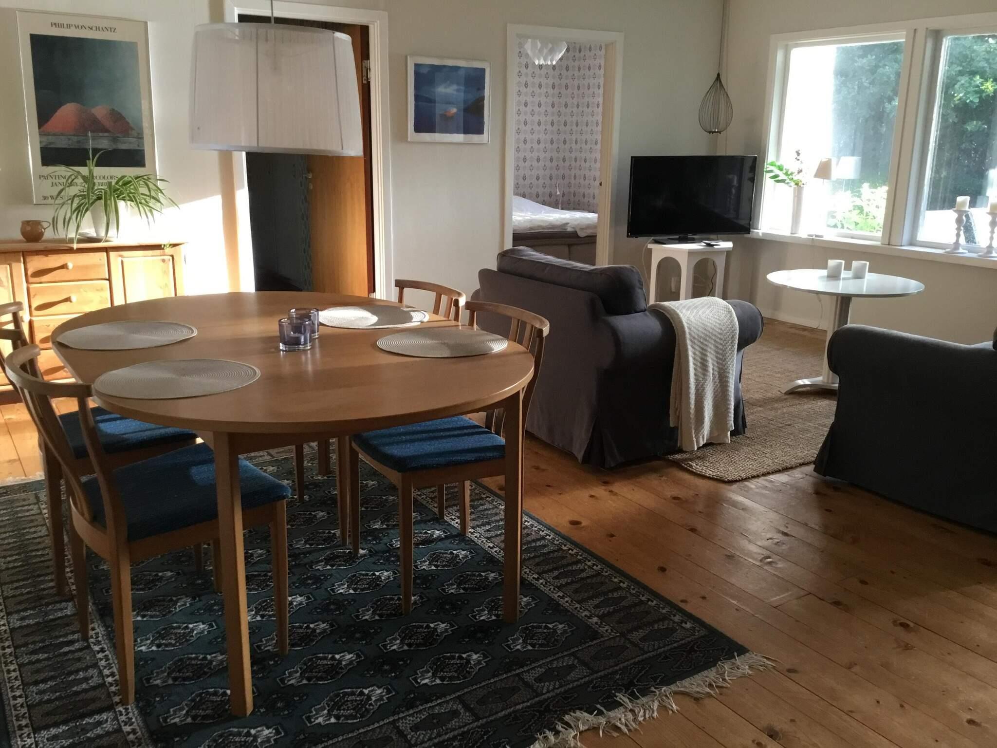 Im Ferienhaus gibt es gleich im Anschluss an die Küche einen offenen, gemütlichen Wohn- und Essbereich mit Fenstern zur Seeseite hin und Ausblick ins Grüne. Außerdem stehen im Haus zwei Schlafzimmer mit jeweils zwei Schlafplätzen lund ein kleineres, helles Bad zur Verfügung.