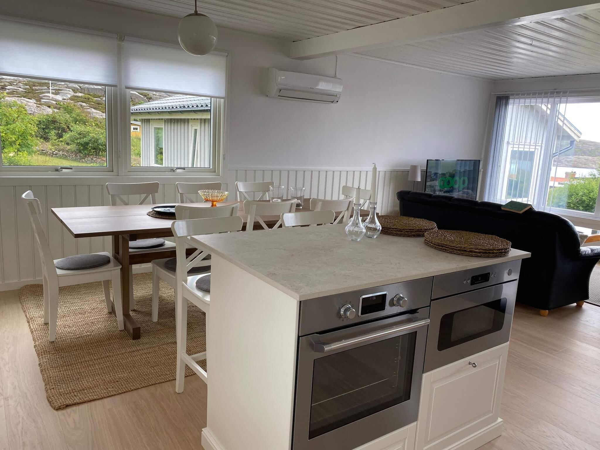 Keine 100 m entfernt befindet sich einer der wenigen Sandstrände von Norra Bohuslän, an dem kleine und große Badegäste auf ihre Kosten kommen. Dorthin führt ein kurzer Spaziergang über die Klippen oder man folgt der Straße hinunter zum Strandufer. Krabbenfischen oder Rutenangeln vom Steg aus möglich, alles zu Fuß erreichbar. In der Hochsaison gibt es unten am Gästehafen, ca. 15 Gehminuten vom Haus entfernt, ein Restaurant sowie eine Minigolfanlage. In der Hochsaison finden an vielen Abenden Veranstaltungen mit Live-Musik statt.