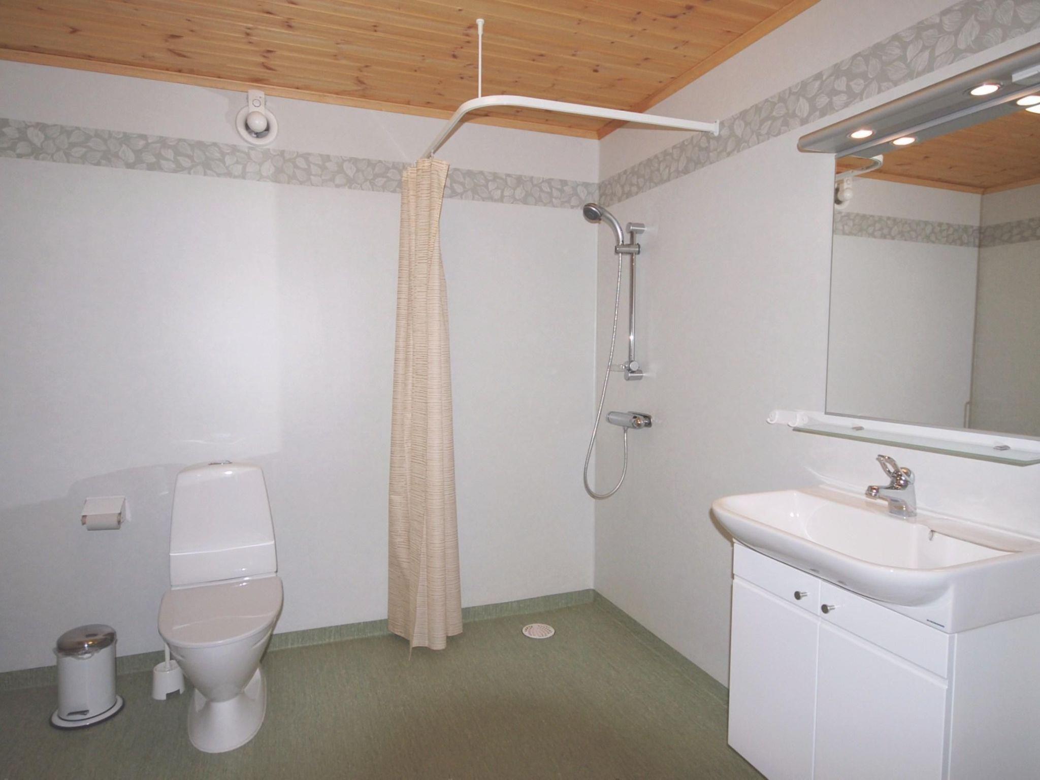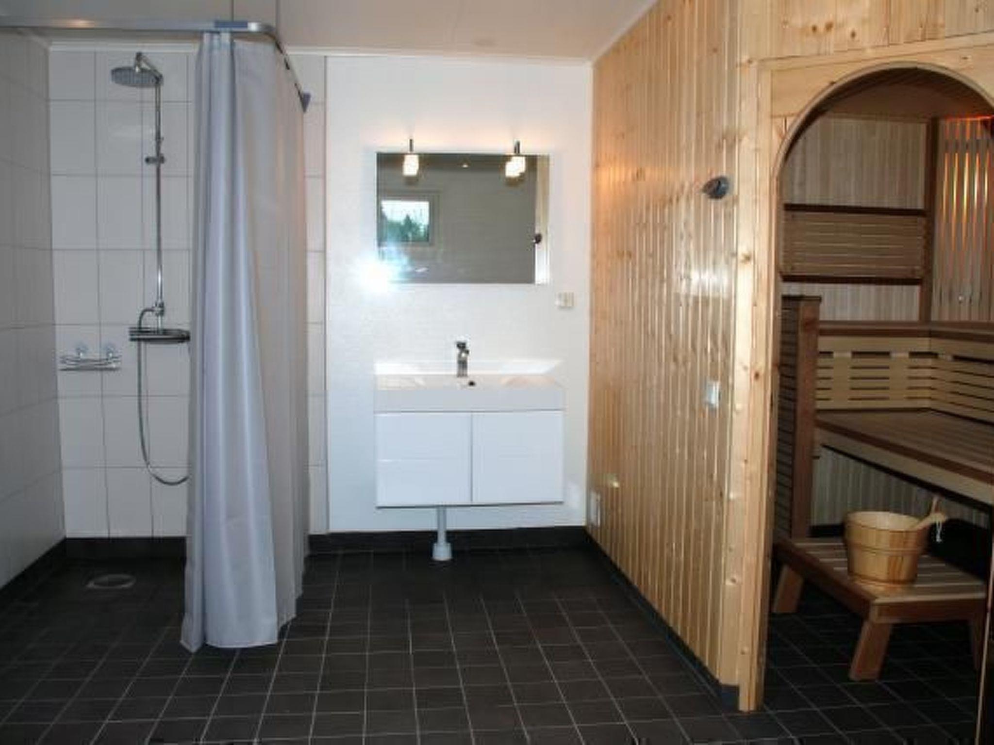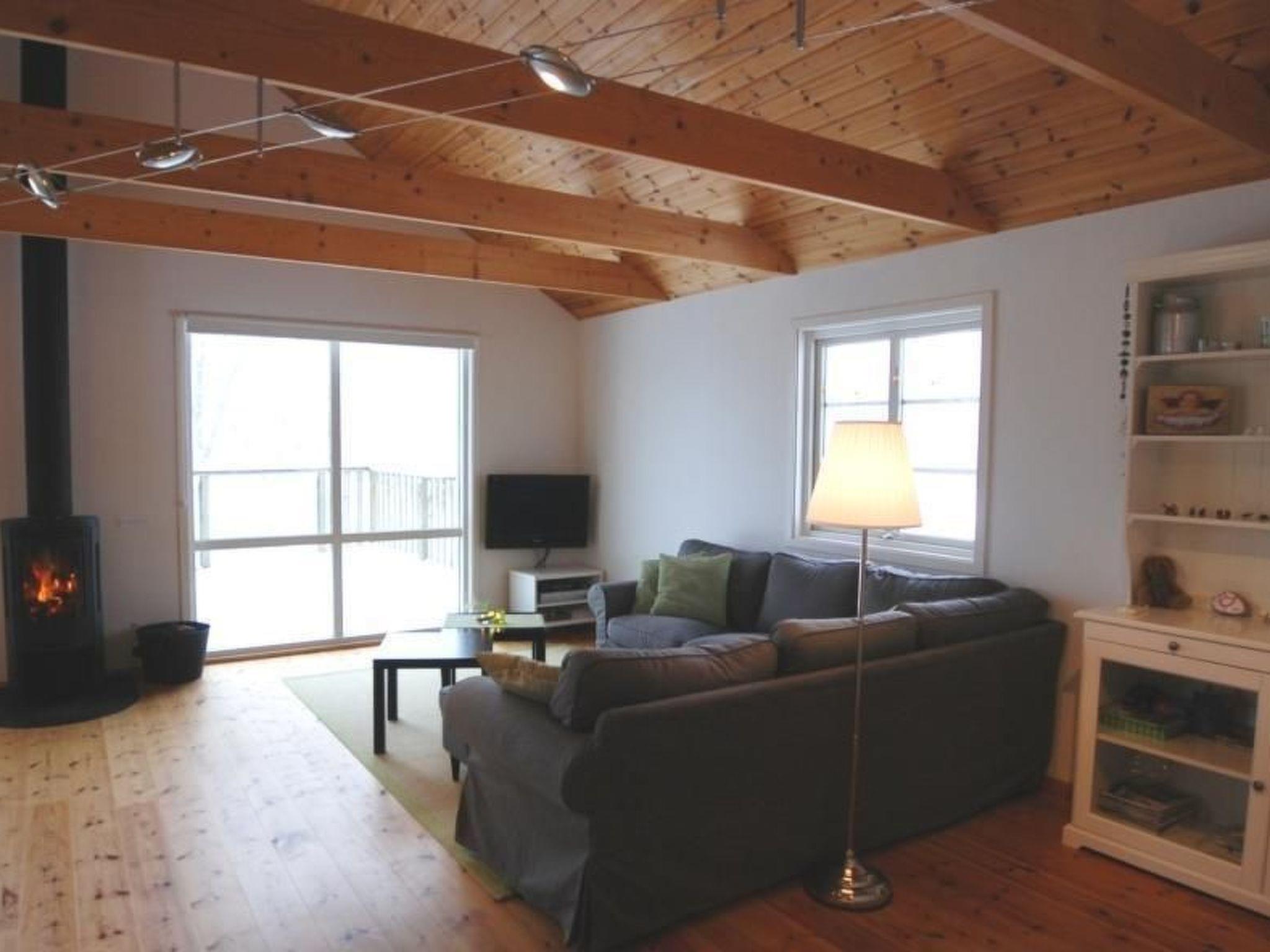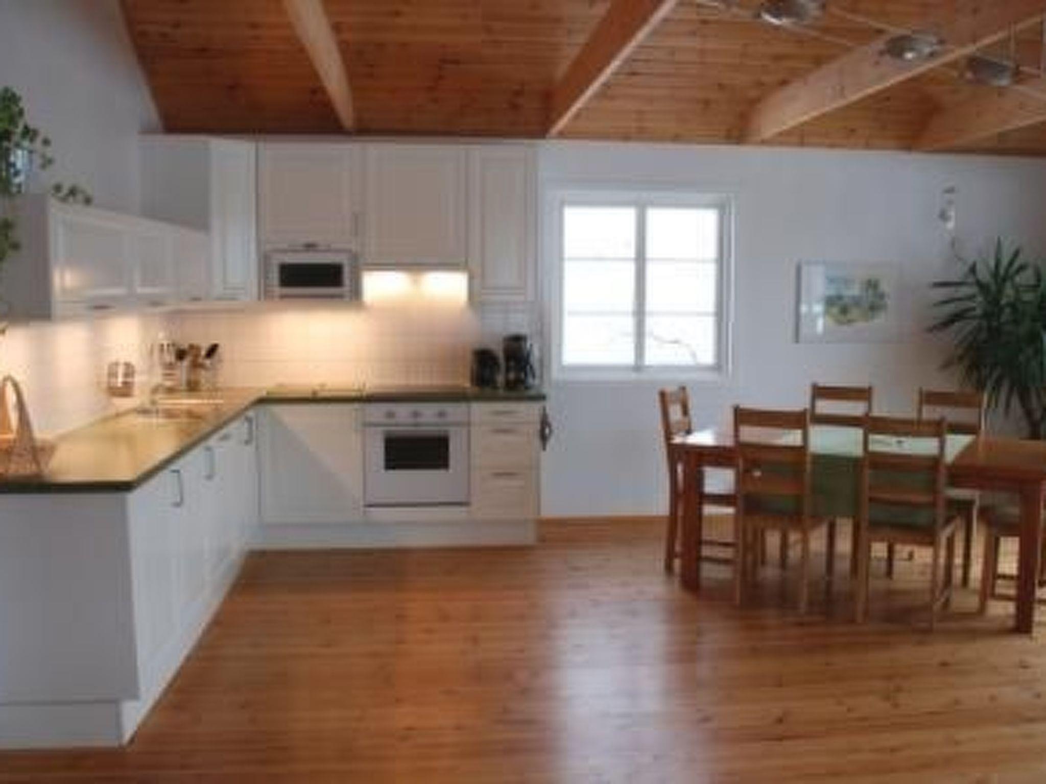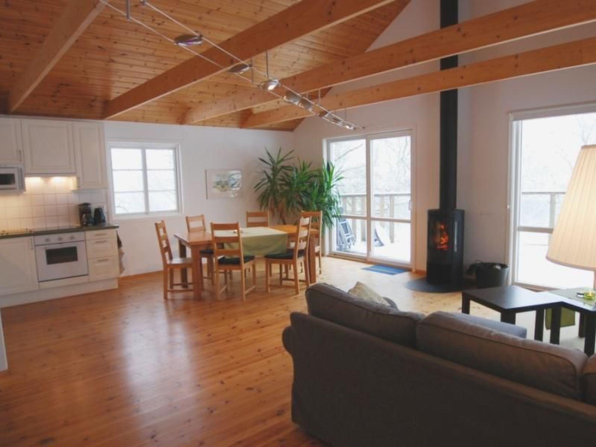 Es ist 95 m² groß und verfügt über zwei Schlafzimmer, die mit jeweils einem Doppelbett ausgestattet sind. In einem der beiden Schlafzimmer befindet sich noch ein drittes Einzelbett für die fünfte Person. Beide Doppelbetten bestehen aus zwei Einzelbetten (90 x 200 cm), die aneinander gekoppelt werden können. Bei Bedarf können diese auch auseinandergeschoben werden. In jedem Schlafzimmer befindet sich ein Heizkörper. Das 45 m² große Wohn-/Esszimmer mit offener Küche lädt zum Verweilen ein. An kühlen Wintertagen kann man dort gemütlich vor dem warmen Kamin sitzen und den Blick durchs Fenster in die Natur schweifen lassen. Die Küche ist mit allen notwendigen Geräten ausgestattet, um nicht nur kochen, sondern auch backen zu können. Wenn es schnell gehen muss, kann man die Mikrowelle benutzen. Nach dem Kochen übernimmt die Spülmaschine die restliche Arbeit, damit einem entspannten Essen nichts mehr im Wege steht. Aber auch das Frühstück kann gut beginnen, dafür sorgen die Kaffeemaschine, der Toaster und der Wasserkocher. Das große Badezimmer verfügt über eine Walk-In-Dusche, ein Waschbecken, ein WC und Fußbodenheizung.