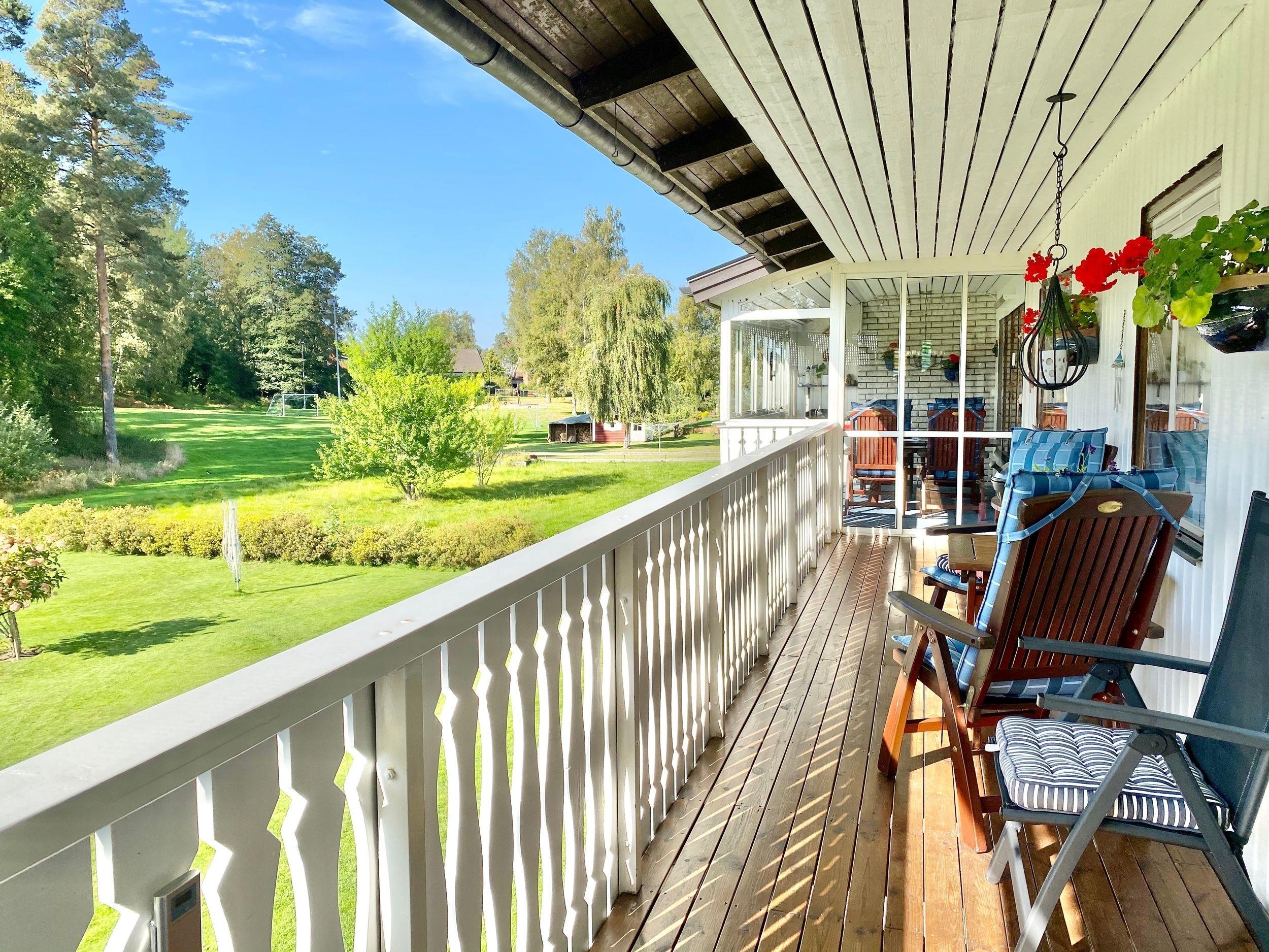 Das Haus bietet eine Garage sowie einen Stellplatz auf der Auffahrt, eine Sauna, 4 Schlafzimmer und 2 Gemeinschaftsräume, einen überdachten Wintergarten, einen großen Balkon, eine Terrasse sowie 500 qm Garten.