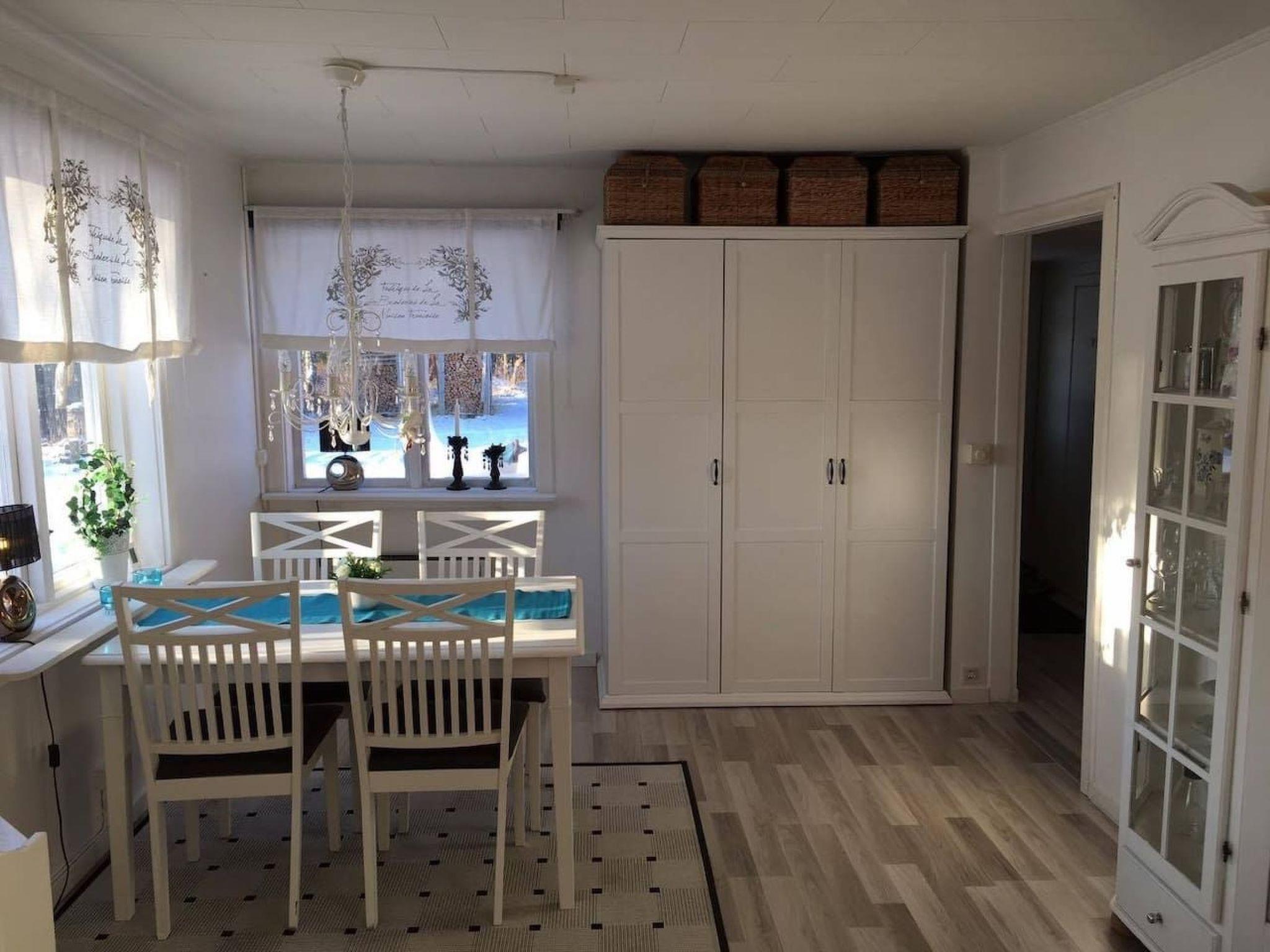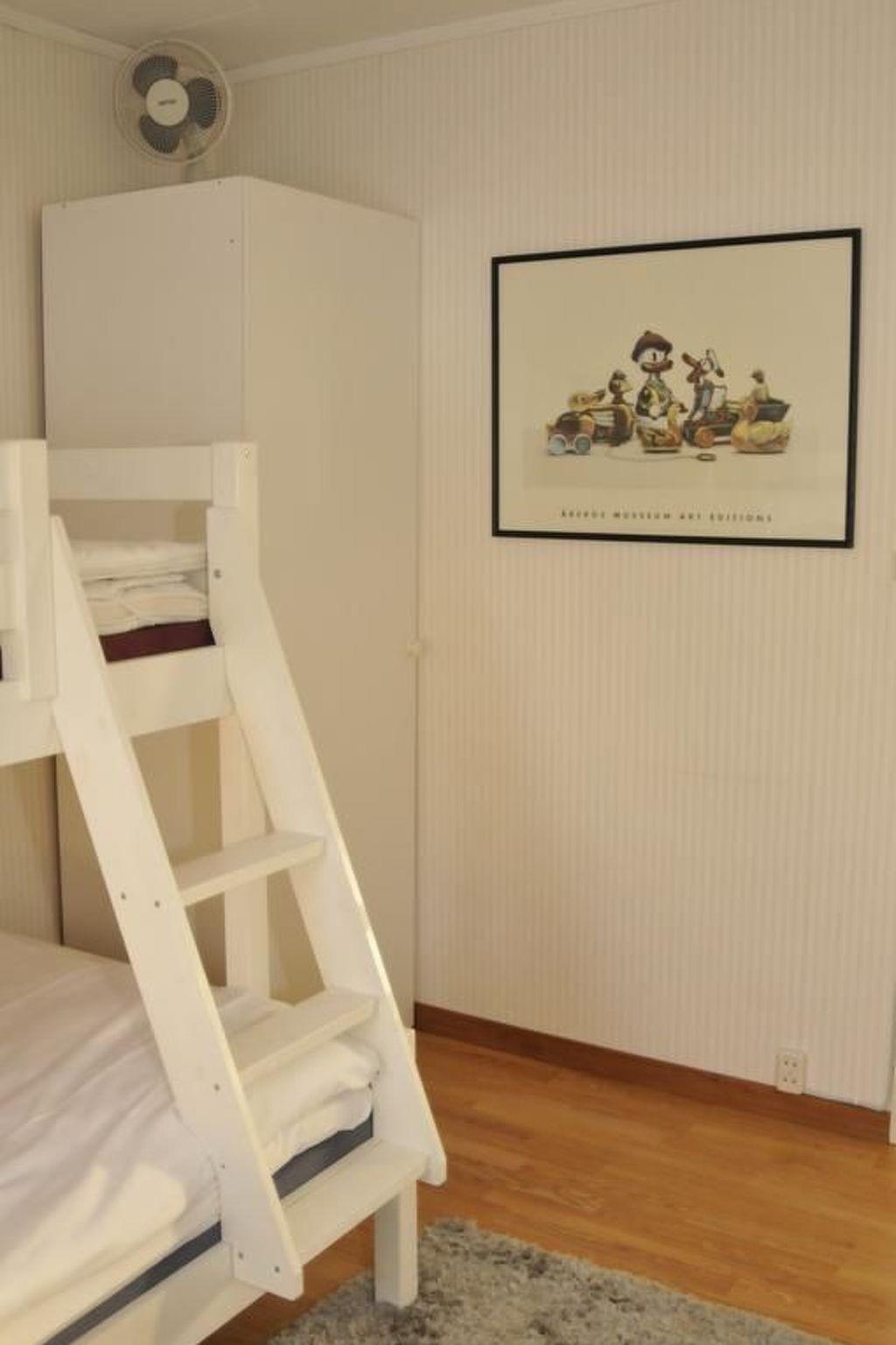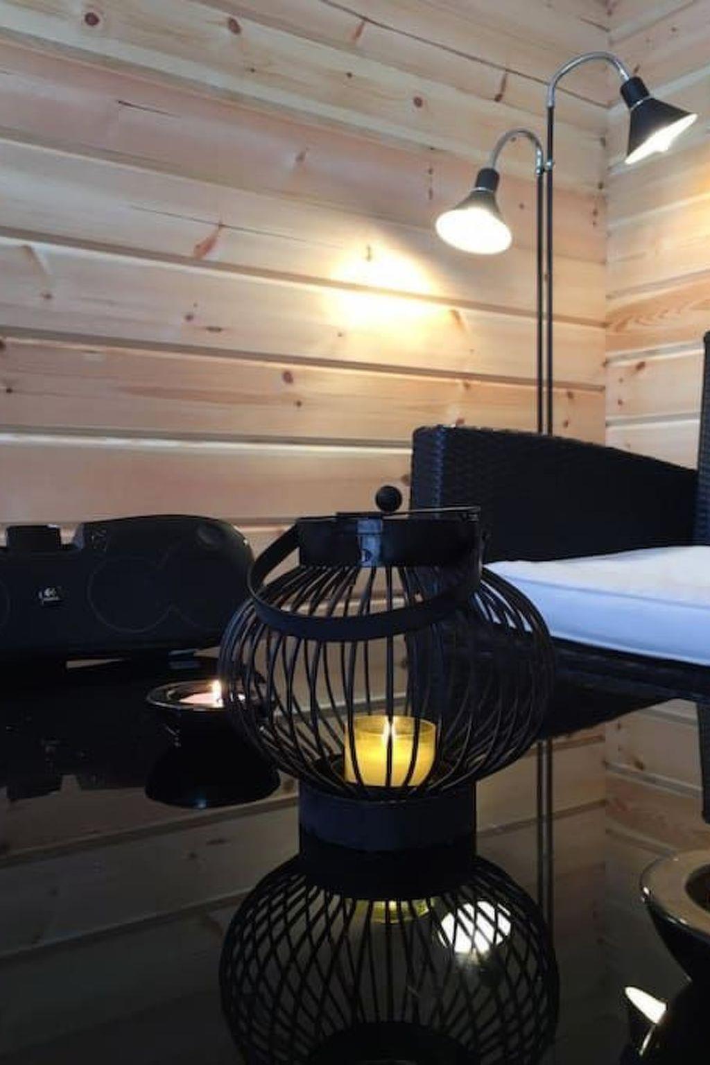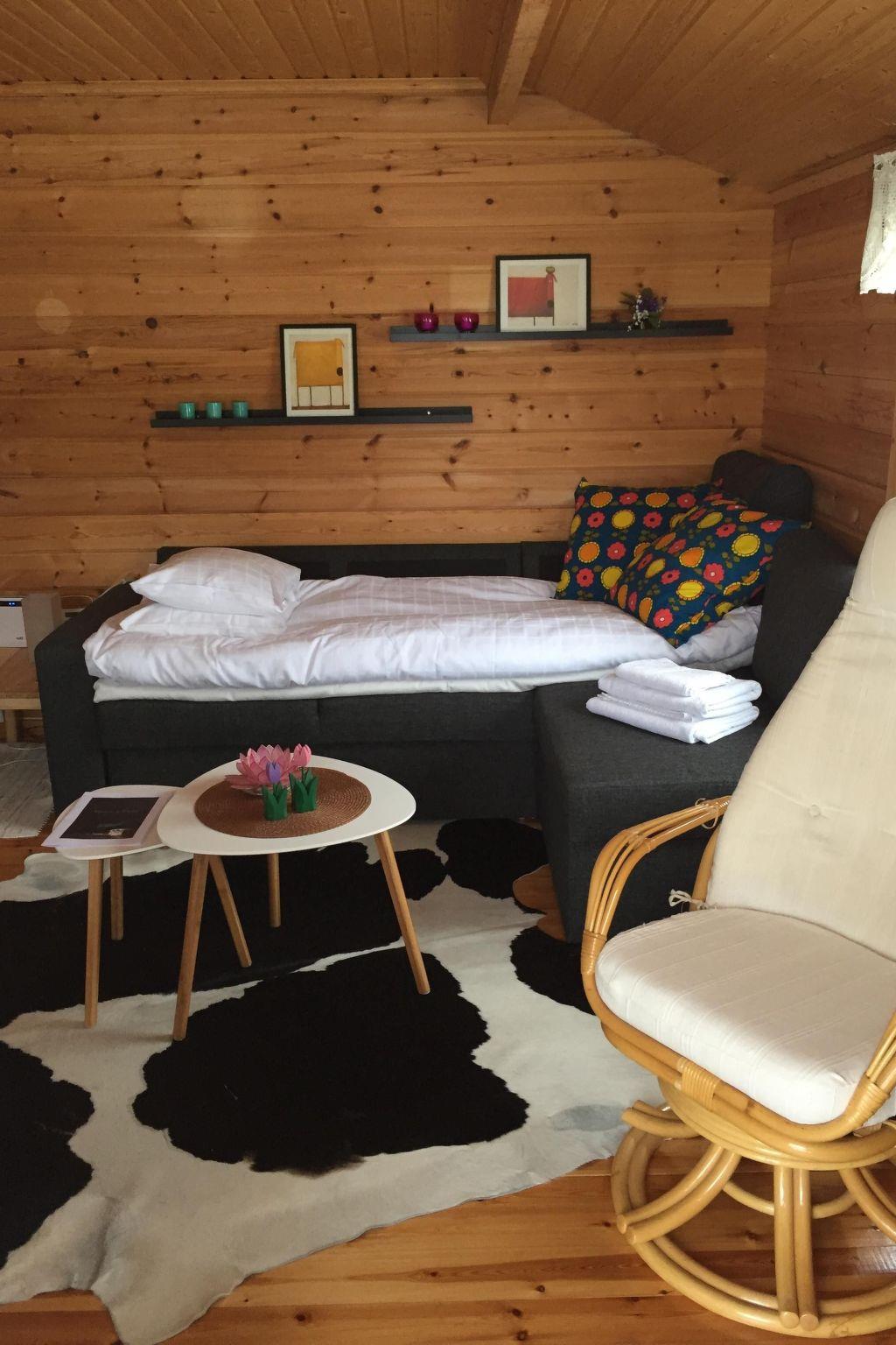 Das Holzhaus bietet Platz für bis zu sieben Personen und verfügt über ein klimatisiertes Wohn- und Esszimmer mit einem Schlafsofa, einem Couchtisch, einem Flachbildfernseher mit schwedischen Sendern, Apple TV, Google Chrome und einem iPad-Anschluss sowie einem Esstisch mit vier Stühlen. Die Küche ist komplett mit allen notwendigen Geräten ausgestattet und verfügt über einen weiteren Esstisch mit vier Stühlen. Das Schlafzimmer ist mit einem Etagenbett, bestehend aus einer 90 x 200cm Matratze und einer 120 x 200cm Matratze, für bis zu drei Personen ausgestattet. Das Badezimmer verfügt über eine Dusche, ein Waschbecken, eine Toilette und eine Waschmaschine mit Trocknerfunktion. Der 15 m² große Anbau besteht aus einem Wohn-Schlafraum mit einem Schlafsofa, einem Sessel, einem Couchtisch, einem Flachbildfernseher, einem Regal und einem Esstisch mit zwei Stühlen. Wi-Fi ist verfügbar.