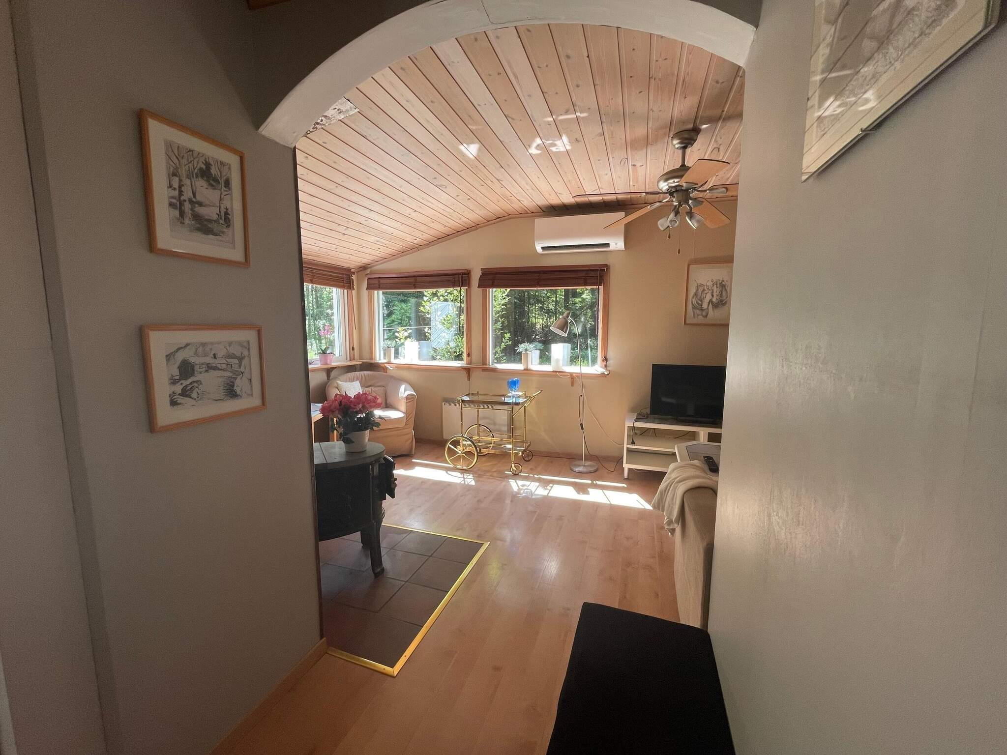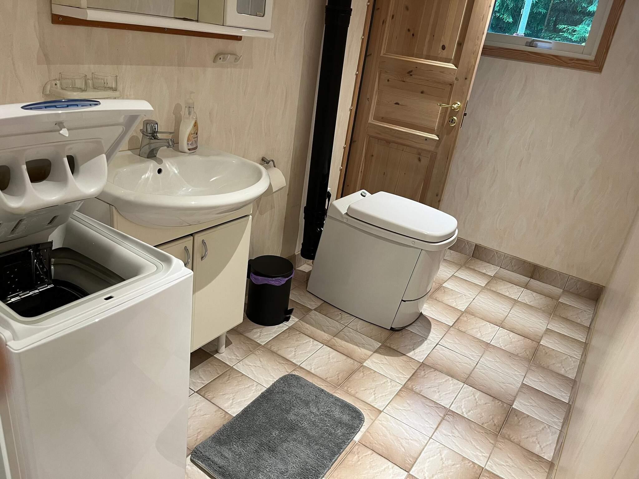Im Inneren finden Sie eine Küche mit Gasherd, Mikrowelle, Kühl-/Gefrierschrank und einer kleinen Spülmaschine sowie einen Esstisch mit Stühlen. Das Schlafzimmer verfügt über ein schmales Doppelbett (140 cm) und das Wohnzimmer lädt mit einem geräumigen Sofa, einem Fernseher mit Chromecast und einem Holzofen, der an kühlen Abenden für Wärme sorgt, zum Entspannen ein. Das Badezimmer verfügt über eine Dusche, eine Verbrennungstoilette, ein Waschbecken und eine Waschmaschine – alles für einen entspannten Aufenthalt.