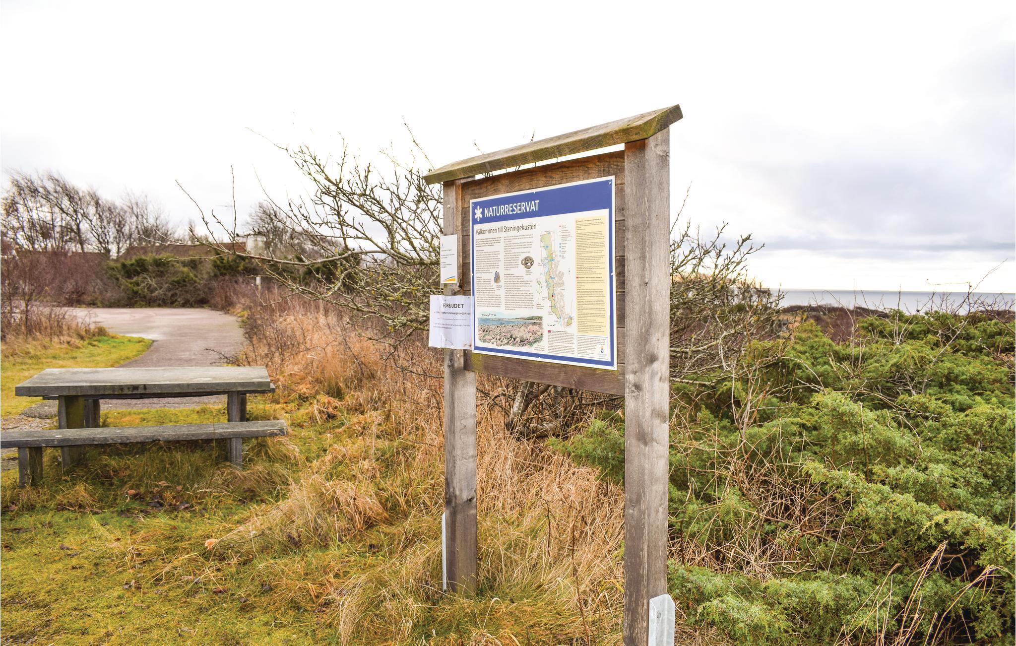 Mit einer Panoramaaussicht auf das Meer erwartet Sie dieses Ferienhaus in Steninge, zwischen Halmstadt und Falkenberg. Es ist geräumig und liegt 500 m vom Meer, dem Sandstrand und den Kippen in der Badebucht. Das Haus liegt hoch und gibt auch den Blick auf das hügelige Naturgrundstück frei. Im sind alle Annehmlichkeiten vorhanden, eine gepflegte Küche, ein offener Wohnraum mit offenem Kamin. Ein Schlafzimmer hat eine Tür auf die Terrasse, es geht auch eine Tür vom Aufenthaltsraum auf die Terrasse, die teilweise unter Dach liegt. Die Natur hier an der Küste ist karg und beeindruckend. Den schönsten Sonnenuntergang erleben man in Steningekusten, so heißt es. Die Naturreservate Enet, Skipsås und Steningekusten liegen in der Nähe. Perfekt wandern können Sie auf den Wegen Prins Bertils und Hallandsleden. Auf dem alten Bahndamm wurde ein Radweg angelegt. Mit SUP, Schnorcheln und Kajaks können Sie die Wasserwelt hier erforschen. Angeln ist im Meer gratis, für Seen brauchen Sie eine Lizenz. Es gibt auch mehrere Golfplätze nahebei. Eine knappe Stunde sind es zum großen Outletcenter Gekås. Ein Minigolfplatz liegt nur ein paar hundert Meter vom Haus.