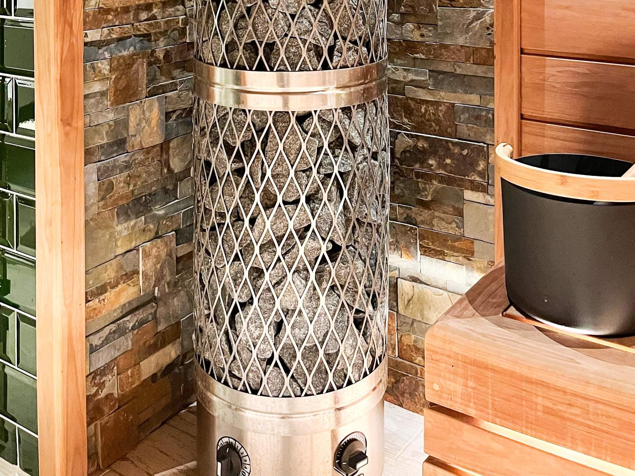 Es gibt vier Schlafzimmer, zwei mit Doppelbetten und zwei mit jeweils einem Einzelbett. Im Erdgeschoss befindet sich ein Zimmer mit Dusche und Waschbecken sowie ein separates WC. Im Obergeschoss befindet sich ein Badezimmer mit Badewanne, Dusche, Waschbecken und WC. Auch eine Sauna ist vorhanden!