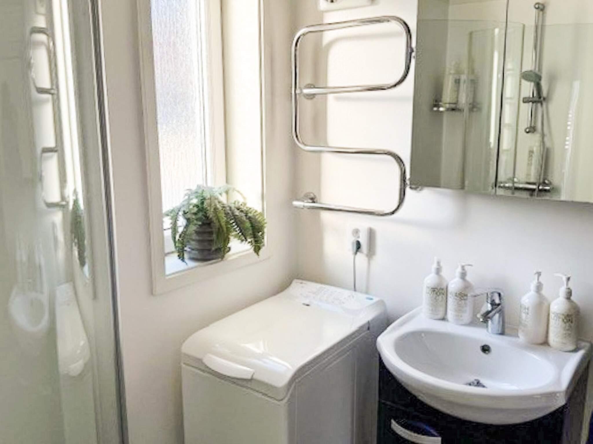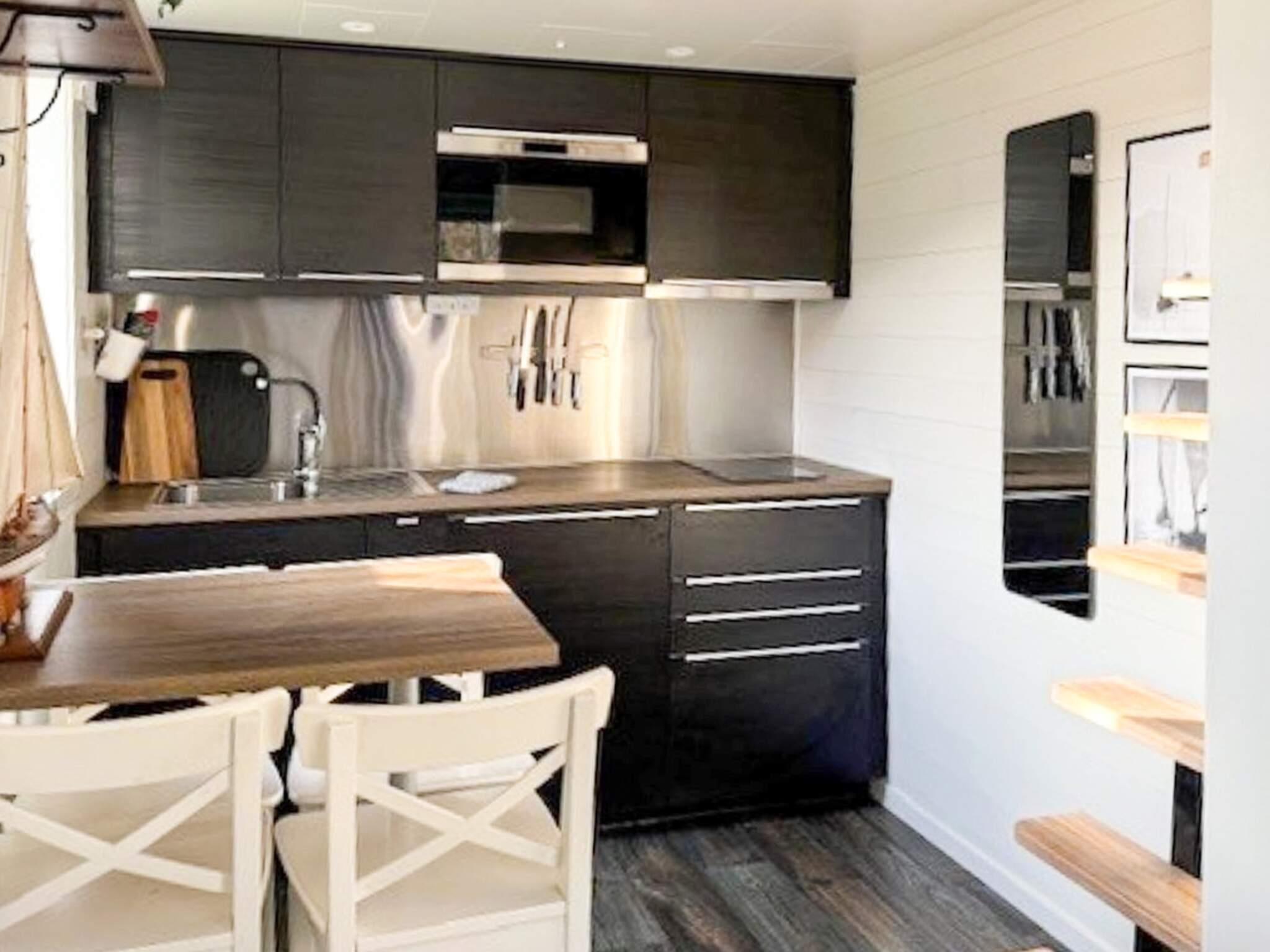Das Loft im Häuschen verfügt über ein bequemes Doppelbett (180 cm). Bitte beachten Sie die niedrige Deckenhöhe und die steilen Stufen zum Loft. Im Wohnzimmer befindet sich ein Schlafsofa (160 cm), das Platz für zwei weitere Gäste bietet. Die kompakte, aber moderne Küchenzeile mit Kochplatten, Mikrowelle und Spüle eignet sich perfekt zum einfachen Kochen. Das Badezimmer ist frisch und modern und verfügt über Dusche, WC, Fußbodenheizung und einen kombinierten Waschtrockner. Für zusätzlichen Komfort sorgen eine Klimaanlage an heißen Sommertagen und ein Fernseher mit Chromecast für entspannte Abende.