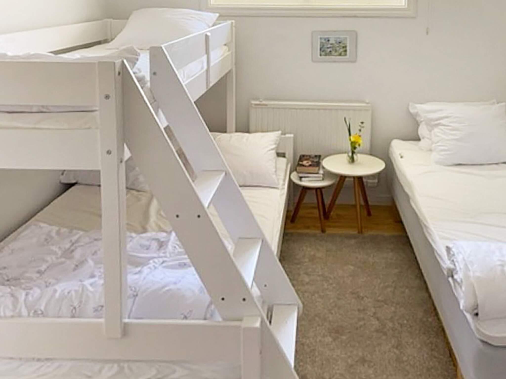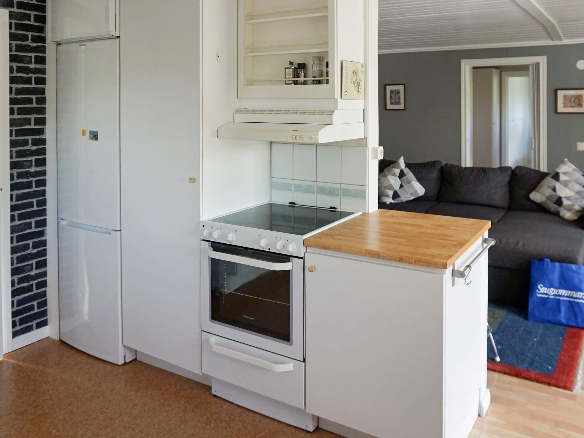 Das Ferienhaus liegt etwas erhöht auf einem Rasengrundstück in Hanglage und bietet von seiner schönen Holzveranda herrliche Aussicht ins Grüne. Der Eingang auf der Veranda führt direkt in das Wohnzimmer des Ferienhauses, mit dem offenen Küchen-/Essbereich gleich nebenan. Zur Ausstattung gehören ein Holzofen sowie freies WLAN. Außerdem stehen zwei Schlafzimmer sowie ein Badezimmer mit ebenerdiger Dusche und einer Waschmaschine zur Verfügung. Der fünfte Schlafplatz befindet sich im Wohnzimmer.
