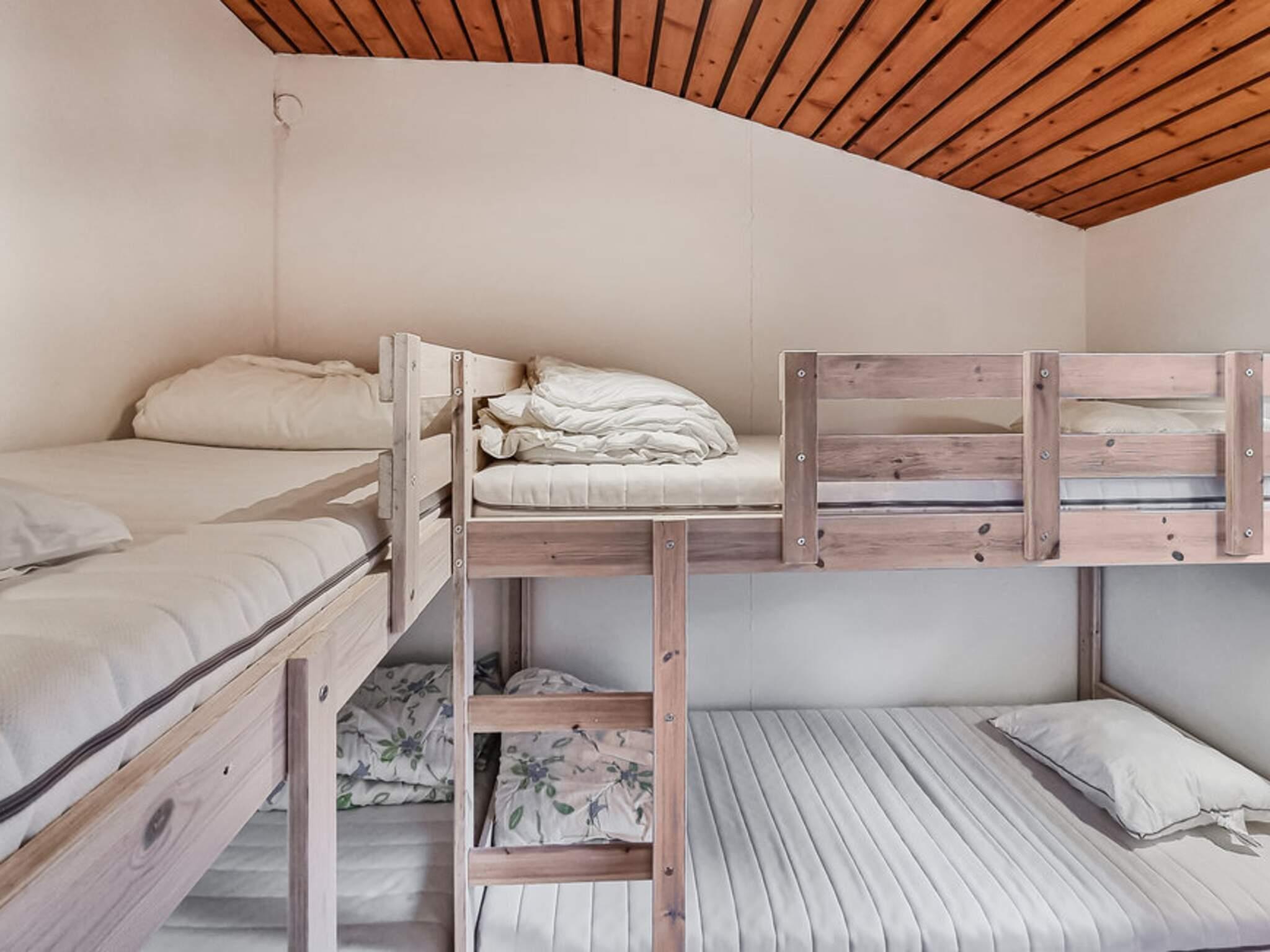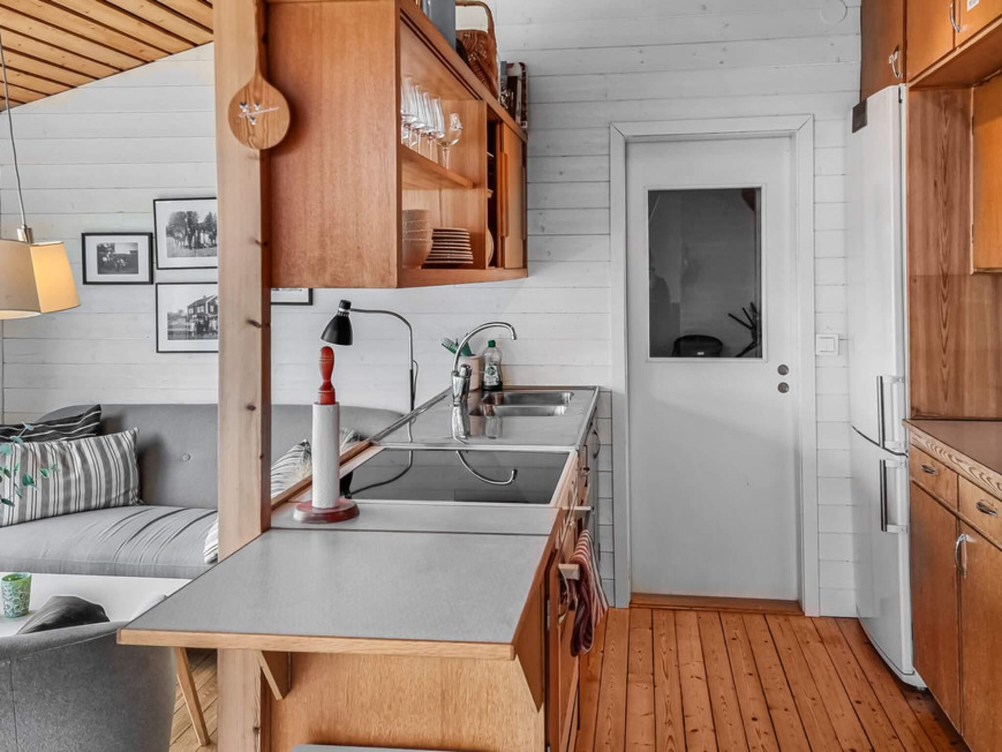 Das gemütliche und sonnige Ferienhaus liegt auf einem Hügel mit Kiefernwald und bietet von Küche, Wohnzimmer und Nebengebäude aus einen unverbauten Blick auf das salzige Meer. Der Eingang führt in den Flur und weiter in einen offenen Raum mit großen Panorama-Schiebefenstern mit Meerblick, den Sie bei jedem Wetter genießen können. Das Wohnzimmer verfügt sowohl über einen Essbereich als auch eine gemütliche Sitzecke sowie einen Holzofen und einen Kamin. Die offene Küche ist mit Herd, Mikrowelle, Kühl-/Gefrierschrank und Kaffeemaschine ausgestattet. Angrenzend an die Küche befindet sich ein kleiner Raum mit Geschirrspüler und Waschmaschine. Das Ferienhaus verfügt außerdem über zwei Schlafzimmer, eines mit einem bequemen Doppelbett und eines mit vier Etagenbetten auf zwei Ebenen, sowie ein Badezimmer mit Dusche.