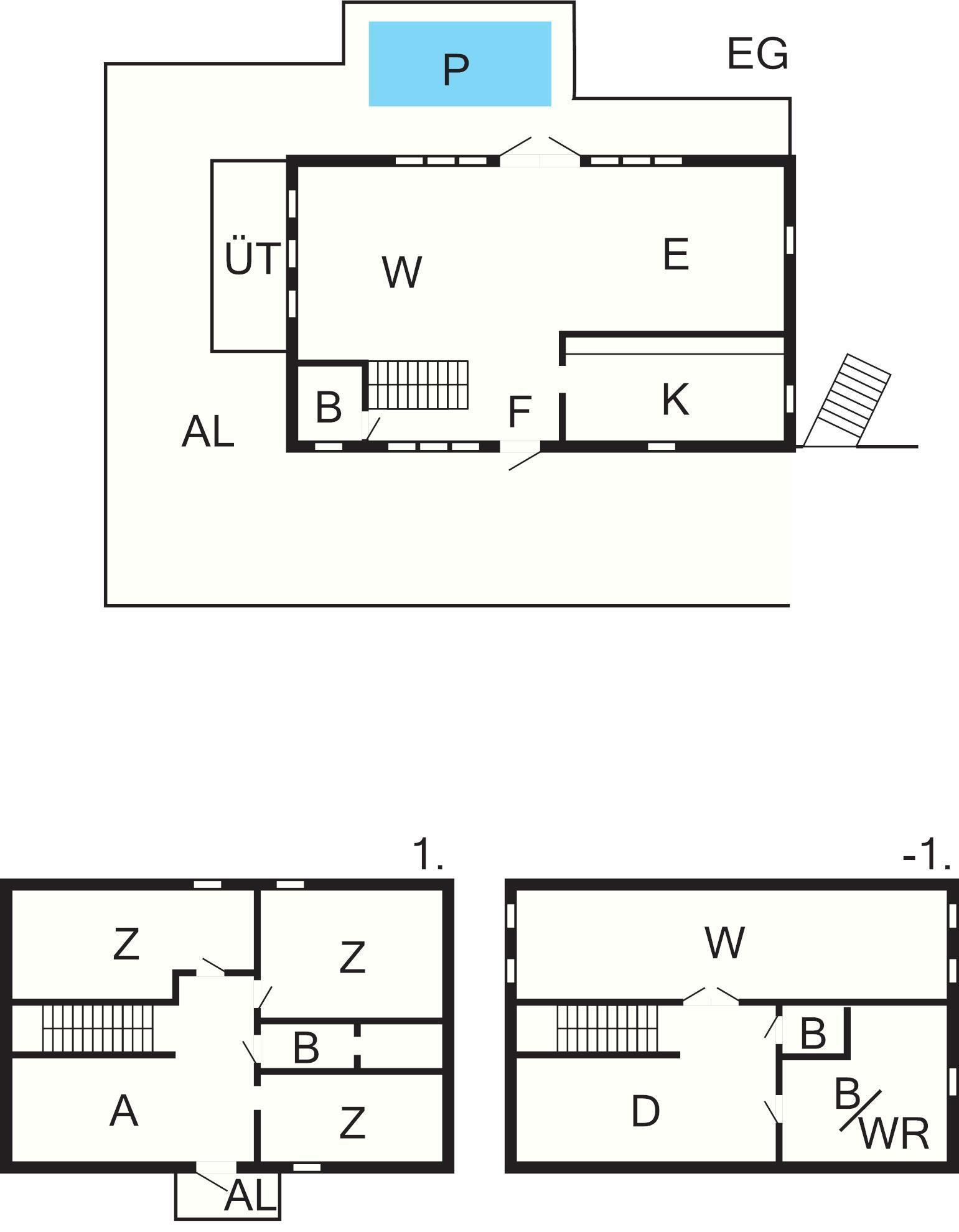 Von der Diele führt eine Treppe in den ersten Stock mit drei Schlafzimmern: eines mit Doppelbett, eines mit zwei Einzelbetten und eines mit drei Einzelbetten. Außerdem gibt es eine Schlafnische mit einem 140 cm breiten Bett und ein weiteres WC. Vom Flur aus gelangen Sie auf einen Balkon mit Sofa.