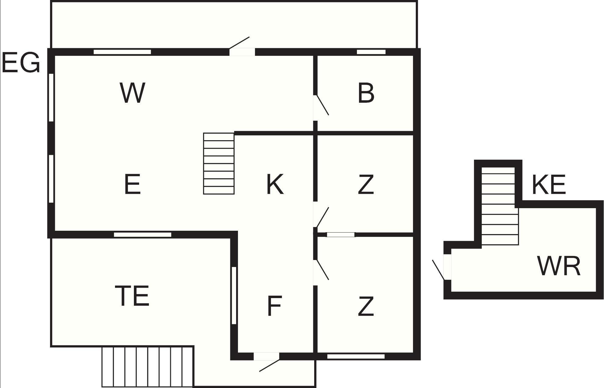 Über eine Treppe gelangen Sie in eine großzügige Halle. Direkt rechts davon befindet sich ein Schlafzimmer mit einem Doppelbett (2x90cm). Hier gibt es guten Stauraum in Form eines Kleiderschranks und einer Kommode. Draußen befindet sich eine offene Küche, die mit dem Wohnzimmer mit Schlafsofa (120 cm), TV und Essbereich integriert ist.