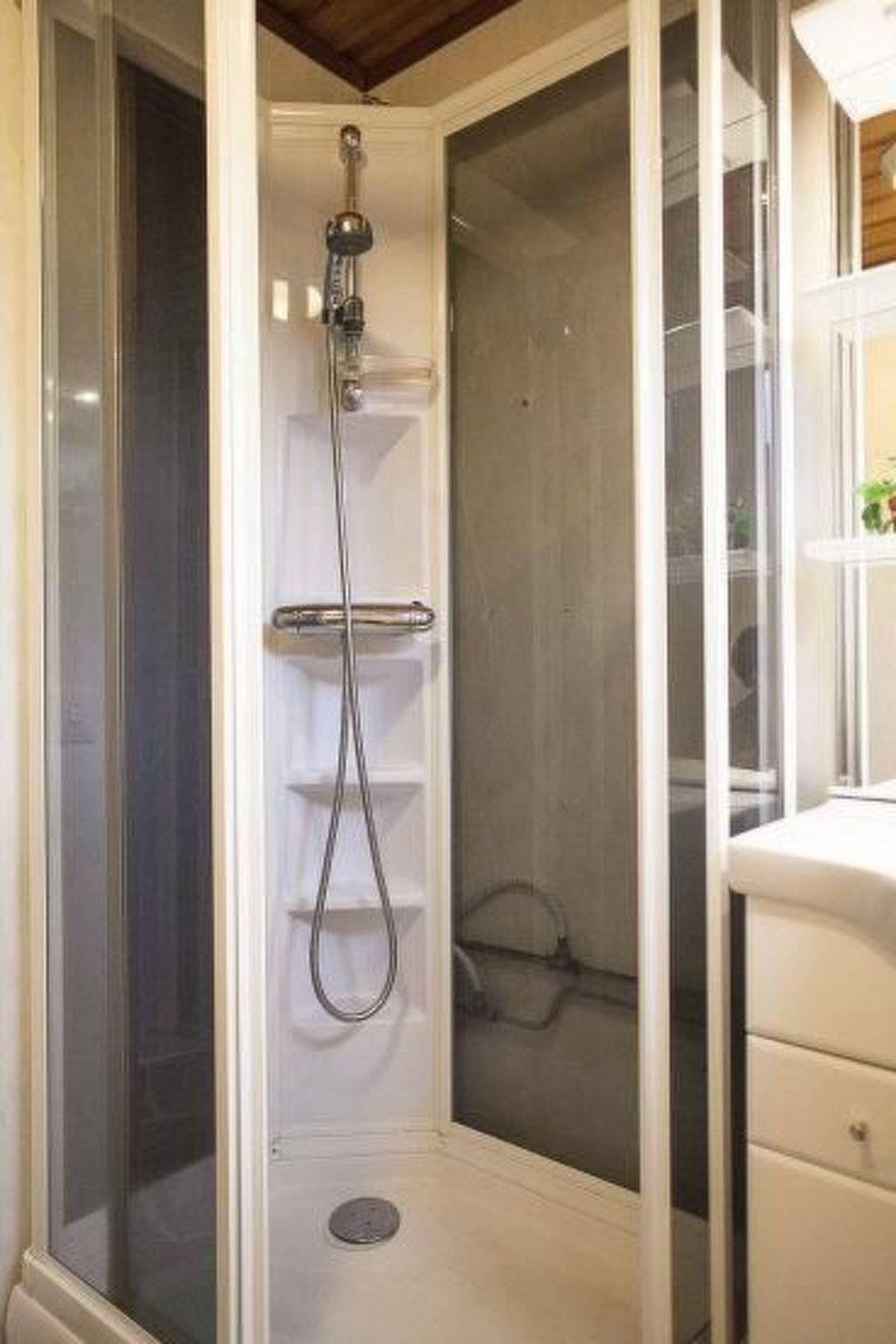 Der großzügige Wohnraum mit einem Specksteinofen verfügt über ein Smart-TV in 85 Zoll mit DVD-Player, Sat.-TV (Deutsch), Massagesessel sowie über einen Heimtrainer. In der Küche ist neben einem Induktionsherd, Mikrowelle, Spülmaschine, Kühl- Gefrierschrank, Toaster, Kaffeemaschine, etc. alles vorhanden. Im Haushaltsraum finden Sie neben der Waschmaschine auch ein Bügelbrett mit Bügeleisen. Das Bad mit Dusche, Waschbecken und WC befindet sich im hinteren Teil des Hauses. Die komplette Raumaufteilung können Sie dem Grundriss entnehmen. Alle Räume sind ebenerdig über eine dreistufige Außentreppe begehbar.