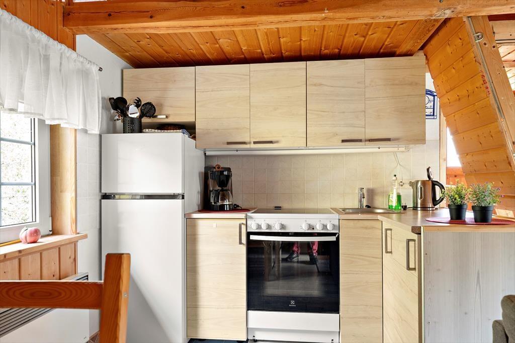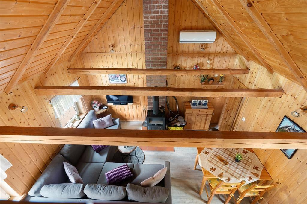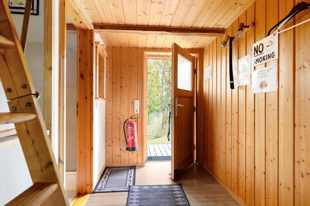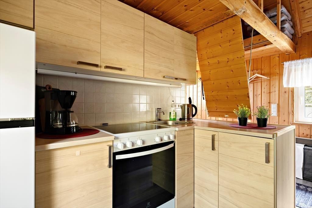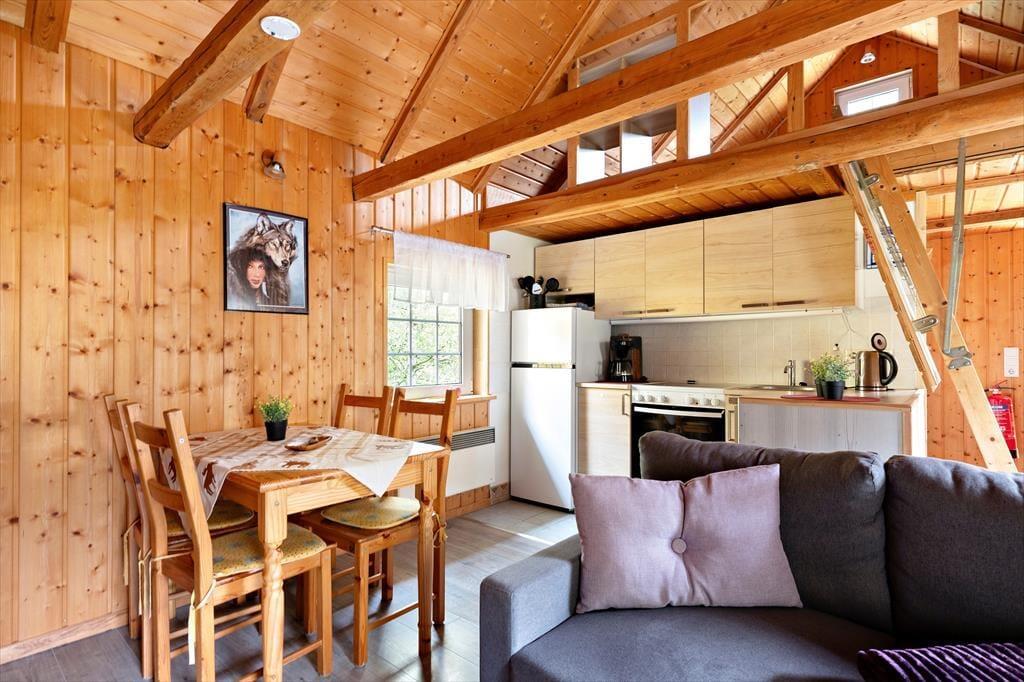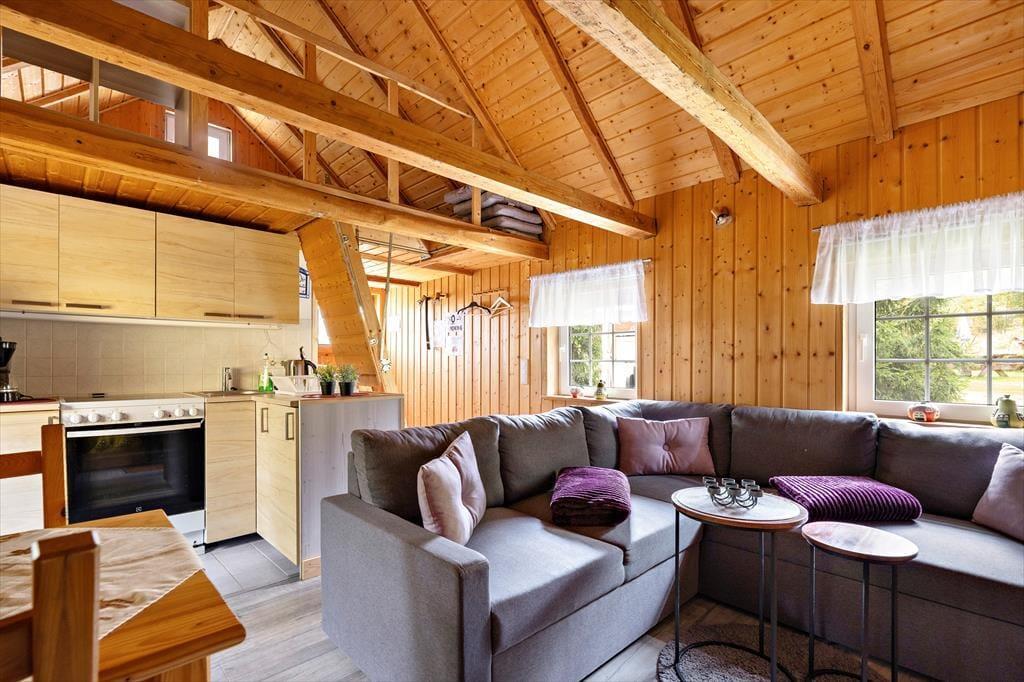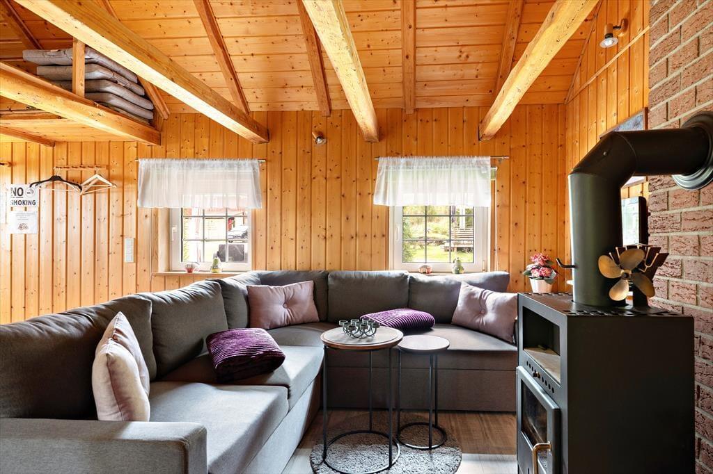 Auf 45 m² bietet das Haus bis zu 4 Personen bequem Platz. Gegen einen Zuschlag von jeweils 25 EUR sind auch zwei Hunde willkommen. Sie betreten das Haus über einen Eingangsbereich, von dem aus Sie auch das Badezimmer mit WC und Duschkabine erreichen. Dahinter öffnet sich der Wohnbereich samt offen integrierter Küche und einem Esstisch. Der Wohnbereich bietet dank der giebelhohen Decken ein hervorragendes Raumgefühl. Auf dem großen Ecksofa vor dem Flachbildfernseher mit deutschen Programmen oder dem knisternden Kaminofen entspannen, der den Wohnraum in wohlige Wärme hüllt. Alternativ steht auch eine energiesparende Luft-Luft-Wärmepumpe mit Kühlfunktion zur Verfügung. Die Küche bietet neben einem großem Kühlschrank mit separatem Gefrierfach, Ofen, Herd, Filterkaffeemaschine und Wasserkocher ausreichend Ausstattung zur Zubereitung und zum Servieren von Mahlzeiten für 4 Urlaubsgäste.
