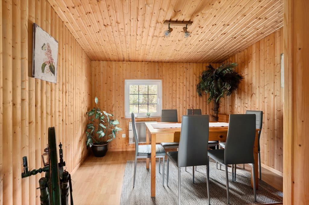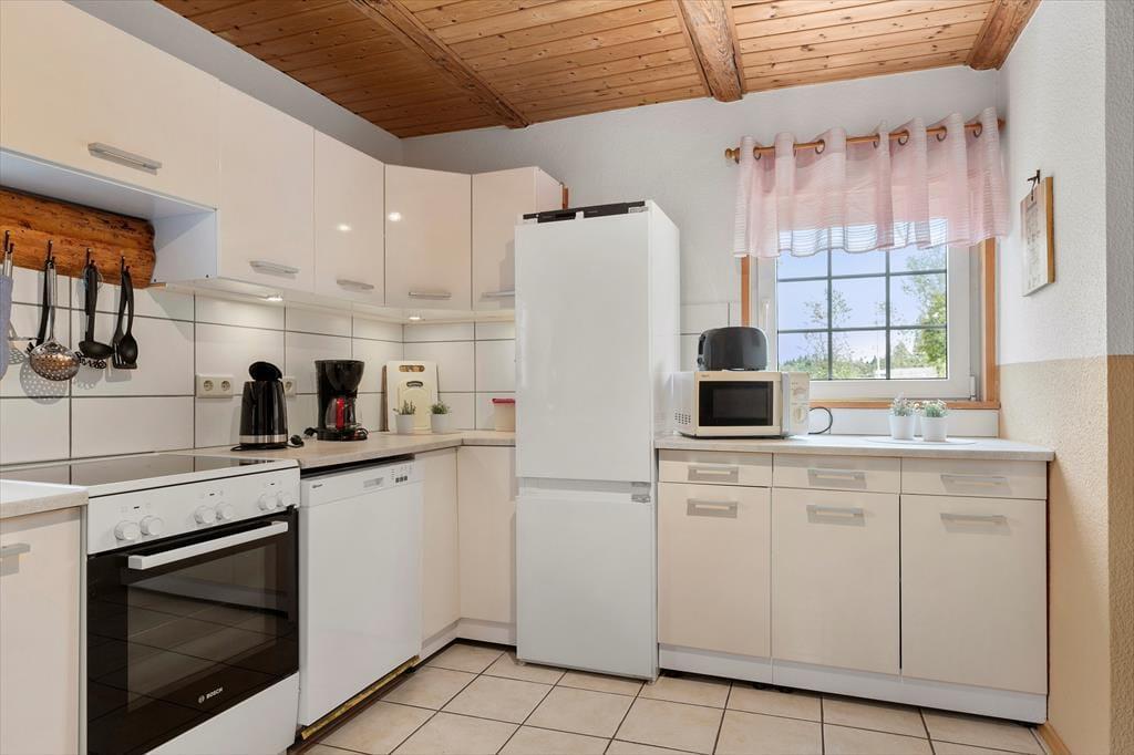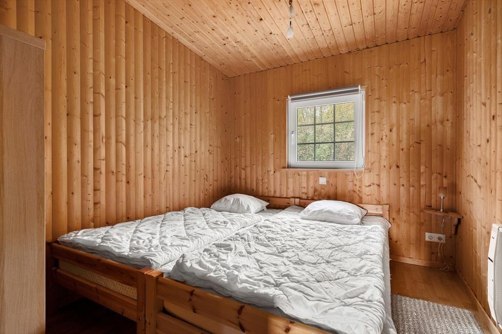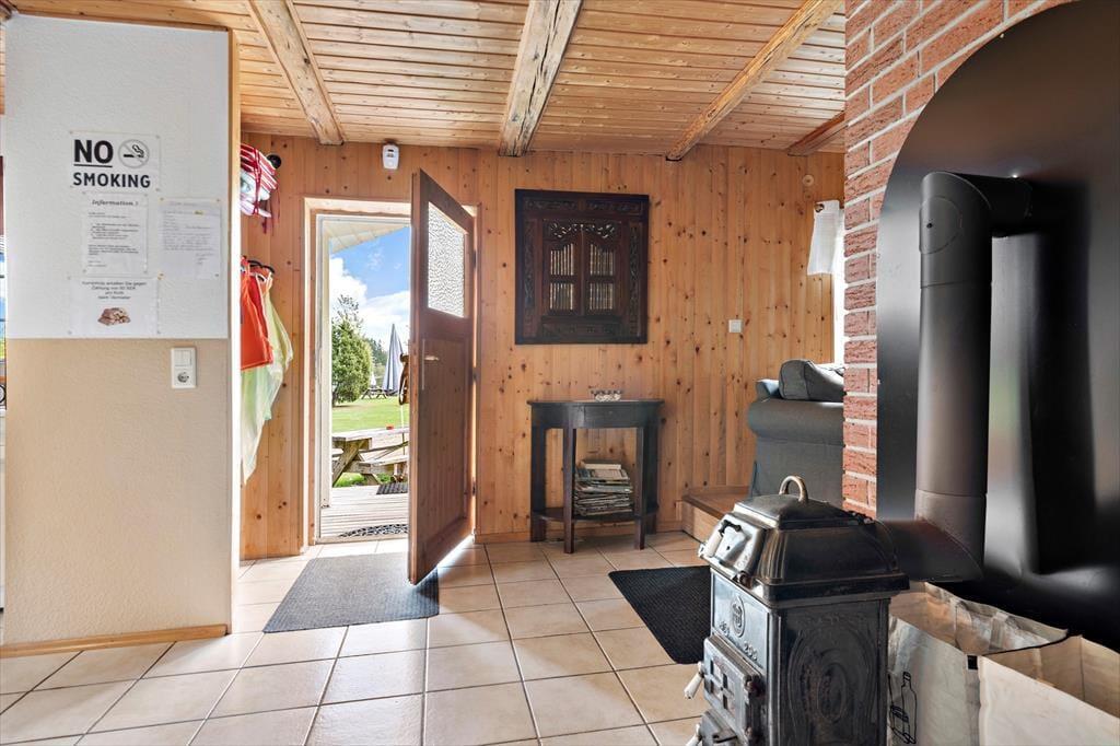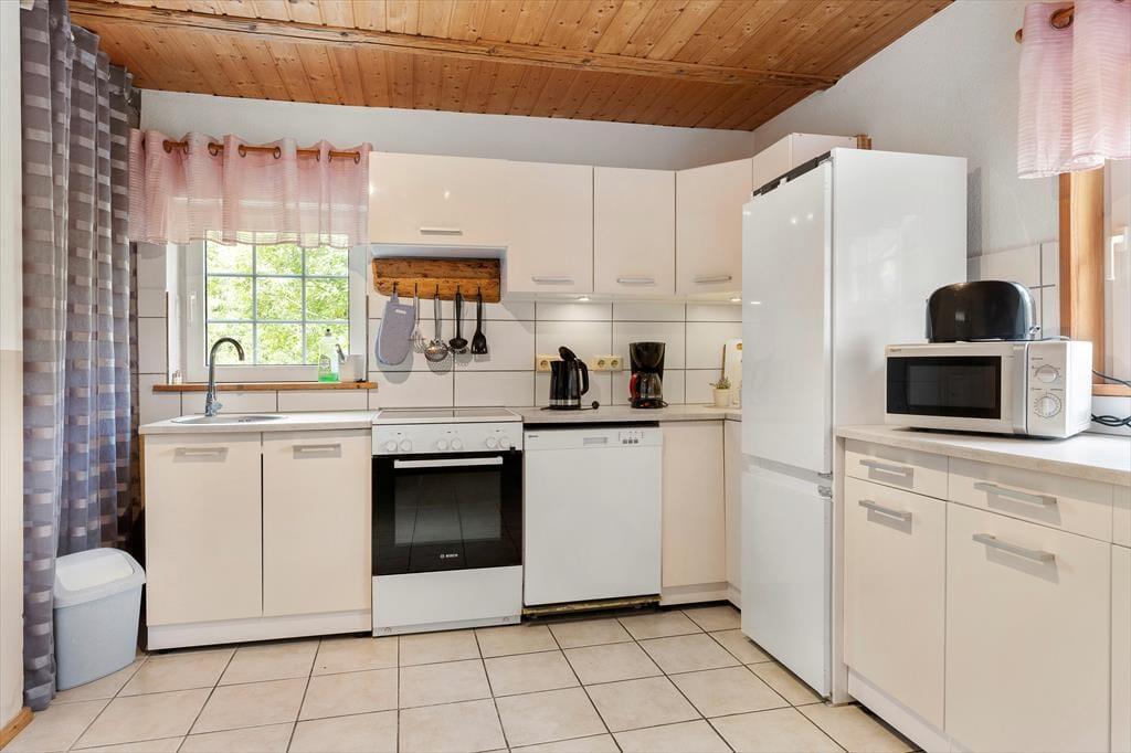 Auf 85 m² bietet das Haus bis zu 6 Personen bequem Platz. Gegen einen Zuschlag von jeweils 25 EUR sind auch zwei Hunde willkommen. Sie betreten das Haus über die hölzerne Veranda und gelangen in einen großen Eingangsbereich, der zur Linken ins Wohnzimmer, zur Rechten in die Küche und ins Badezimmer und geradeaus ins erste Schlafzimmer führt. Im Wohnzimmer können Sie sich auf dem großen Ecksofa vor dem Flachbildfernseher mit deutschen Kanälen oder vor dem prasselnden Kaminofen entspannen, der den Raum in wohlige Wärme hüllt. Durch das Wohnzimmer gelangen Sie von der Küche ins Esszimmer. Die Küche beinhaltet neben einem Kühlschrank mit separatem Gefrierfach, Ofen, E-Herd, Geschirrspüler, Filterkaffeemaschine, Toaster, Wasserkocher und Mikrowelle alles, was Sie zum Zubereiten und Servieren von gängigen Gerichten für 6 Personen benötigen. Das Badezimmer umfasst ein WC, eine Dusche und eine Waschmaschine. Das Schlafzimmer im Erdgeschoss verfügt über zwei Einzelbetten, die bedarfsweise auch zu einem Doppelbett zusammengeschoben werden können. Vom Eingangsbereich führt eine Treppe ins Obergeschoss, in dem Sie auf zwei weitere, einander gegenüberliegende Schlafzimmer treffen. Eines ist mit einem Doppelbette und das andere mit zwei Einzelbetten eingerichtet, die ebenfalls zu einem Doppelbett zusammengeschoben werden können.