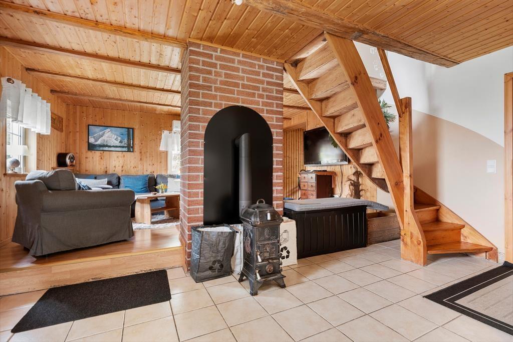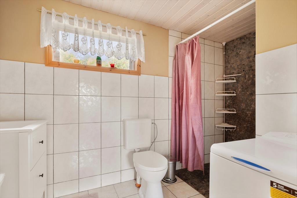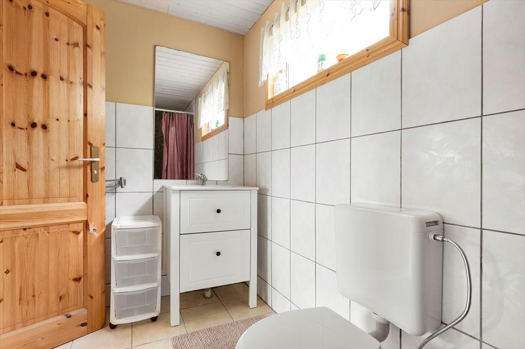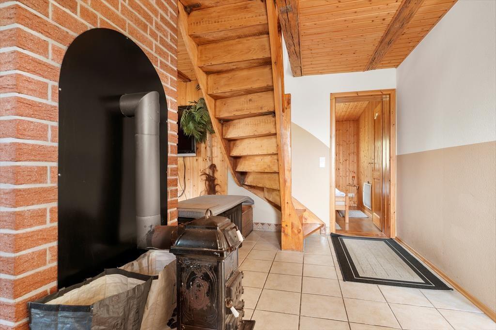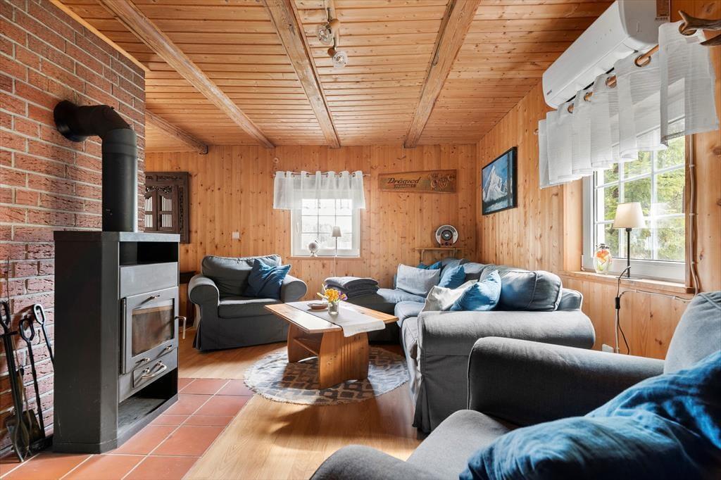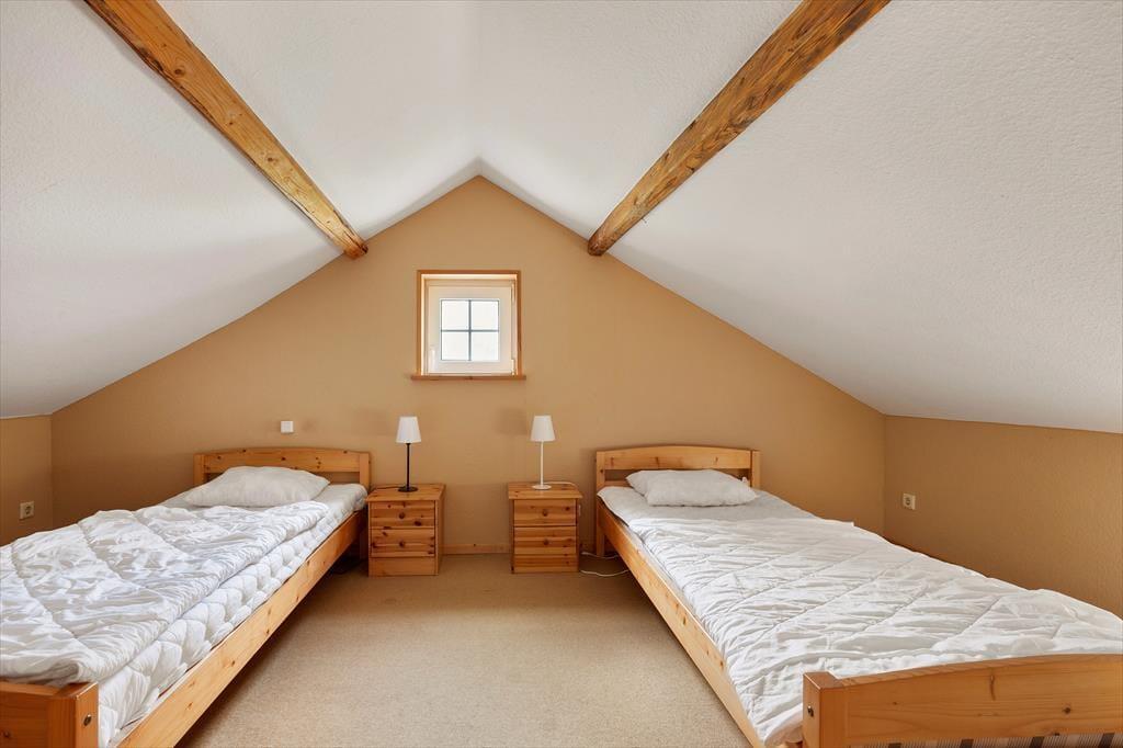 Auf 85 m² bietet das Haus bis zu 6 Personen bequem Platz. Gegen einen Zuschlag von jeweils 25 EUR sind auch zwei Hunde willkommen. Sie betreten das Haus über die hölzerne Veranda und gelangen in einen großen Eingangsbereich, der zur Linken ins Wohnzimmer, zur Rechten in die Küche und ins Badezimmer und geradeaus ins erste Schlafzimmer führt. Im Wohnzimmer können Sie sich auf dem großen Ecksofa vor dem Flachbildfernseher mit deutschen Kanälen oder vor dem prasselnden Kaminofen entspannen, der den Raum in wohlige Wärme hüllt. Durch das Wohnzimmer gelangen Sie von der Küche ins Esszimmer. Die Küche beinhaltet neben einem Kühlschrank mit separatem Gefrierfach, Ofen, E-Herd, Geschirrspüler, Filterkaffeemaschine, Toaster, Wasserkocher und Mikrowelle alles, was Sie zum Zubereiten und Servieren von gängigen Gerichten für 6 Personen benötigen. Das Badezimmer umfasst ein WC, eine Dusche und eine Waschmaschine. Das Schlafzimmer im Erdgeschoss verfügt über zwei Einzelbetten, die bedarfsweise auch zu einem Doppelbett zusammengeschoben werden können. Vom Eingangsbereich führt eine Treppe ins Obergeschoss, in dem Sie auf zwei weitere, einander gegenüberliegende Schlafzimmer treffen. Eines ist mit einem Doppelbette und das andere mit zwei Einzelbetten eingerichtet, die ebenfalls zu einem Doppelbett zusammengeschoben werden können.