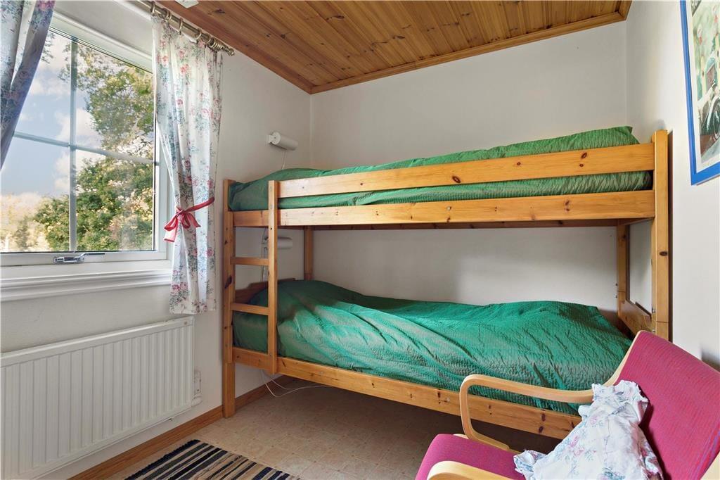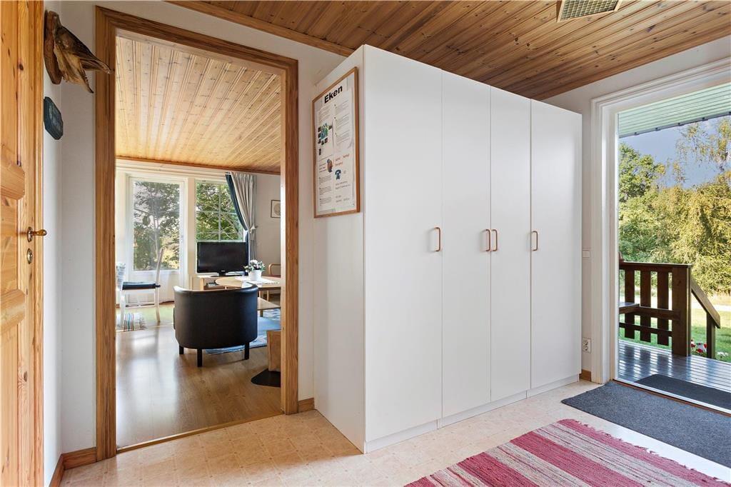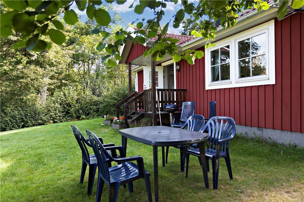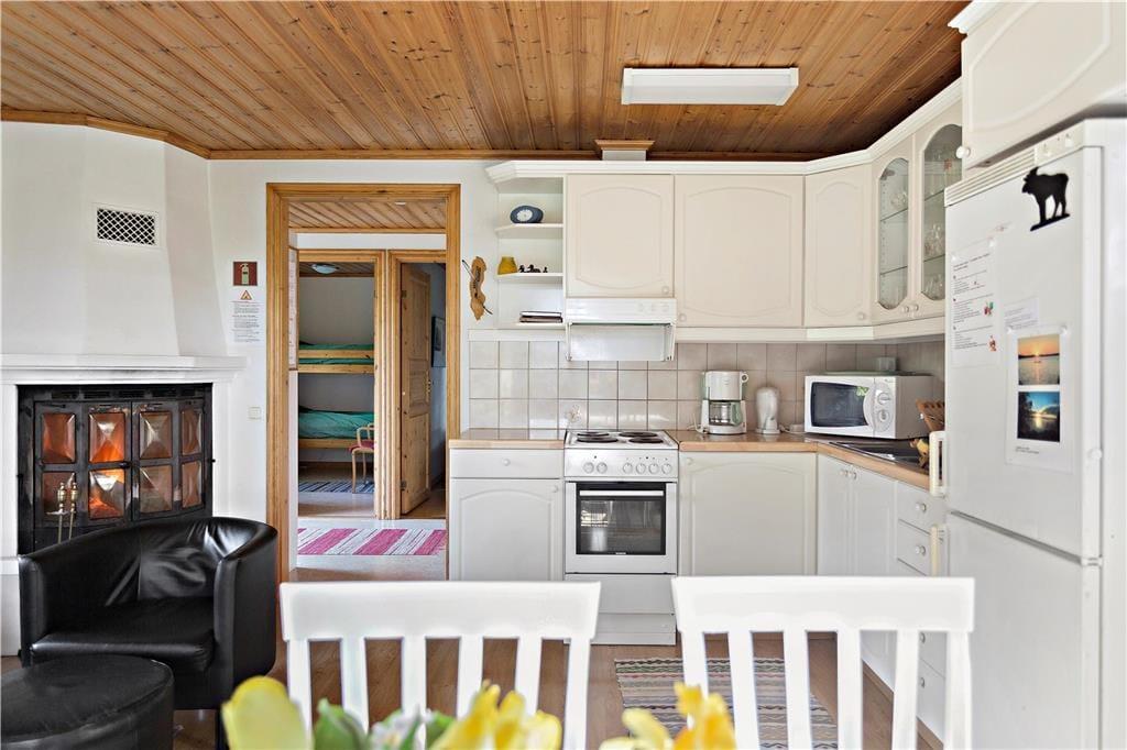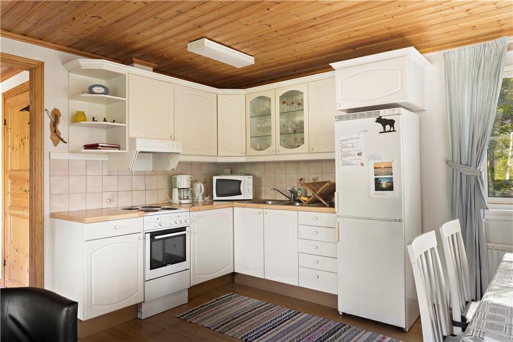 Die baugleichen, komfortablen Ferienhäuser Eken und Boken liegen nur etwa 75 m auseinander und bieten bei jeweils 58 m² Wohnfläche ein geräumiges Wohnzimmer mit großzügigem Küchenteil und zwei Schlafzimmer, eines davon mit Doppelbett, das andere mit einem Etagenbett ausgestattet, sowie ein Duschbad mit WC und Waschmaschine. Die Wohnzimmer sind mit einem Doppelbettsofa für zwei weitere Gäste möbliert und verfügen über Kaminofen, Internetzugang (100/10 Mbit), SAT-TV, DVD sowie Sitz- und Essecke. Die modernen Küchen sind mit Elektroherd, Dunstabzug und Kühl- und Gefrierschrank ausgestattet. Beide Häuser verfügen über fließend kaltes und warmes Wasser aus eigenem Brunnen und können elektrisch bzw. mit dem Kaminofen beheizt werden. Eine kleine, überdachte Veranda, Gartenmöbel und Grill komplettieren die Ausstattung. Ein Kinderbett kann bei Bedarf bereitgestellt werden.