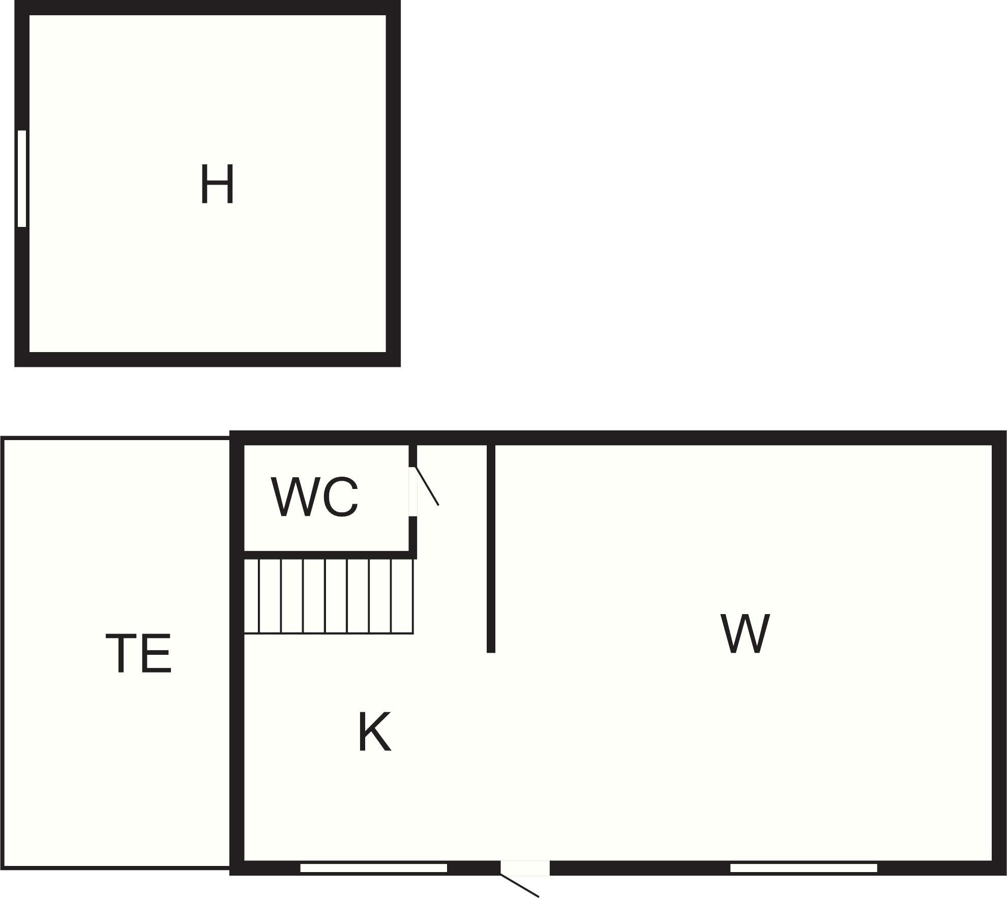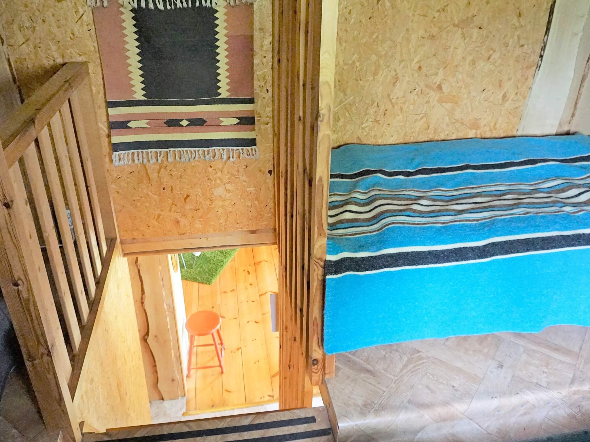Im Erdgeschoss offener Küchen-/Wohnbereich mit Essecke und doppelter Schlafcouch sowie gemütlichem Holzofen. Zudem Hems unter dem Dach mit drei Einzelbetten unter der Dachschräge. Toilette im Häuschen, Dusche nebenan in einem separaten Häuschen etwa 30 m weiter. Naturgrundstüück am Haus mit Rasenfläche und einem kleinen Teich. Sie haben vor Ort Zugang zu einem gemauerten Grill, der auf den Bildern zu sehen ist.