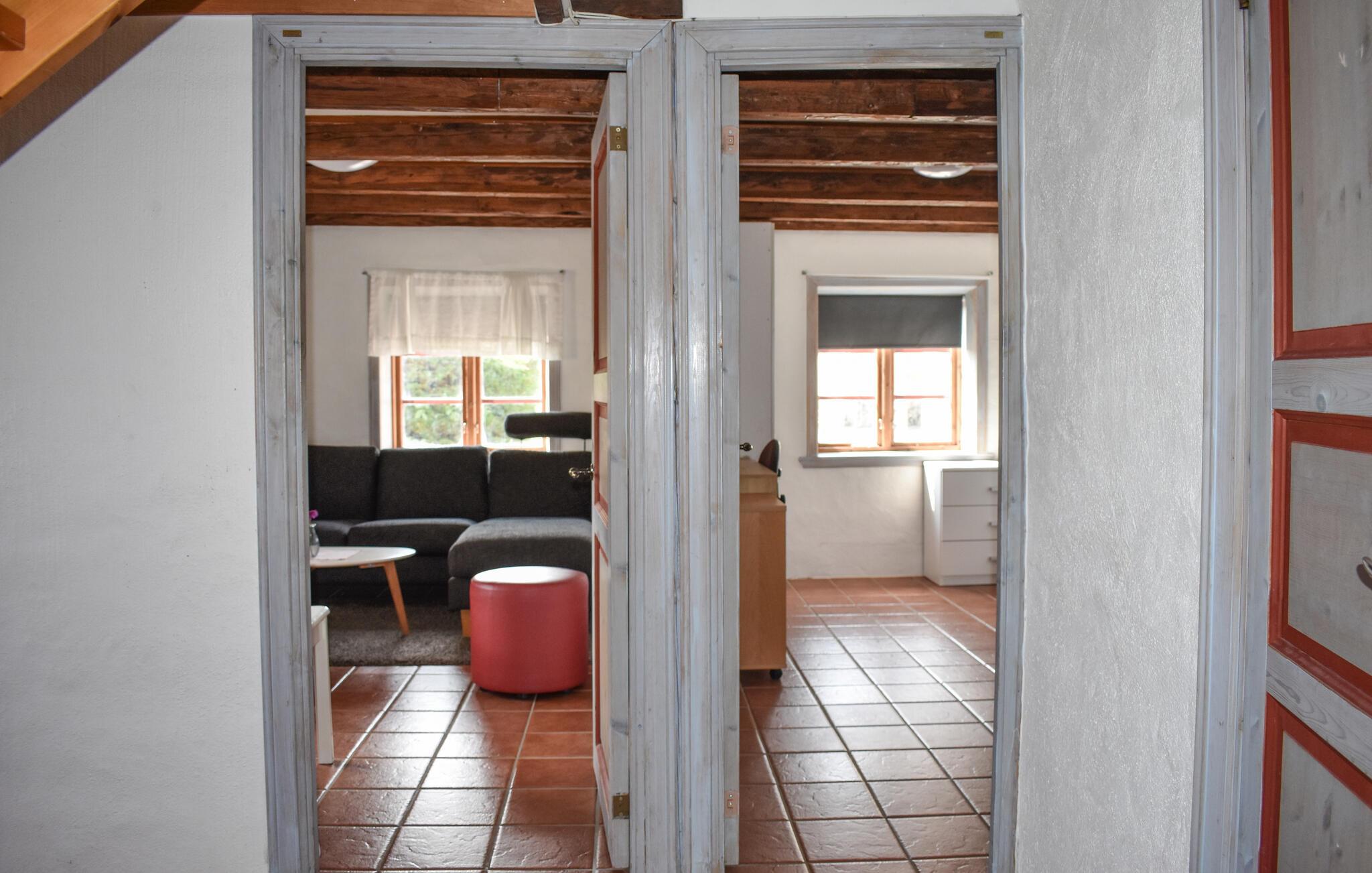 Verbringen Sie einen ruhigen Urlaub inmitten der offenen Landschaften des südschwedischen Österlen. Diese charmante Unterkunft auf einem traditionellen Bauernhof bietet Ihnen die ideale Balance aus Landidylle und Nähe zu zahlreichen Ausflugszielen. Treten Sie ein in ein Haus, das durch sichtbare Holzbalken, warme Fliesenböden und eine gemütliche Möblierung sofort ein Gefühl von Geborgenheit vermittelt. Entspannen Sie sich auf dem bequemen Sofa im Wohnzimmer, lesen Sie ein Buch oder schauen Sie gemeinsam fern. Nehmen Sie Platz am Esstisch in der schönen Wohnküche und servieren Sie hier Ihre Urlaubsgerichte.