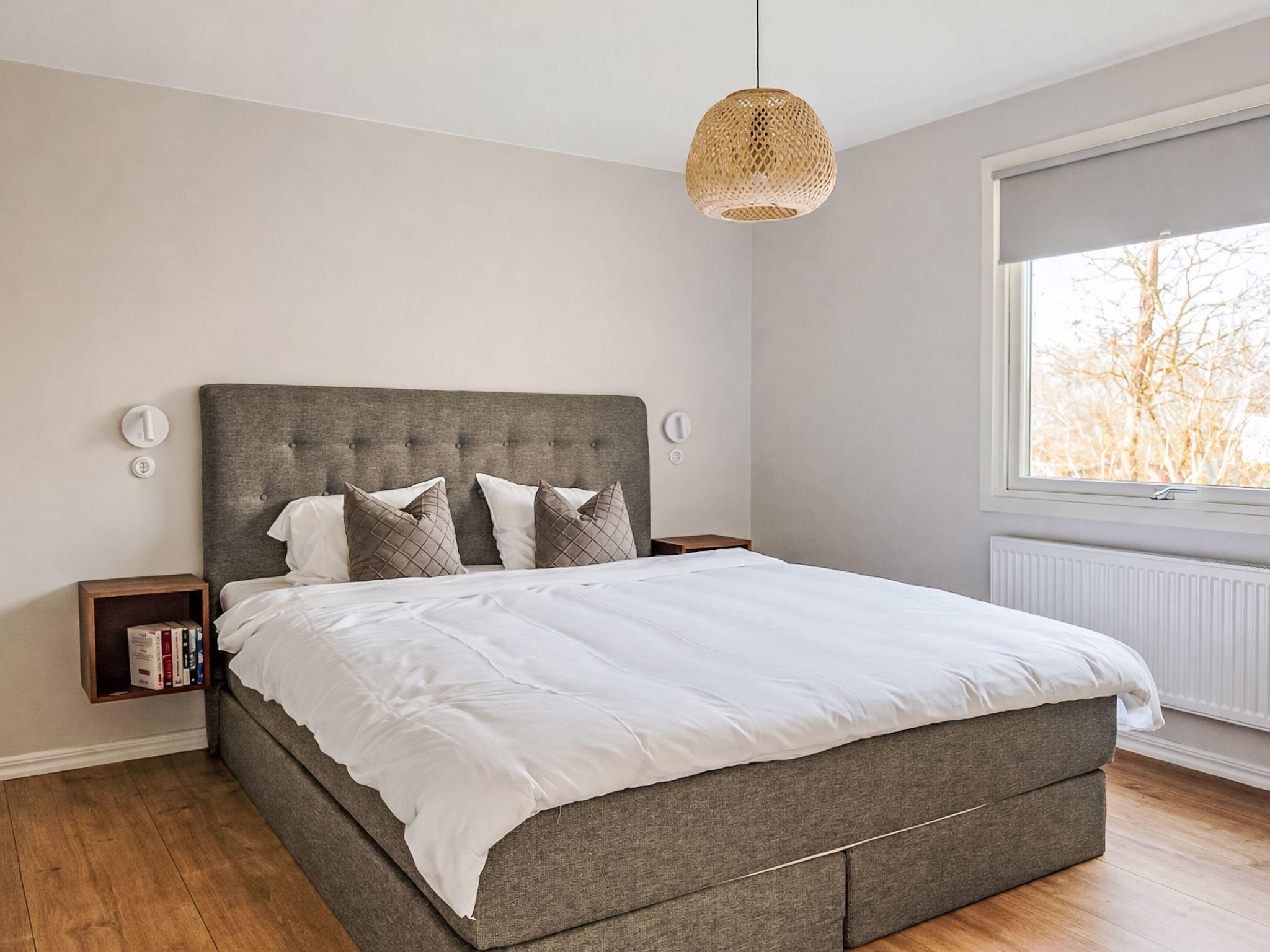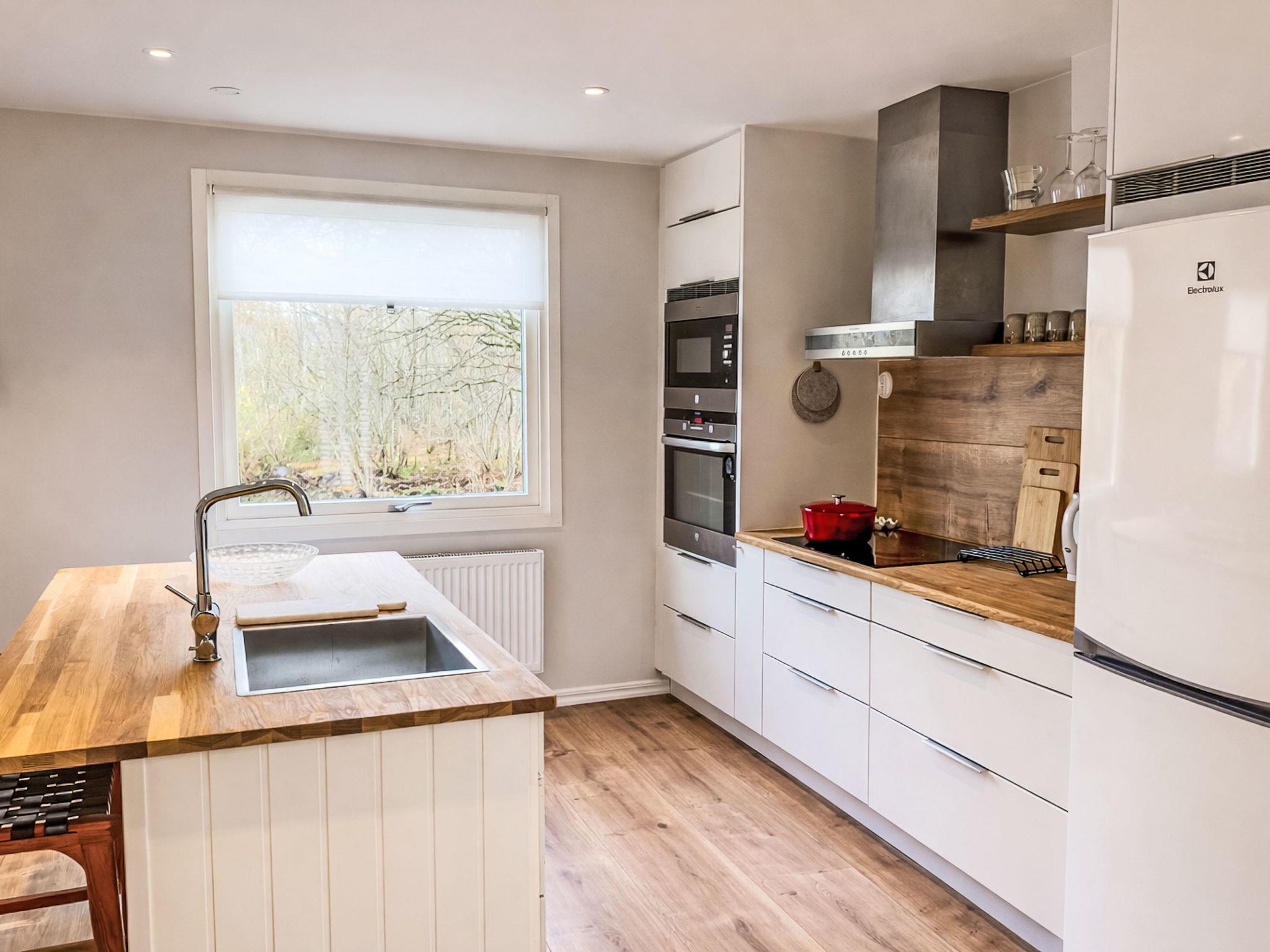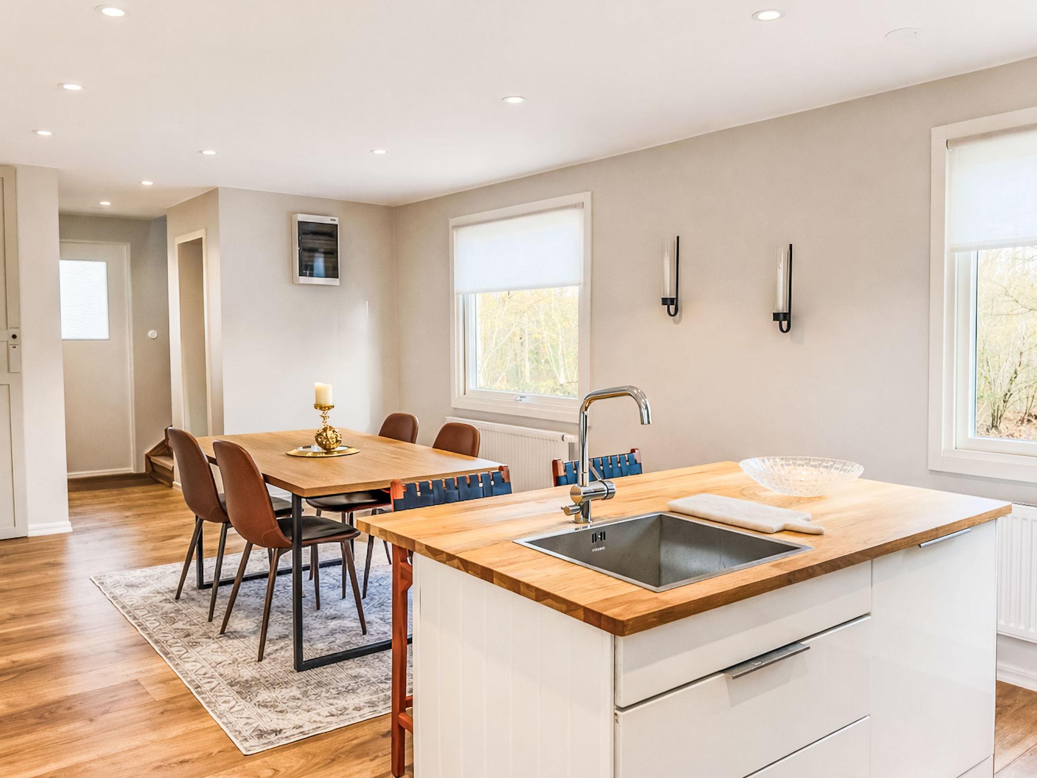 "Ramnås", 5-Zimmer-Haus 100 m2. Gemütlich eingerichtet: Wohnzimmer mit offenem Kamin (nur Deko), TV. Ausgang zur Terrasse, zur Veranda. 1 Zimmer mit 1 Doppelbett. Offene Küche (Backofen, Geschirrspüler, 4 Induktionskochplatten, Toaster, Wasserkocher, Mikrowelle, Tiefkühler, elektrische Kaffeemaschine, Kochinsel) mit Esstisch. Sep. WC. Heizung. Obergeschoss: 1 Zimmer mit 2 Betten (90 cm, Länge 200 cm). 1 Zimmer mit 1 Doppelbett. Dusche/WC. Heizung. Holzdielenboden. Terrassenmöbel, Gartengrill (mobil). Zur Verfügung: Waschmaschine, Bügeleisen, Kinderhochstuhl, Haartrockner. Internet (WLAN). Bitte beachten: Nichtraucher-Haus.