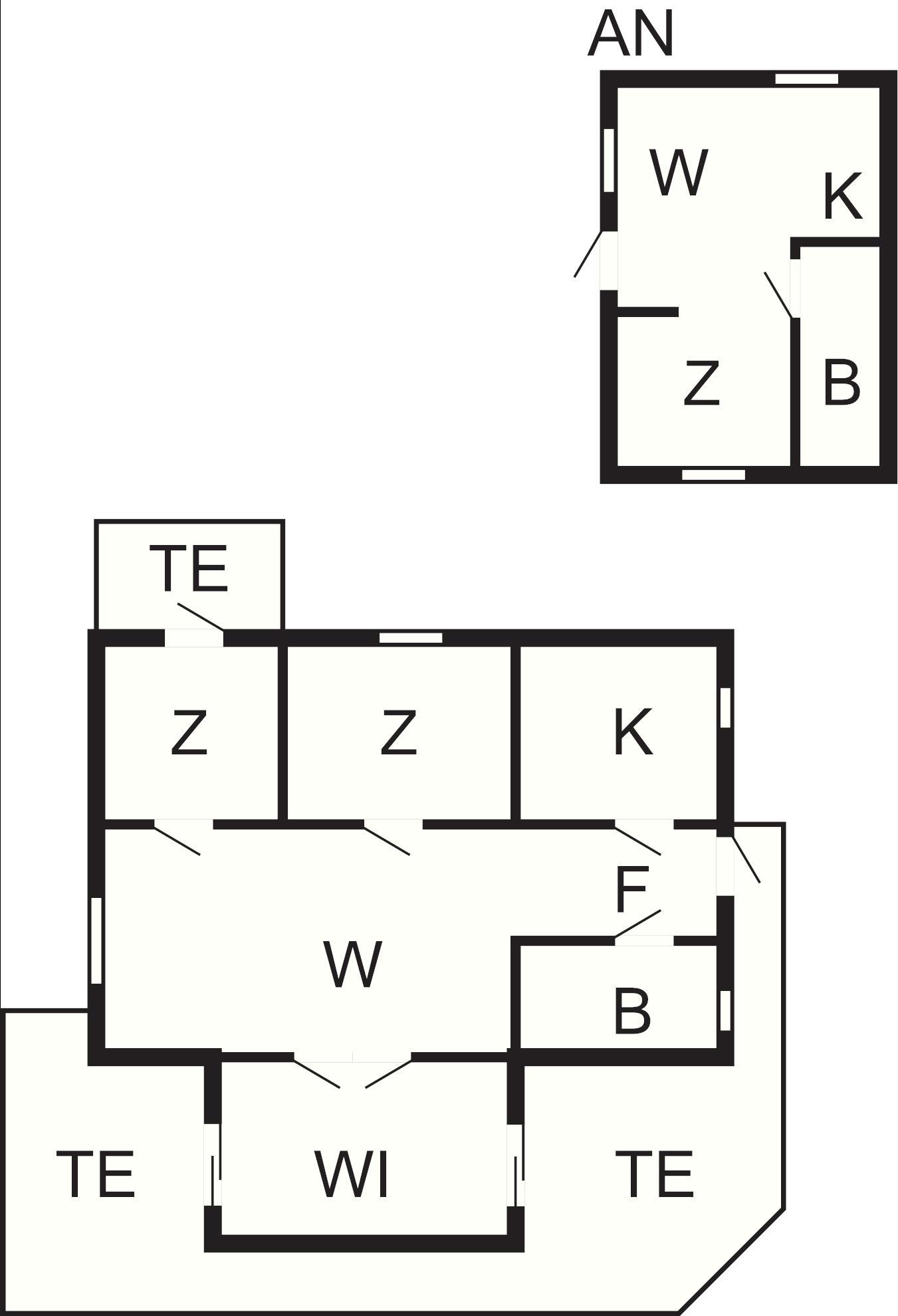 Bad: WC (Eingang v. außen), Waschb., Dusche (Eingang v. außen)