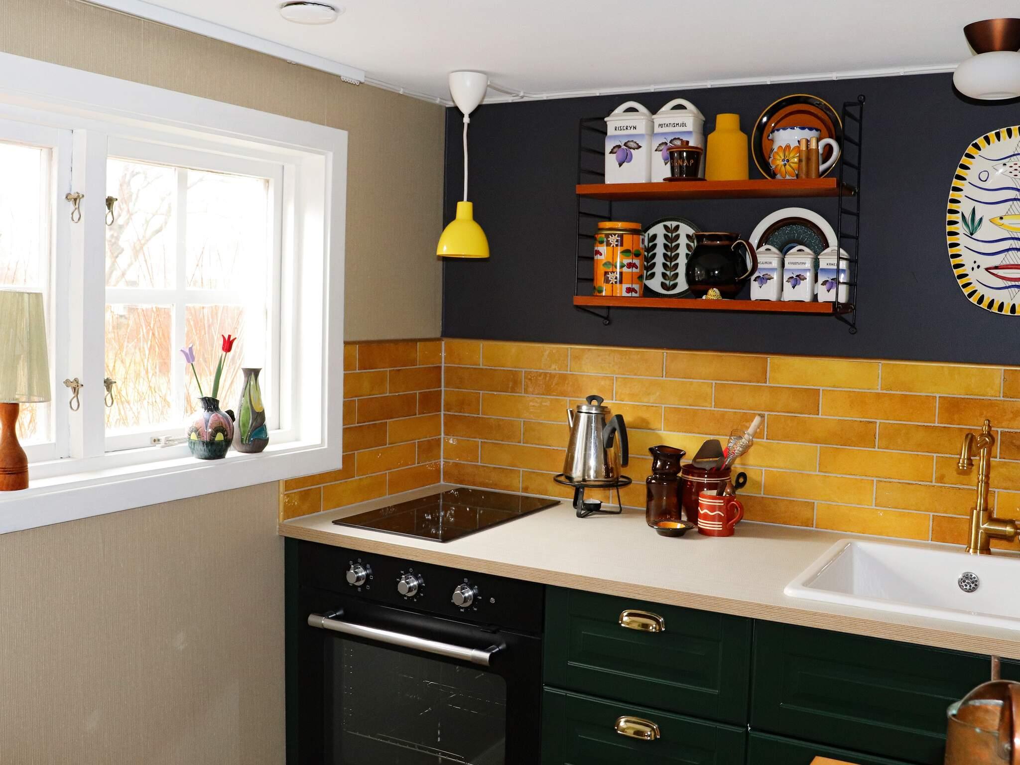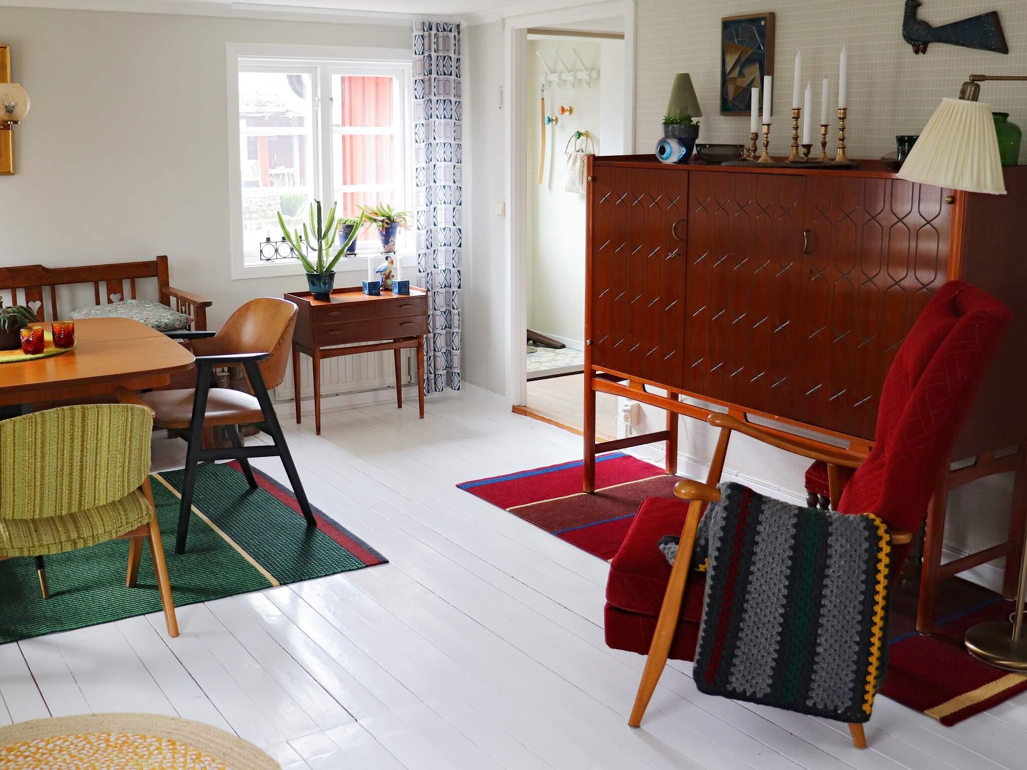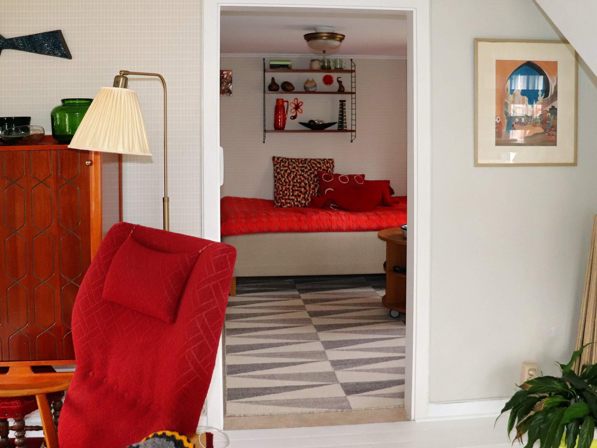 Vom Eingang aus betreten Sie zunächst die schöne kleine Küche mit guter Ausstattung. Das Badezimmer nebenan hat eine Dusche. Das geräumige Wohnzimmer ist geschmackvoll in passendem Retro-Stil eingerichtet und bietet einen Esstisch sowie eine Sitzecke. Weiter hinten liegt das kleinere Schlafzimmer mit einem breiten Einzelbett und einem modernen Fernseher mit Kanalauswahl von Allente. Hier gibt es auch einen Kühl-/Gefrierschrank. Oben im Dachgeschoss des Häuschens findet man ein helles, geräumiges Schlafzimmer mit einem Doppelbett. Auf Anfrage kann ein klappbares Zustellbett angeboten werden.