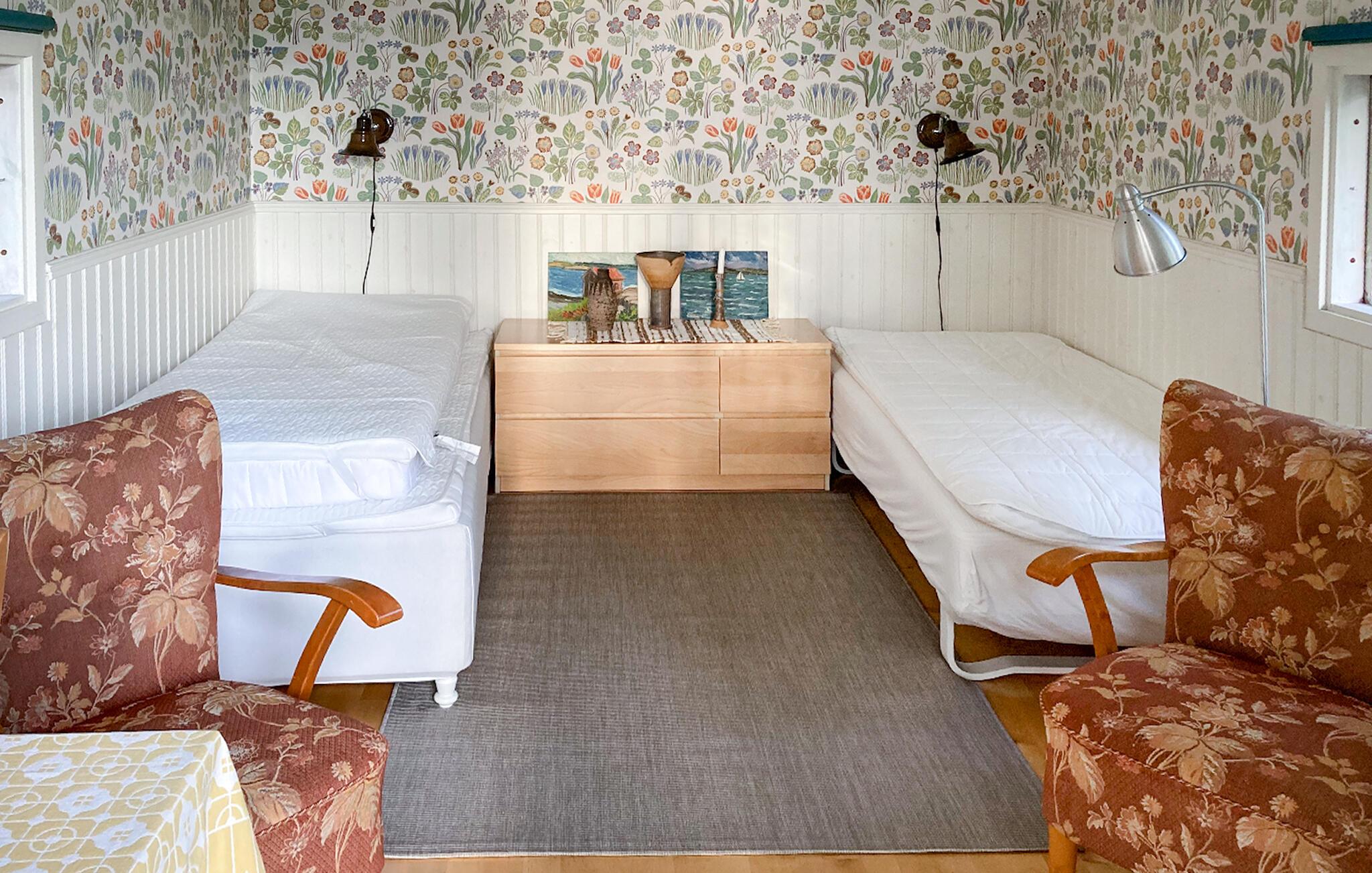 Erleben Sie die Stille, die Ruhe und die wunderschöne Umgebung des Sees Säbysjön und der Region um Tranås. Die praktische und zugleich gemütliche Einrichtung sorgt für ein heimeliges Ambiente, das Sie zum Entspannen einlädt. Fühlen Sie sich umgeben von bunten Tapeten, weichen Farben und klassischer Einrichtung wie zu Hause. In der größeren Hütte gibt es eine gut ausgestattete Küche sowie Tisch und Stühle.