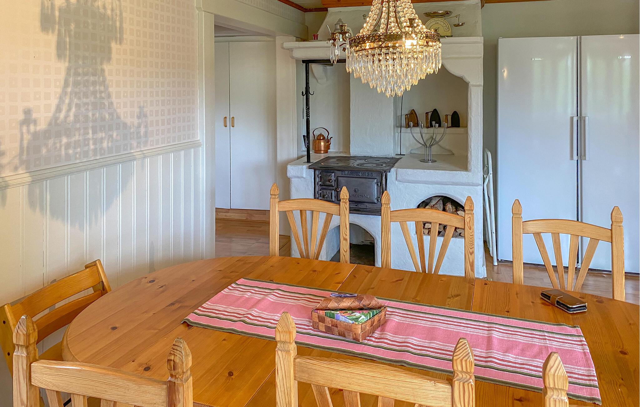 Ihr Morgen fängt mit einem schönen Frühstück auf der einladenden Terrasse Ihres Ferienhauses mit Blick ins Freie. Lassen Sie sich von der ruhigen Atmosphäre verzaubern und nutzen Sie auch die zahlreichen gemütlichen Sitzgelegenheiten im Freien, um die Natur zu genießen. Das Innere des Hauses empfängt Sie mit einem behaglichen Wohnbereich, der mit bequemen Möbeln und einem traditionellen Kaminofen ausgestattet ist. Machen Sie es sich auf dem komfortablen Sofa gemütlich und verbringen Sie entspannte Stunden bei einem guten Buch oder mit Gesellschaftsspielen. Die geschmackvolle Dekoration und die Kronleuchter verleihen dem Raum eine besonders interessante Note. Die großzügige Küche lädt zu gemeinsamen Kocherlebnissen ein.