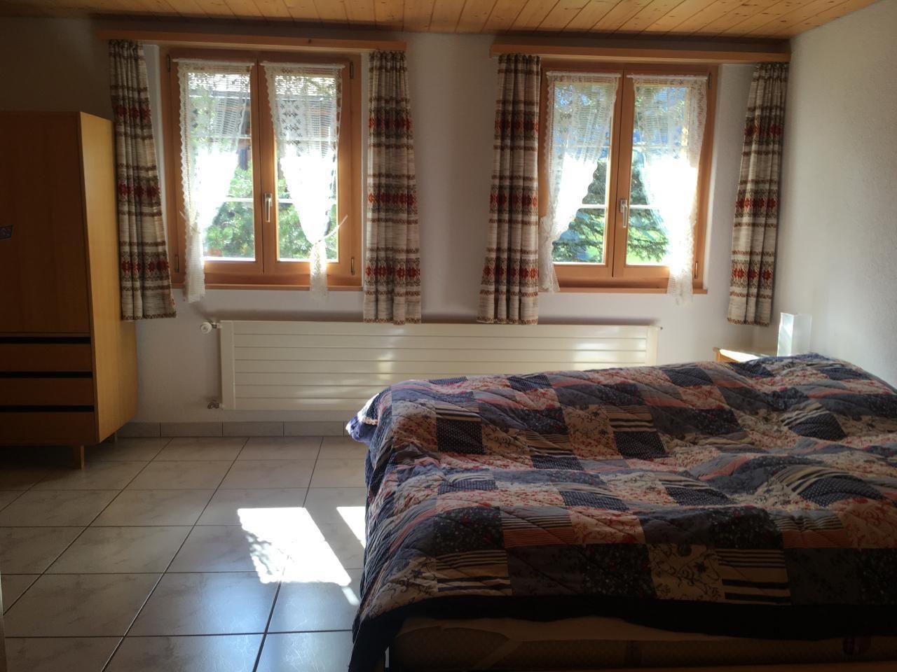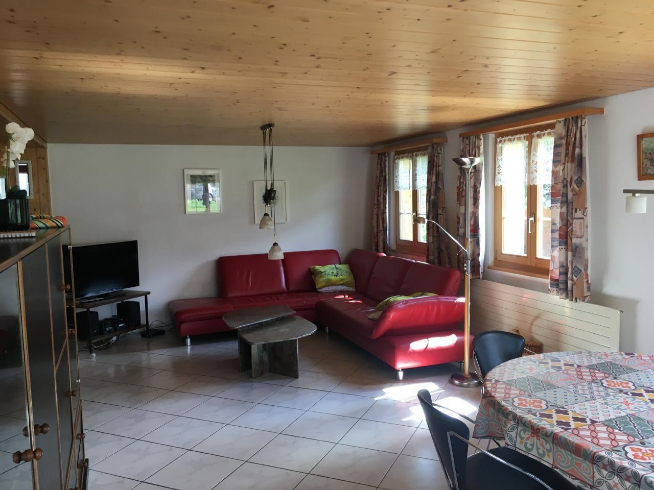 3.5-Zimmerwohnung im Untergeschosse eines Mehrfamilienhauses. Wohnfläche: 93m2. Bad/Dusche/WC. Schlafzimmer mit 2 Einzelbetten, Schlafzimmer mit 3 Einzelbetten, ein Kinderbett kann nach Wunsch aufgestellt werden. Die Bettwäsche ist vorhanden. Wohn-Essküche mit Backofen, grossem Kühlschrank, Abwaschmaschine und umfangreichem Kochgeschirr; Küchentücher sind vorhanden. Im grossen Wohnzimmer mit Kabel-TV, WLAN und Radio befindet sich eine gemütliche Sitzecke und ein Tisch mit 6 Stühlen. Direkt vom Wohnzimmer kommt man auf eine Terrasse mit Sitzgelegenheit und Cheminée. Ein grosser Sonnenschirm kann nach Bedarf aufgestellt werden.