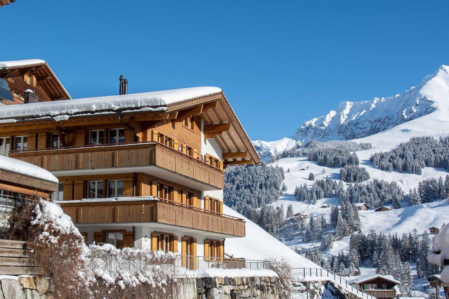 Neue, stilvoll eingerichtete 4-Sterne Ferienwohnung in einem Dreifamilienhaus nahe der Bergbahnen. 2 Schlafzimmer mit grossen Schränken bieten 4 Personen Platz. Grosser heller Wohnraum mit Sitzgruppe, Esstisch für 6 Personen, Internet, TV/DVD und Radio. Von hier gelangen Sie auf die Terrasse mit herrlichem Ausblick auf die Berge, den Wasserfall und die Ski-Weltcuppiste von Adelboden. Die moderne Küche ist mit allem ausgerüstet was Sie brauchen: grosse Kochstelle, Backofen, Kühlschrank, Geschirrspüler, usw. Im Badezimmer finden Sie ein Bad mit Duschvorrichtung, WC und Lavabo. Ski-/Abstellraum und Parkplatz gehören ebenfalls zur Wohnung. Die Ski-Bus Haltestelle ist 150 Meter vom Haus entfernt. 500 Meter entfernt befindet sich die Dorfstrasse mit den verschiedensten Restaurants und Einkaufsmöglichkeiten. Zu Fuss erreichen Sie in 5 Minuten die Bergbahn Adelboden – Sillerenbühl.