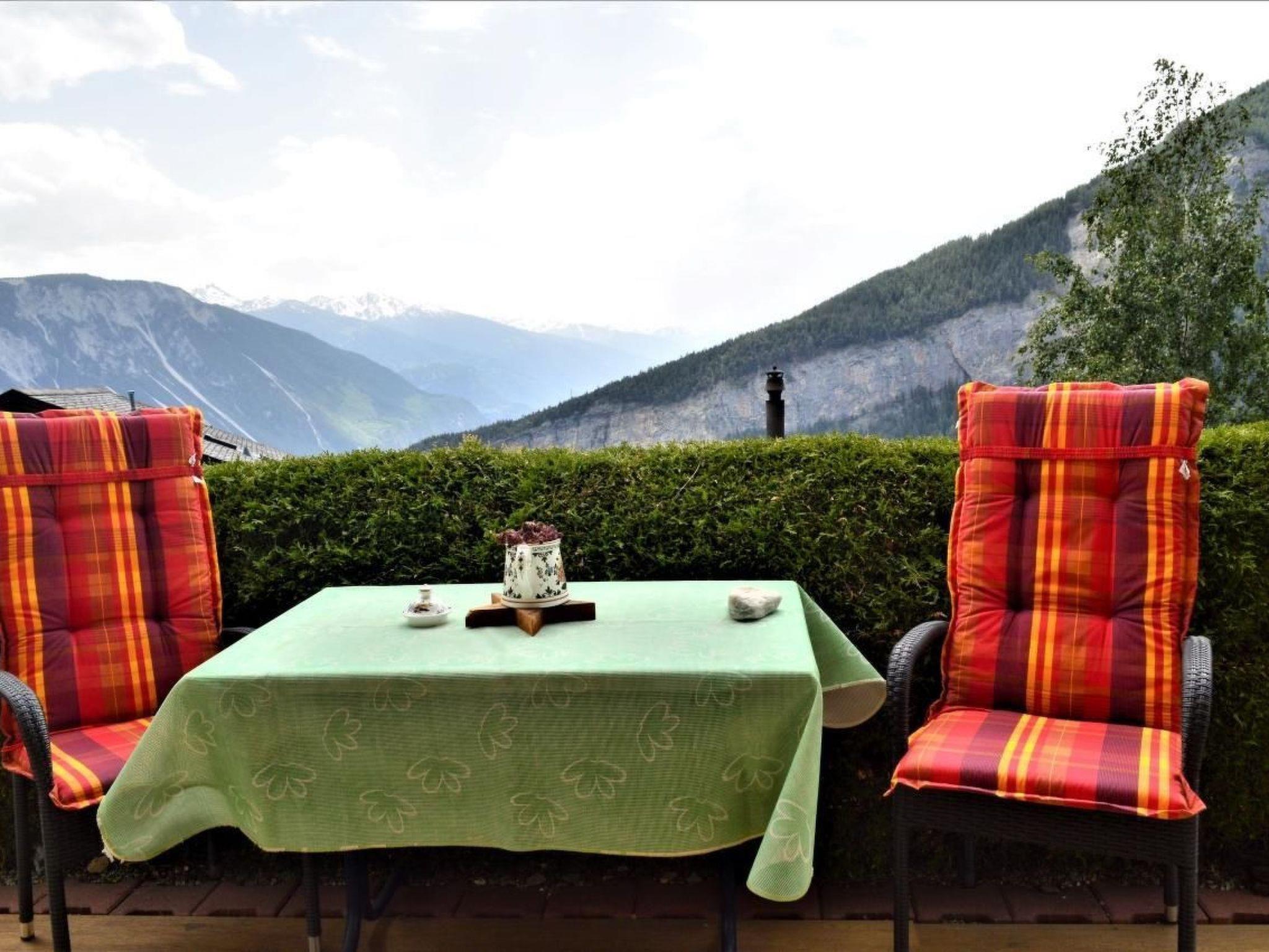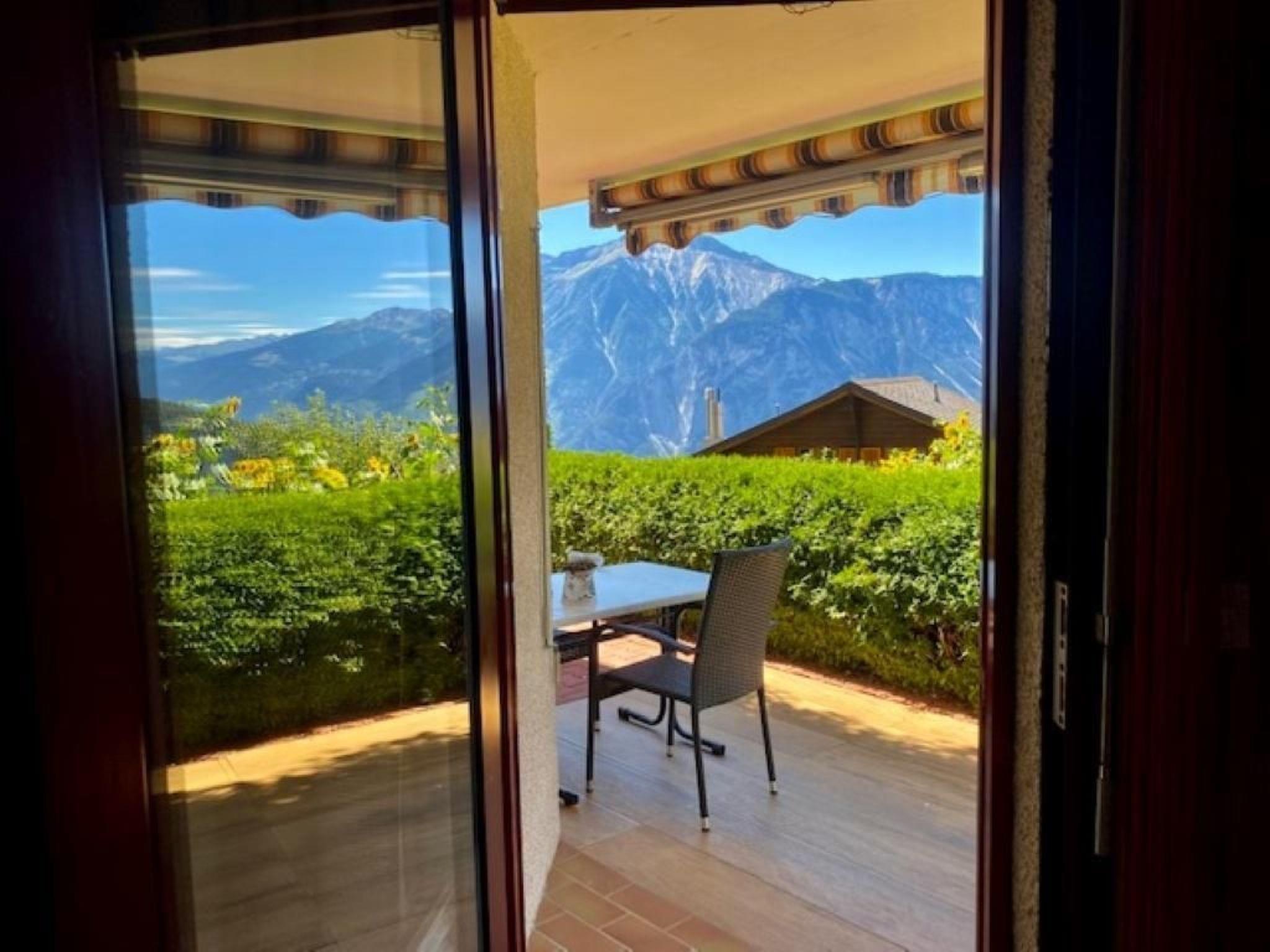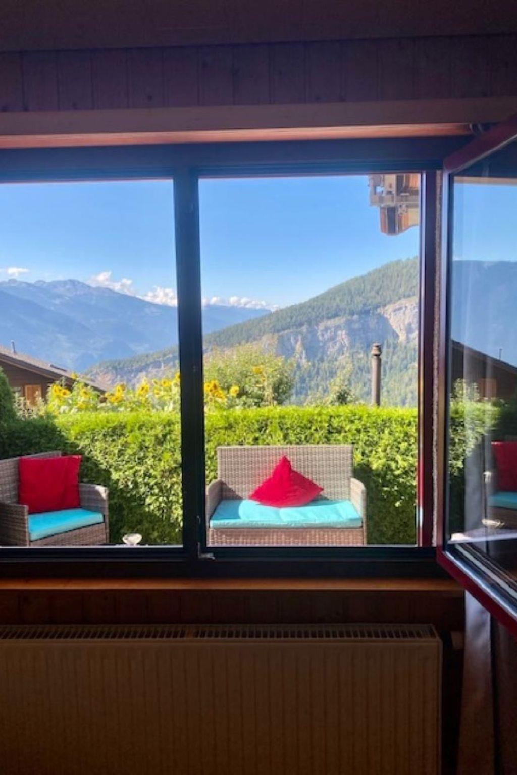 Der Außenbereich des Chalets wird Sie begeistern. Umgeben von einem großen Garten mit Rasenfläche, bietet das Chalet einen ruhigen Platz direkt vor dem Wohnzimmer, von wo aus Sie die herrliche Abendsonne bis zum letzten Strahl genießen können. Die Terrasse gewährt einen freien Blick hinunter ins Rhonetal und über die imposanten Gipfel der Walliser Alpen, ein Panorama, das seinesgleichen sucht.