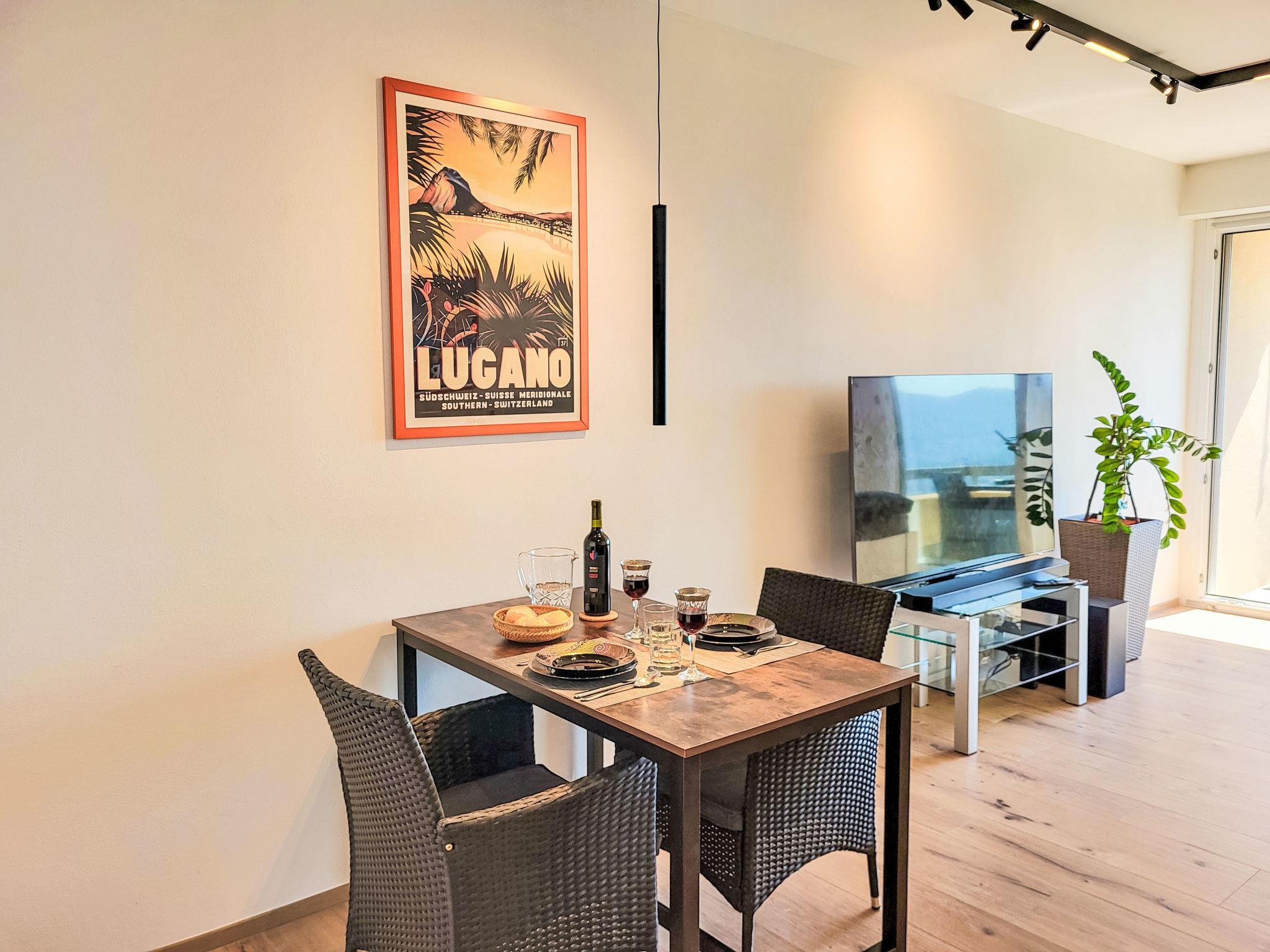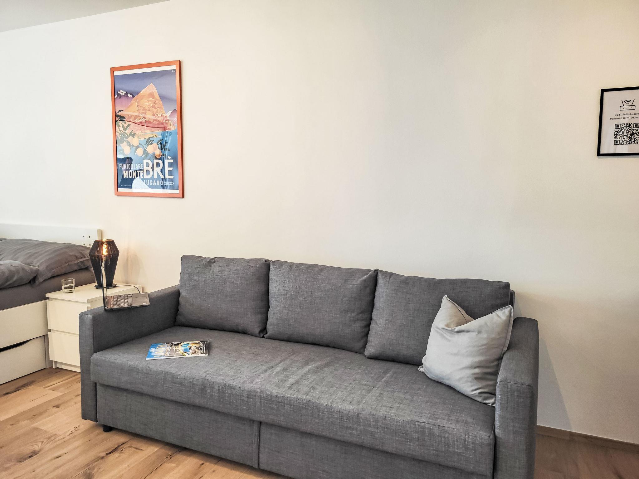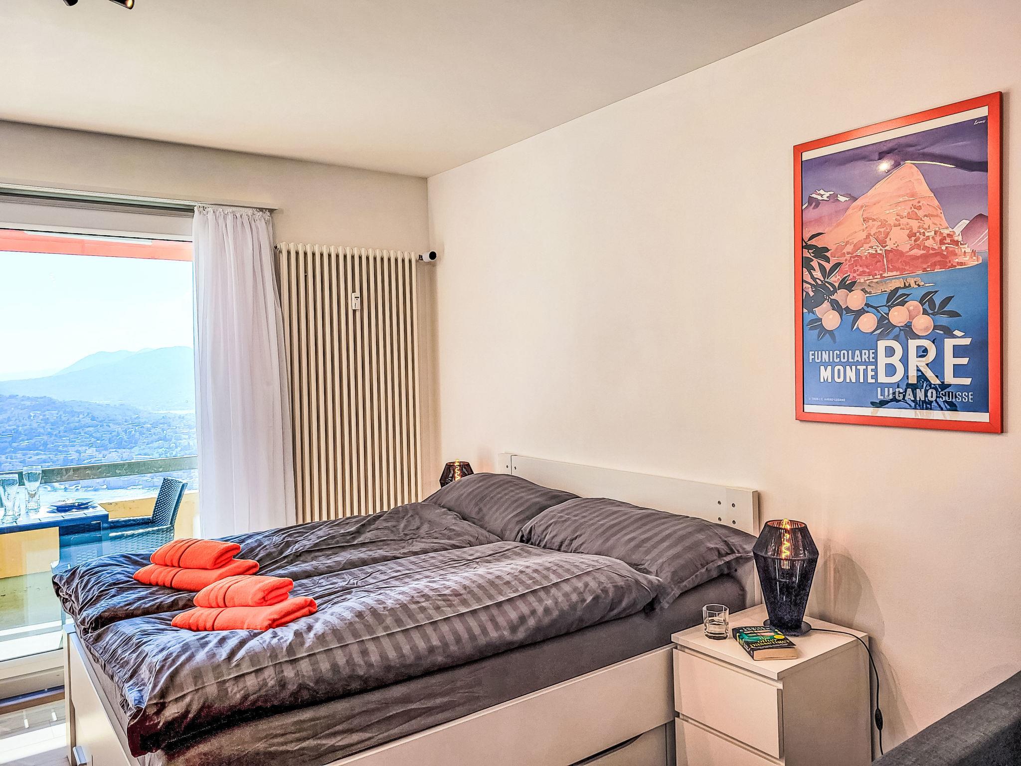 "Residenza Monte Brè - Apt. 203 Haus2", 1-Zimmer-Wohnung 28 m2 im 2. Stock, Südwestlage. Vollständig renoviert im Jahre 2025, komfortabel und modern eingerichtet: offenes Wohn-/Schlafzimmer mit 1 Diwanbett (140 cm, Länge 200 cm), 1 Doppelbett (160 cm, Länge 200 cm). Offene Küche im Eingang (Backofen, Geschirrspüler, 4 Induktionskochplatten, Toaster, Wasserkocher, Mikrowelle, elektrische Kaffeemaschine, Kapseln für die Kaffeemaschine (Nespresso) extra). Dusche/WC. Heizung. Kleiner Balkon 4 m2, Südwestlage. Balkonmöbel. Herrliche Panoramasicht auf den See, die Berge, die Landschaft und die Stadt. Zur Verfügung: Kinderhochstuhl, Babybett bis 2 Jahre (extra), Haartrockner. Internet (WLAN, gratis, Bandbreite: 1'000 Mbit/s). Parkplatz (extra) beim Haus. Bitte beachten: Nichtraucher-Unterkunft. NL-00012843